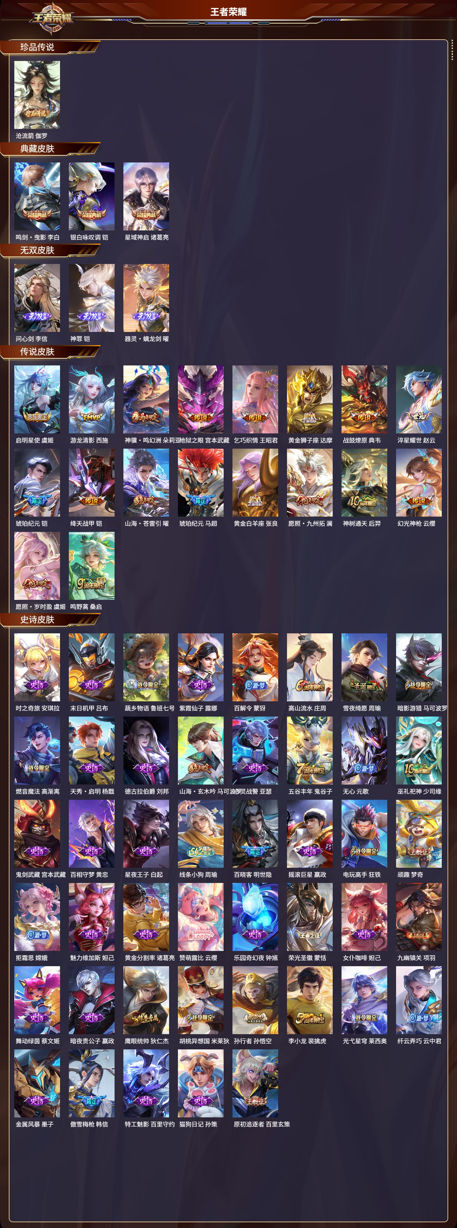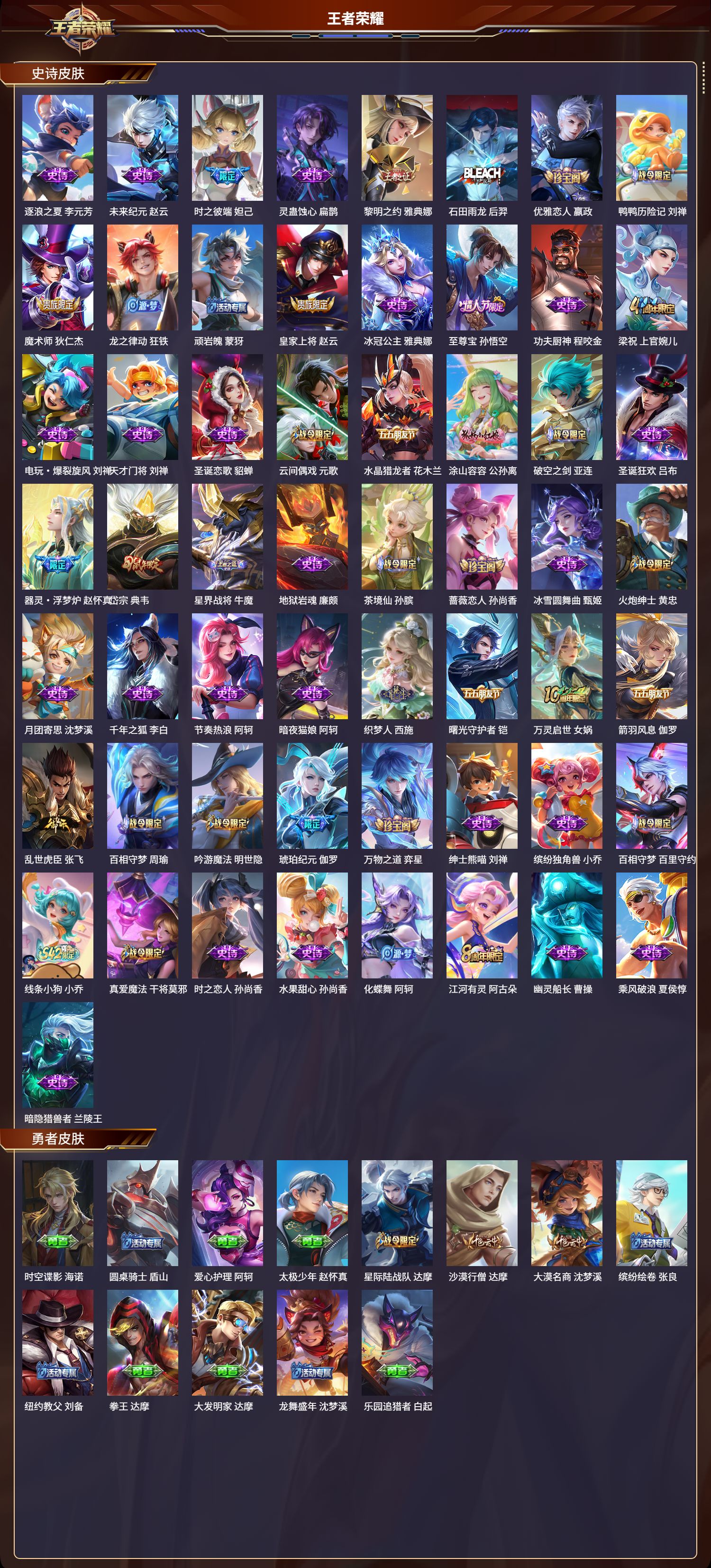 【102,史诗皮肤】时之奇旅,安琪拉,末日机甲,吕布,蔬乡物语,鲁班七号,紫霞仙子,露娜,百解令,蒙犽,高山流水,庄周,雪夜绮愿,周瑜,暗影游猎,马可波罗,燃音魔法,高渐离,天秀·启明,杨戬,德古拉伯爵,刘邦,山海·玄木吟,马可波罗,心灵战警,亚瑟,五谷丰年,鬼谷子,无心,元歌,巫礼祀神,少司缘,鬼剑武藏,宫本武藏,百相守梦,黄忠,星夜王子,白起,线条小狗,周瑜,百晓客,明世隐,摇滚巨星,嬴政,电玩高手,狂铁,顽趣,梦奇,拒霜思,嫦娥,魅力维加斯,妲己,黄金分割率,诸葛亮,赞萌露比,云缨,乐园奇幻夜,钟馗,荣光圣徽,蒙恬,女仆咖啡,妲己,九幽镇关,项羽,舞动绿茵,蔡文姬,暗夜贵公子,嬴政,鹰眼统帅,狄仁杰,胡桃异想国,米莱狄,孙行者,孙悟空,李小龙,裴擒虎,光弋星穹,莱西奥,纤云弄巧,云中君,金属风暴,墨子,傲雪梅枪,韩信,特工魅影,百里守约,猫狗日记,孙策,原初追逐者,百里玄策,逐浪之夏,李元芳,未来纪元,赵云,时之彼端,妲己,灵蛊蚀心,扁鹊,黎明之约,雅典娜,石田雨龙,后羿,优雅恋人,嬴政,鸭鸭历险记,刘禅,魔术师,狄仁杰,龙之律动,狂铁,顽岩魄,蒙犽,皇家上将,赵云,冰冠公主,雅典娜,至尊宝,孙悟空,功夫厨神,程咬金,梁祝,上官婉儿,电玩·爆裂旋风,刘禅,天才门将,刘禅,圣诞恋歌,貂蝉,云间偶戏,元歌,水晶猎龙者,花木兰,涂山容容,公孙离,破空之剑,亚连,圣诞狂欢,吕布,器灵·浮梦炉,赵怀真,岱宗,典韦,星界战将,牛魔,地狱岩魂,廉颇,茶境仙,孙膑,蔷薇恋人,孙尚香,冰雪圆舞曲,甄姬,火炮绅士,黄忠,月团寄思,沈梦溪,千年之狐,李白,节奏热浪,阿轲,暗夜猫娘,阿轲,织梦人,西施,曙光守护者,铠,万灵启世,女娲,箭羽风息,伽罗,乱世虎臣,张飞,百相守梦,周瑜,吟游魔法,明世隐,琥珀纪元,伽罗,万物之道,弈星,绅士熊喵,刘禅,缤纷独角兽,小乔,百相守梦,百里守约,线条小狗,小乔,真爱魔法,干将莫邪,时之恋人,孙尚香,水果甜心,孙尚香,化蝶舞,阿轲,江河有灵,阿古朵,幽灵船长,曹操,乘风破浪,夏侯惇,暗隐猎兽者,兰陵王,