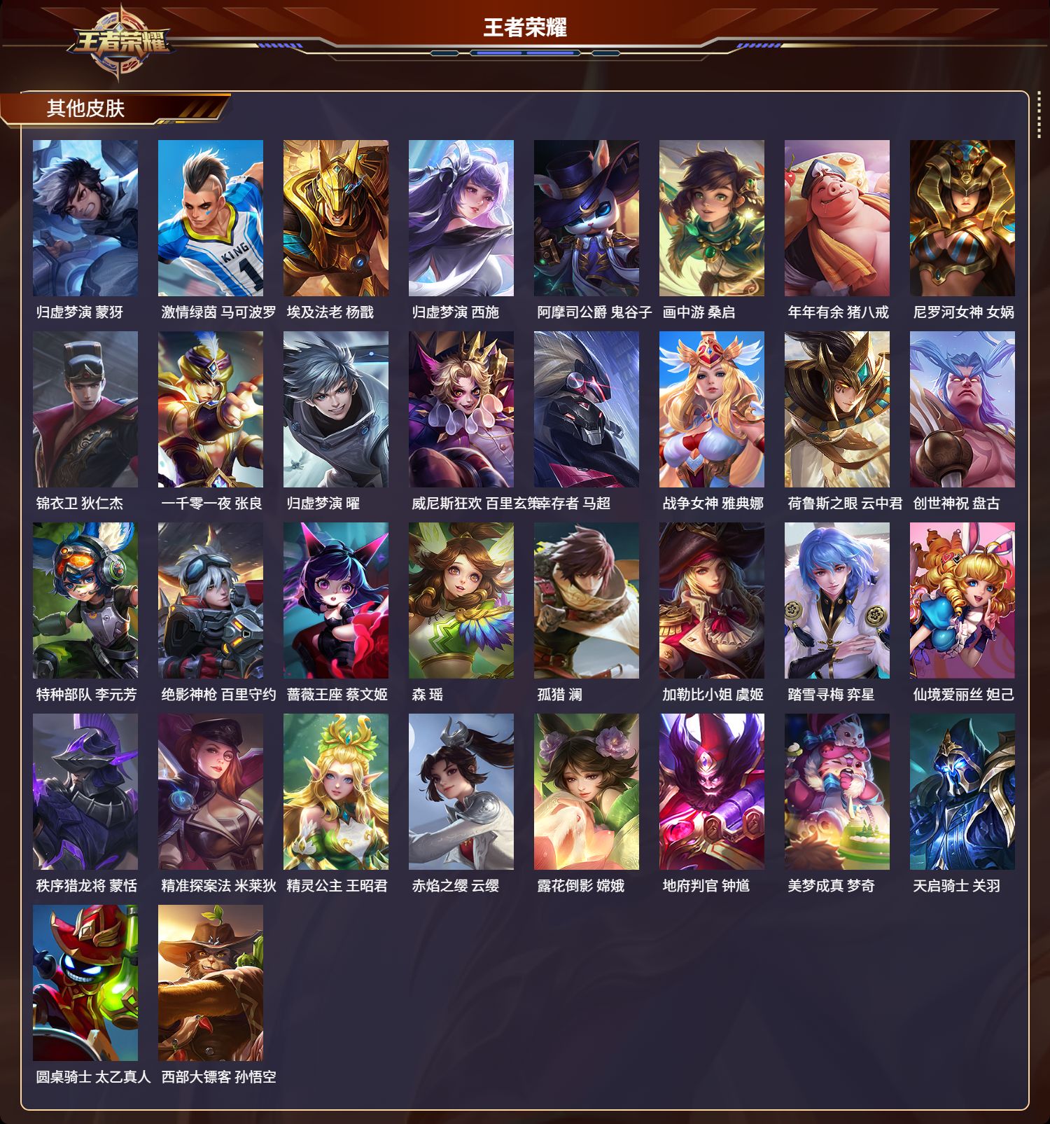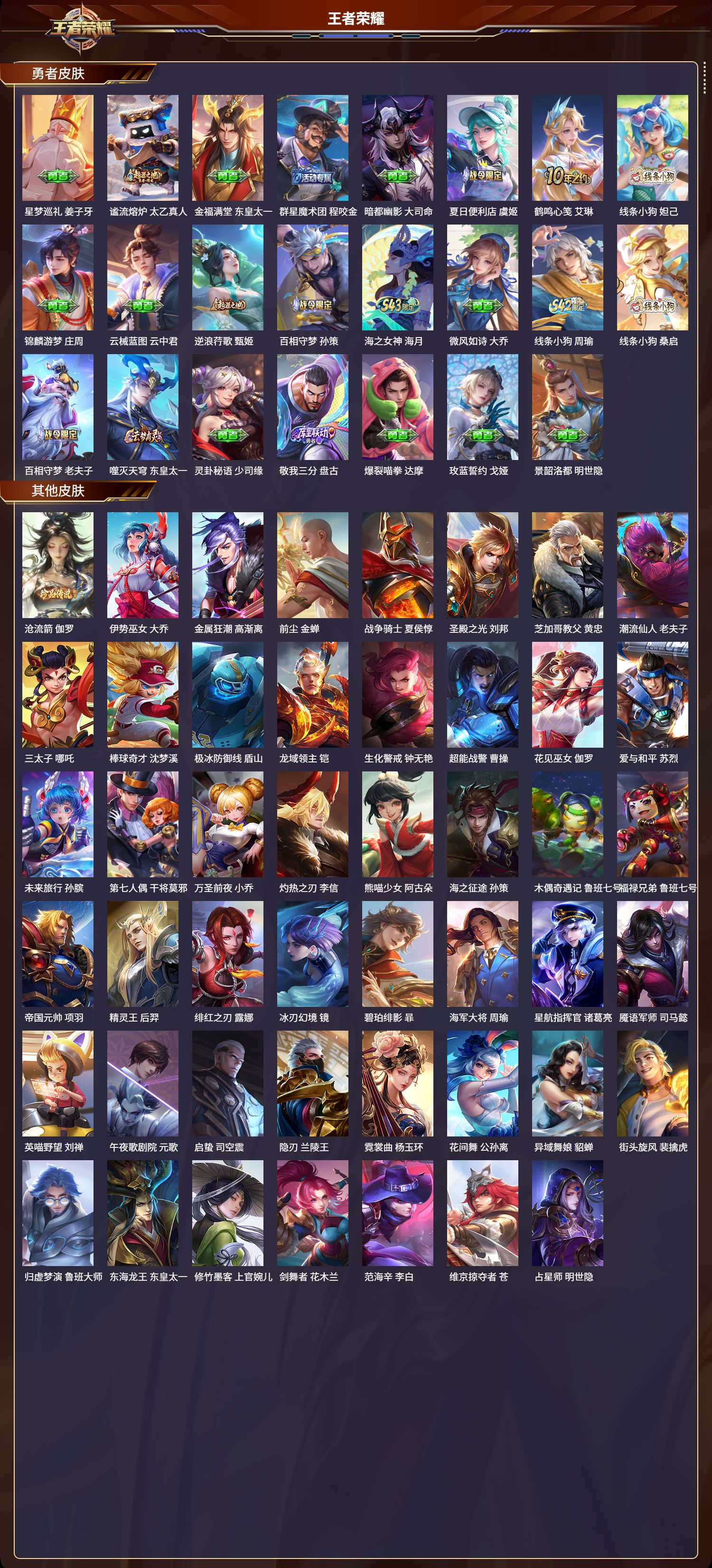 【81,其他皮肤】沧流箭,伽罗,伊势巫女,大乔,金属狂潮,高渐离,前尘,金蝉,战争骑士,夏侯惇,圣殿之光,刘邦,芝加哥教父,黄忠,潮流仙人,老夫子,三太子,哪吒,棒球奇才,沈梦溪,极冰防御线,盾山,龙域领主,铠,生化警戒,钟无艳,超能战警,曹操,花见巫女,伽罗,爱与和平,苏烈,未来旅行,孙膑,第七人偶,干将莫邪,万圣前夜,小乔,灼热之刃,李信,熊喵少女,阿古朵,海之征途,孙策,木偶奇遇记,鲁班七号,福禄兄弟,鲁班七号,帝国元帅,项羽,精灵王,后羿,绯红之刃,露娜,冰刃幻境,镜,碧珀绯影,暃,海军大将,周瑜,星航指挥官,诸葛亮,魇语军师,司马懿,英喵野望,刘禅,午夜歌剧院,元歌,启蛰,司空震,隐刃,兰陵王,霓裳曲,杨玉环,花间舞,公孙离,异域舞娘,貂蝉,街头旋风,裴擒虎,归虚梦演,鲁班大师,东海龙王,东皇太一,修竹墨客,上官婉儿,剑舞者,花木兰,范海辛,李白,维京掠夺者,苍,占星师,明世隐,归虚梦演,蒙犽,激情绿茵,马可波罗,埃及法老,杨戬,归虚梦演,西施,阿摩司公爵,鬼谷子,画中游,桑启,年年有余,猪八戒,尼罗河女神,女娲,锦衣卫,狄仁杰,一千零一夜,张良,归虚梦演,曜,威尼斯狂欢,百里玄策,幸存者,马超,战争女神,雅典娜,荷鲁斯之眼,云中君,创世神祝,盘古,特种部队,李元芳,绝影神枪,百里守约,蔷薇王座,蔡文姬,森,瑶,孤猎,澜,加勒比小姐,虞姬,踏雪寻梅,弈星,仙境爱丽丝,妲己,秩序猎龙将,蒙恬,精准探案法,米莱狄,精灵公主,王昭君,赤焰之缨,云缨,露花倒影,嫦娥,地府判官,钟馗,美梦成真,梦奇,天启骑士,关羽,圆桌骑士,太乙真人,西部大镖客,孙悟空,