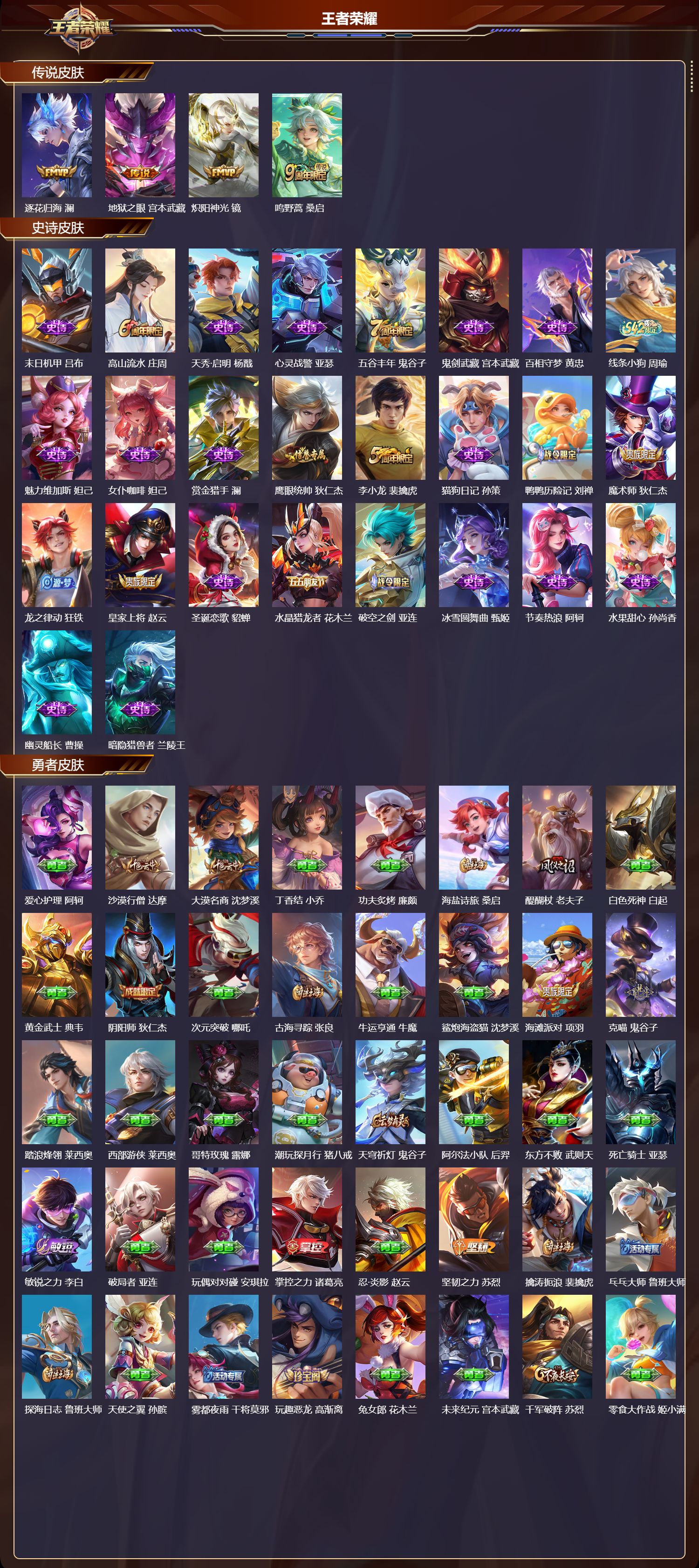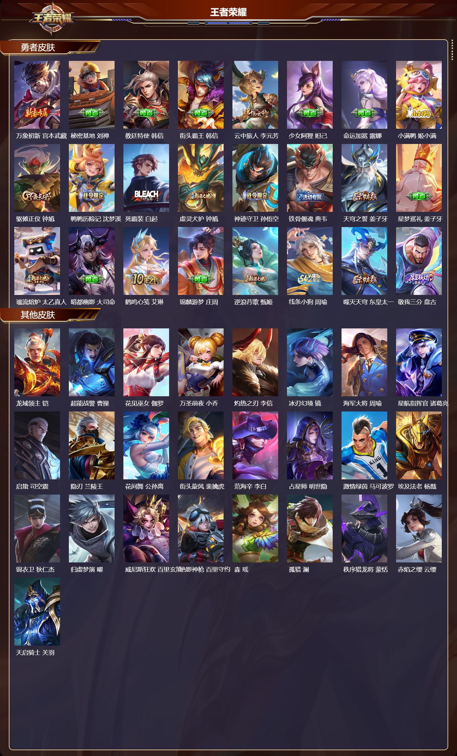 【64,勇者皮肤】爱心护理,阿轲,沙漠行僧,达摩,大漠名商,沈梦溪,丁香结,小乔,功夫炙烤,廉颇,海盐诗旅,桑启,醍醐杖,老夫子,白色死神,白起,黄金武士,典韦,阴阳师,狄仁杰,次元突破,哪吒,古海寻踪,张良,牛运亨通,牛魔,鲨炮海盗猫,沈梦溪,海滩派对,项羽,克喵,鬼谷子,踏浪烽翎,莱西奥,西部游侠,莱西奥,哥特玫瑰,露娜,潮玩探月行,猪八戒,天穹祈灯,鬼谷子,阿尔法小队,后羿,东方不败,武则天,死亡骑士,亚瑟,敏锐之力,李白,破局者,亚连,玩偶对对碰,安琪拉,掌控之力,诸葛亮,忍·炎影,赵云,坚韧之力,苏烈,擒涛扼浪,裴擒虎,乓乓大师,鲁班大师,探海日志,鲁班大师,天使之翼,孙膑,雾都夜雨,干将莫邪,玩趣恶龙,高渐离,兔女郎,花木兰,未来纪元,宫本武藏,千军破阵,苏烈,零食大作战,姬小满,万象初新,宫本武藏,秘密基地,刘禅,教廷特使,韩信,街头霸王,韩信,云中旅人,李元芳,少女阿狸,妲己,命运加冕,露娜,小满鸭,姬小满,驱傩正仪,钟馗,鸭鸭历险记,沈梦溪,死霸装,白起,虚灵犬护,钟馗,神迹守卫,孙悟空,铁骨偃魂,典韦,天穹之誓,姜子牙,星梦巡礼,姜子牙,谧流熔炉,太乙真人,暗都幽影,大司命,鹤鸣心笺,艾琳,锦麟游梦,庄周,逆浪荇歌,甄姬,线条小狗,周瑜,噬灭天穹,东皇太一,敬我三分,盘古,