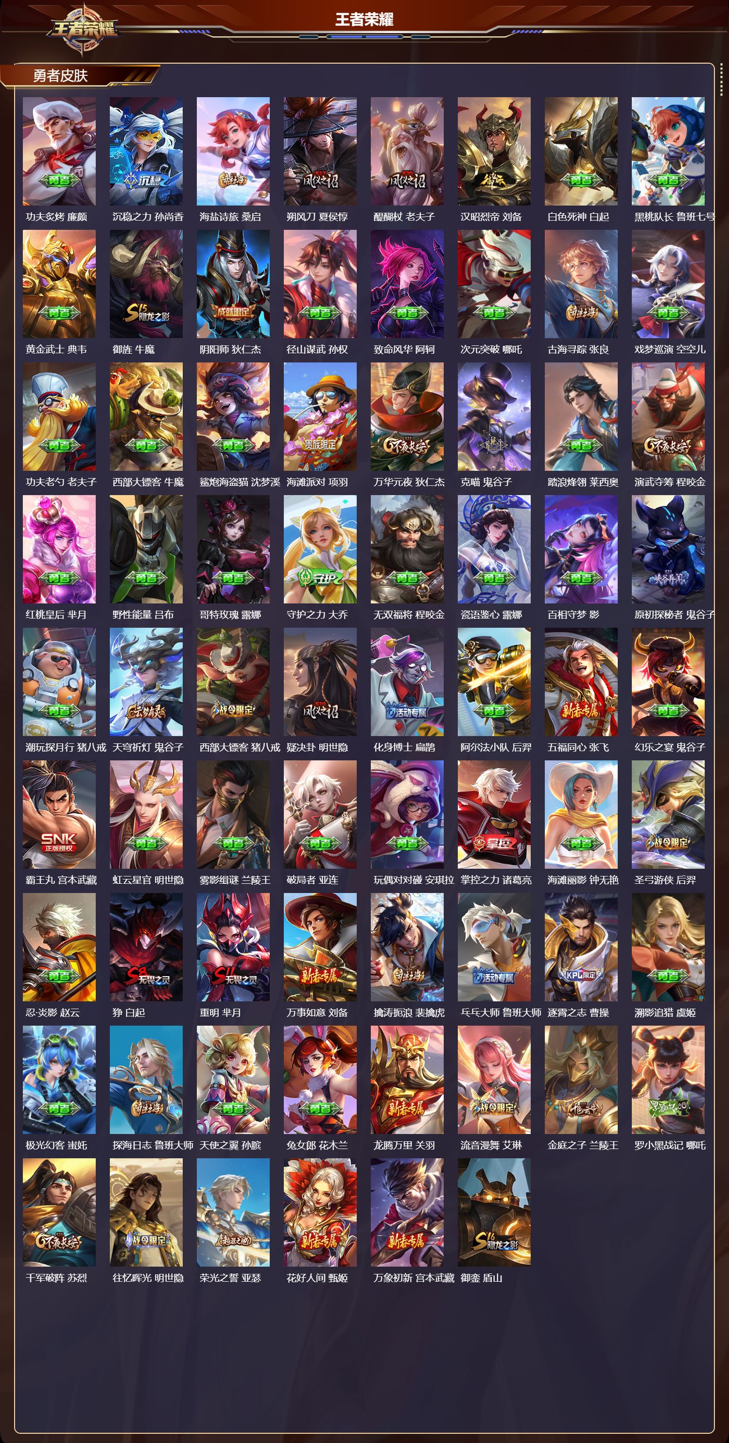 【114,勇者皮肤】圆桌骑士,盾山,烛龙,曹操,爱心护理,阿轲,沙漠行僧,达摩,大漠名商,沈梦溪,缤纷绘卷,张良,纽约教父,刘备,拳王,达摩,大发明家,达摩,丁香结,小乔,功夫炙烤,廉颇,沉稳之力,孙尚香,海盐诗旅,桑启,朔风刀,夏侯惇,醍醐杖,老夫子,汉昭烈帝,刘备,白色死神,白起,黑桃队长,鲁班七号,黄金武士,典韦,御旌,牛魔,阴阳师,狄仁杰,径山谋武,孙权,致命风华,阿轲,次元突破,哪吒,古海寻踪,张良,戏梦巡演,空空儿,功夫老勺,老夫子,西部大镖客,牛魔,鲨炮海盗猫,沈梦溪,海滩派对,项羽,万华元夜,狄仁杰,克喵,鬼谷子,踏浪烽翎,莱西奥,演武夺筹,程咬金,红桃皇后,芈月,野性能量,吕布,哥特玫瑰,露娜,守护之力,大乔,无双福将,程咬金,瓷语鉴心,露娜,百相守梦,影,原初探秘者,鬼谷子,潮玩探月行,猪八戒,天穹祈灯,鬼谷子,西部大镖客,猪八戒,疑决卦,明世隐,化身博士,扁鹊,阿尔法小队,后羿,五福同心,张飞,幻乐之宴,鬼谷子,霸王丸,宫本武藏,虹云星官,明世隐,雾影缉谜,兰陵王,破局者,亚连,玩偶对对碰,安琪拉,掌控之力,诸葛亮,海滩丽影,钟无艳,圣弓游侠,后羿,忍·炎影,赵云,狰,白起,重明,芈月,万事如意,刘备,擒涛扼浪,裴擒虎,乓乓大师,鲁班大师,逐霄之志,曹操,溯影追猎,虞姬,极光幻客,蚩奼,探海日志,鲁班大师,天使之翼,孙膑,兔女郎,花木兰,龙腾万里,关羽,流音漫舞,艾琳,金庭之子,兰陵王,罗小黑战记,哪吒,千军破阵,苏烈,往忆晖光,明世隐,荣光之誓,亚瑟,花好人间,甄姬,万象初新,宫本武藏,御銮,盾山,单词大作战,雅典娜,秘密基地,刘禅,穷奇,典韦,教廷特使,韩信,街头霸王,韩信,云中旅人,李元芳,西部大镖客,孙悟空,紫罗兰之誓,妲己,神迹守卫,墨子,少女阿狸,妲己,混沌棋,弈星,御霄,米莱狄,契约魔法,米莱狄,小满鸭,姬小满,驱傩正仪,钟馗,神迹守卫,钟馗,死霸装,白起,特工战影,狂铁,虚灵犬护,钟馗,御狮,狂铁,班班快跑,鲁班七号,白执事,赵云,饕餮,太乙真人,罗小黑战记,张良,剑破天穹,刘邦,魅影绮裳,影,星梦巡礼,姜子牙,暗都幽影,大司命,夏日便利店,虞姬,鹤鸣心笺,艾琳,锦麟游梦,庄周,逆浪荇歌,甄姬,线条小狗,周瑜,噬灭天穹,东皇太一,