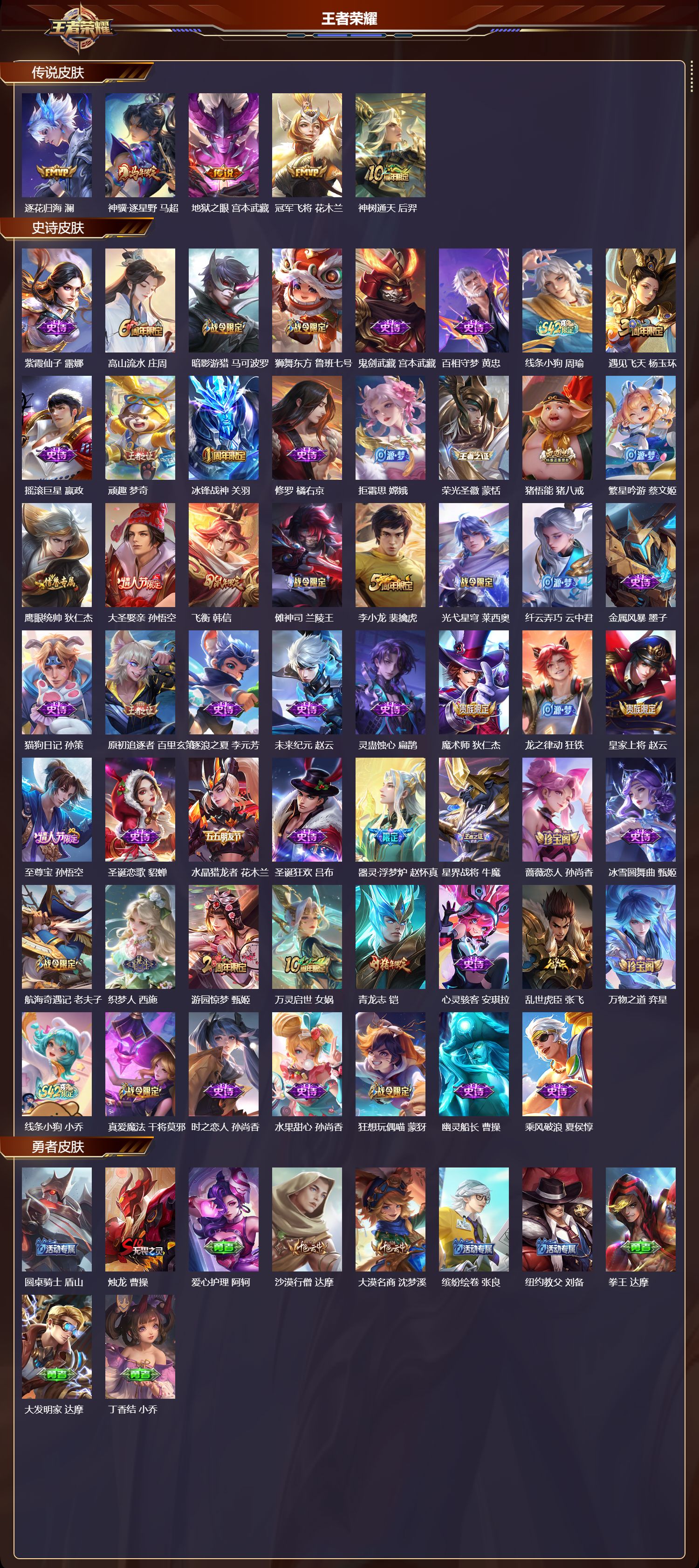 【55,史诗皮肤】紫霞仙子,露娜,高山流水,庄周,暗影游猎,马可波罗,狮舞东方,鲁班七号,鬼剑武藏,宫本武藏,百相守梦,黄忠,线条小狗,周瑜,遇见飞天,杨玉环,摇滚巨星,嬴政,顽趣,梦奇,冰锋战神,关羽,修罗,橘右京,拒霜思,嫦娥,荣光圣徽,蒙恬,猪悟能,猪八戒,繁星吟游,蔡文姬,鹰眼统帅,狄仁杰,大圣娶亲,孙悟空,飞衡,韩信,傩神司,兰陵王,李小龙,裴擒虎,光弋星穹,莱西奥,纤云弄巧,云中君,金属风暴,墨子,猫狗日记,孙策,原初追逐者,百里玄策,逐浪之夏,李元芳,未来纪元,赵云,灵蛊蚀心,扁鹊,魔术师,狄仁杰,龙之律动,狂铁,皇家上将,赵云,至尊宝,孙悟空,圣诞恋歌,貂蝉,水晶猎龙者,花木兰,圣诞狂欢,吕布,器灵·浮梦炉,赵怀真,星界战将,牛魔,蔷薇恋人,孙尚香,冰雪圆舞曲,甄姬,航海奇遇记,老夫子,织梦人,西施,游园惊梦,甄姬,万灵启世,女娲,青龙志,铠,心灵骇客,安琪拉,乱世虎臣,张飞,万物之道,弈星,线条小狗,小乔,真爱魔法,干将莫邪,时之恋人,孙尚香,水果甜心,孙尚香,狂想玩偶喵,蒙犽,幽灵船长,曹操,乘风破浪,夏侯惇,