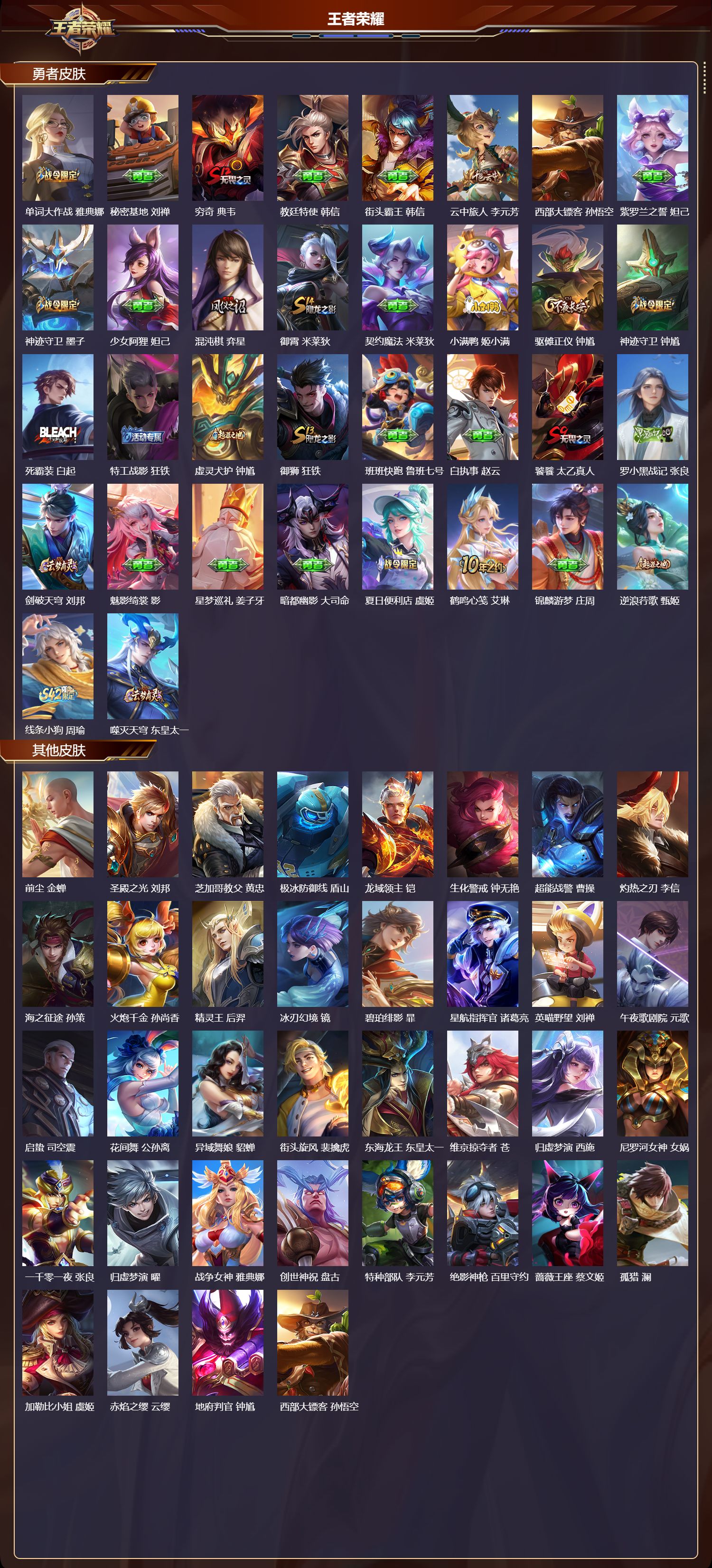 【36,其他皮肤】前尘,金蝉,圣殿之光,刘邦,芝加哥教父,黄忠,极冰防御线,盾山,龙域领主,铠,生化警戒,钟无艳,超能战警,曹操,灼热之刃,李信,海之征途,孙策,火炮千金,孙尚香,精灵王,后羿,冰刃幻境,镜,碧珀绯影,暃,星航指挥官,诸葛亮,英喵野望,刘禅,午夜歌剧院,元歌,启蛰,司空震,花间舞,公孙离,异域舞娘,貂蝉,街头旋风,裴擒虎,东海龙王,东皇太一,维京掠夺者,苍,归虚梦演,西施,尼罗河女神,女娲,一千零一夜,张良,归虚梦演,曜,战争女神,雅典娜,创世神祝,盘古,特种部队,李元芳,绝影神枪,百里守约,蔷薇王座,蔡文姬,孤猎,澜,加勒比小姐,虞姬,赤焰之缨,云缨,地府判官,钟馗,西部大镖客,孙悟空,