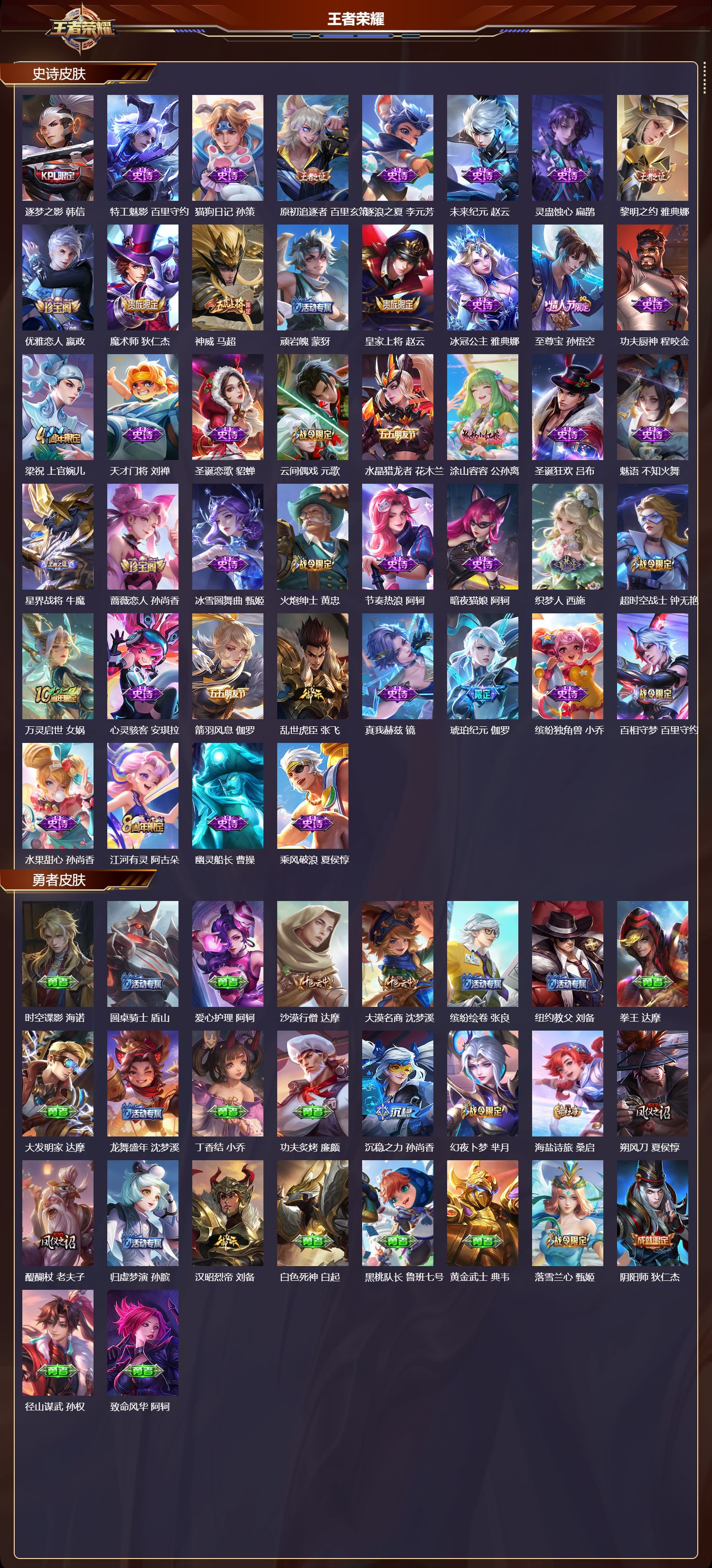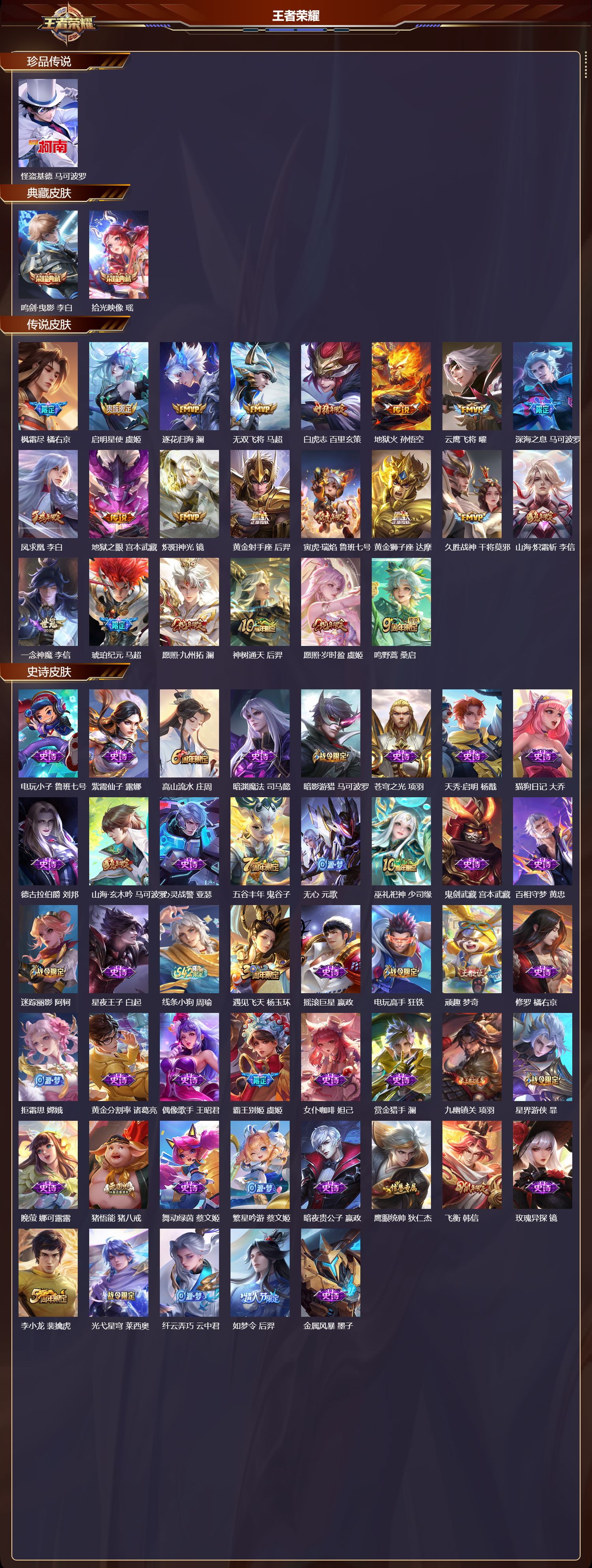 【89,史诗皮肤】电玩小子,鲁班七号,紫霞仙子,露娜,高山流水,庄周,暗渊魔法,司马懿,暗影游猎,马可波罗,苍穹之光,项羽,天秀·启明,杨戬,猫狗日记,大乔,德古拉伯爵,刘邦,山海·玄木吟,马可波罗,心灵战警,亚瑟,五谷丰年,鬼谷子,无心,元歌,巫礼祀神,少司缘,鬼剑武藏,宫本武藏,百相守梦,黄忠,迷踪丽影,阿轲,星夜王子,白起,线条小狗,周瑜,遇见飞天,杨玉环,摇滚巨星,嬴政,电玩高手,狂铁,顽趣,梦奇,修罗,橘右京,拒霜思,嫦娥,黄金分割率,诸葛亮,偶像歌手,王昭君,霸王别姬,虞姬,女仆咖啡,妲己,赏金猎手,澜,九幽镇关,项羽,星界游侠,暃,晚萤,娜可露露,猪悟能,猪八戒,舞动绿茵,蔡文姬,繁星吟游,蔡文姬,暗夜贵公子,嬴政,鹰眼统帅,狄仁杰,飞衡,韩信,玫瑰异探,镜,李小龙,裴擒虎,光弋星穹,莱西奥,纤云弄巧,云中君,如梦令,后羿,金属风暴,墨子,逐梦之影,韩信,特工魅影,百里守约,猫狗日记,孙策,原初追逐者,百里玄策,逐浪之夏,李元芳,未来纪元,赵云,灵蛊蚀心,扁鹊,黎明之约,雅典娜,优雅恋人,嬴政,魔术师,狄仁杰,神威,马超,顽岩魄,蒙犽,皇家上将,赵云,冰冠公主,雅典娜,至尊宝,孙悟空,功夫厨神,程咬金,梁祝,上官婉儿,天才门将,刘禅,圣诞恋歌,貂蝉,云间偶戏,元歌,水晶猎龙者,花木兰,涂山容容,公孙离,圣诞狂欢,吕布,魅语,不知火舞,星界战将,牛魔,蔷薇恋人,孙尚香,冰雪圆舞曲,甄姬,火炮绅士,黄忠,节奏热浪,阿轲,暗夜猫娘,阿轲,织梦人,西施,超时空战士,钟无艳,万灵启世,女娲,心灵骇客,安琪拉,箭羽风息,伽罗,乱世虎臣,张飞,真我赫兹,镜,琥珀纪元,伽罗,缤纷独角兽,小乔,百相守梦,百里守约,水果甜心,孙尚香,江河有灵,阿古朵,幽灵船长,曹操,乘风破浪,夏侯惇,