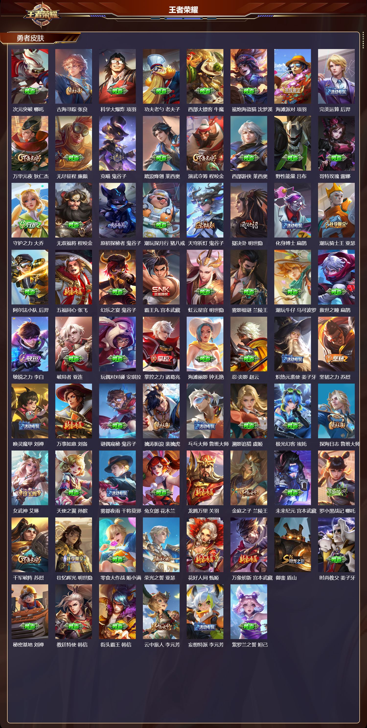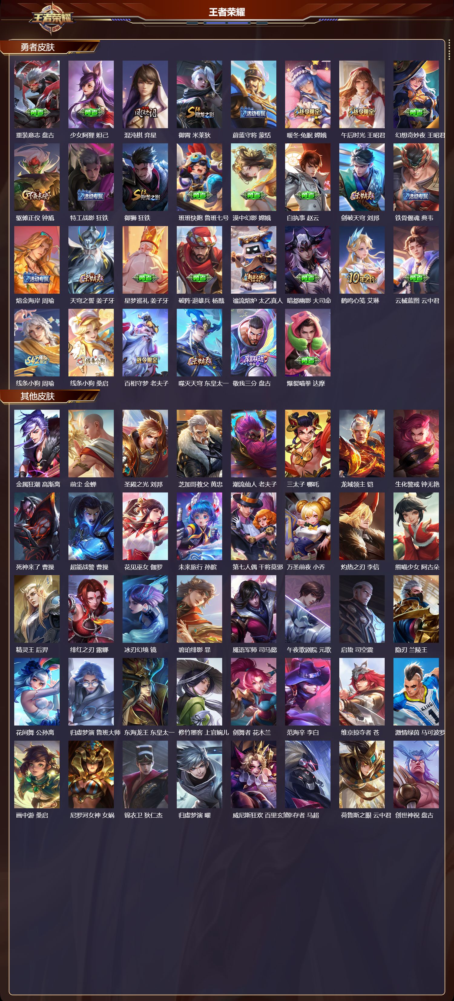 【126,勇者皮肤】时空谍影,海诺,圆桌骑士,盾山,爱心护理,阿轲,沙漠行僧,达摩,大漠名商,沈梦溪,缤纷绘卷,张良,纽约教父,刘备,拳王,达摩,大发明家,达摩,龙舞盛年,沈梦溪,丁香结,小乔,功夫炙烤,廉颇,沉稳之力,孙尚香,幻夜卜梦,芈月,海盐诗旅,桑启,朔风刀,夏侯惇,醍醐杖,老夫子,归虚梦演,孙膑,汉昭烈帝,刘备,白色死神,白起,黑桃队长,鲁班七号,黄金武士,典韦,落雪兰心,甄姬,阴阳师,狄仁杰,径山谋武,孙权,致命风华,阿轲,次元突破,哪吒,古海寻踪,张良,科学大爆炸,项羽,功夫老勺,老夫子,西部大镖客,牛魔,鲨炮海盗猫,沈梦溪,海滩派对,项羽,完美运算,后羿,万华元夜,狄仁杰,无尽征程,廉颇,克喵,鬼谷子,踏浪烽翎,莱西奥,演武夺筹,程咬金,西部游侠,莱西奥,野性能量,吕布,哥特玫瑰,露娜,守护之力,大乔,无双福将,程咬金,原初探秘者,鬼谷子,潮玩探月行,猪八戒,天穹祈灯,鬼谷子,疑决卦,明世隐,化身博士,扁鹊,潮玩骑士王,亚瑟,阿尔法小队,后羿,五福同心,张飞,幻乐之宴,鬼谷子,霸王丸,宫本武藏,虹云星官,明世隐,雾影缉谜,兰陵王,潮玩牛仔,马可波罗,救世之瞳,扁鹊,敏锐之力,李白,破局者,亚连,玩偶对对碰,安琪拉,掌控之力,诸葛亮,海滩丽影,钟无艳,忍·炎影,赵云,炽热元素使,姜子牙,坚韧之力,苏烈,唤灵魔甲,刘禅,万事如意,刘备,谜偶窥秘,鬼谷子,擒涛扼浪,裴擒虎,乓乓大师,鲁班大师,溯影追猎,虞姬,极光幻客,蚩奼,探海日志,鲁班大师,女武神,艾琳,天使之翼,孙膑,雾都夜雨,干将莫邪,兔女郎,花木兰,龙腾万里,关羽,金庭之子,兰陵王,未来纪元,宫本武藏,罗小黑战记,哪吒,千军破阵,苏烈,往忆晖光,明世隐,零食大作战,姬小满,荣光之誓,亚瑟,花好人间,甄姬,万象初新,宫本武藏,御銮,盾山,时尚教父,姜子牙,秘密基地,刘禅,教廷特使,韩信,街头霸王,韩信,云中旅人,李元芳,妄想特派,李元芳,紫罗兰之誓,妲己,重装意志,盘古,少女阿狸,妲己,混沌棋,弈星,御霄,米莱狄,蔚蓝守将,蒙恬,暖冬·兔眠,嫦娥,午后时光,王昭君,幻想奇妙夜,王昭君,驱傩正仪,钟馗,特工战影,狂铁,御狮,狂铁,班班快跑,鲁班七号,漠中幻影,嫦娥,白执事,赵云,剑破天穹,刘邦,铁骨偃魂,典韦,熔金海岸,周瑜,天穹之誓,姜子牙,星梦巡礼,姜子牙,破阵·退雄兵,杨戬,谧流熔炉,太乙真人,暗都幽影,大司命,鹤鸣心笺,艾琳,云械蓝图,云中君,线条小狗,周瑜,线条小狗,桑启,百相守梦,老夫子,噬灭天穹,东皇太一,敬我三分,盘古,爆裂喵拳,达摩,