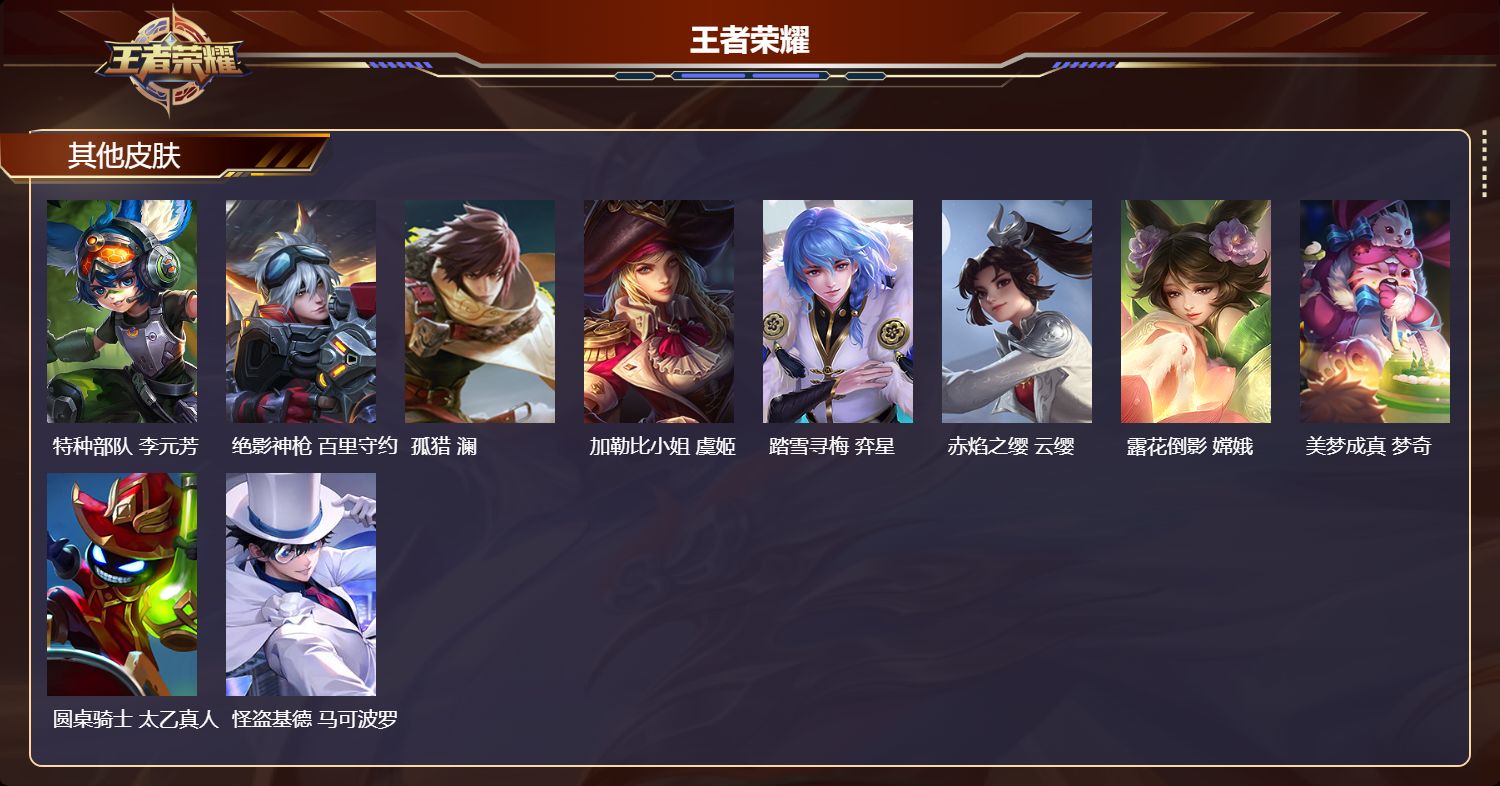 【50,其他皮肤】金属狂潮,高渐离,前尘,金蝉,圣殿之光,刘邦,芝加哥教父,黄忠,潮流仙人,老夫子,三太子,哪吒,龙域领主,铠,生化警戒,钟无艳,死神来了,曹操,超能战警,曹操,花见巫女,伽罗,未来旅行,孙膑,第七人偶,干将莫邪,万圣前夜,小乔,灼热之刃,李信,熊喵少女,阿古朵,精灵王,后羿,绯红之刃,露娜,冰刃幻境,镜,碧珀绯影,暃,魇语军师,司马懿,午夜歌剧院,元歌,启蛰,司空震,隐刃,兰陵王,花间舞,公孙离,归虚梦演,鲁班大师,东海龙王,东皇太一,修竹墨客,上官婉儿,剑舞者,花木兰,范海辛,李白,维京掠夺者,苍,激情绿茵,马可波罗,画中游,桑启,尼罗河女神,女娲,锦衣卫,狄仁杰,归虚梦演,曜,威尼斯狂欢,百里玄策,幸存者,马超,荷鲁斯之眼,云中君,创世神祝,盘古,特种部队,李元芳,绝影神枪,百里守约,孤猎,澜,加勒比小姐,虞姬,踏雪寻梅,弈星,赤焰之缨,云缨,露花倒影,嫦娥,美梦成真,梦奇,圆桌骑士,太乙真人,怪盗基德,马可波罗,