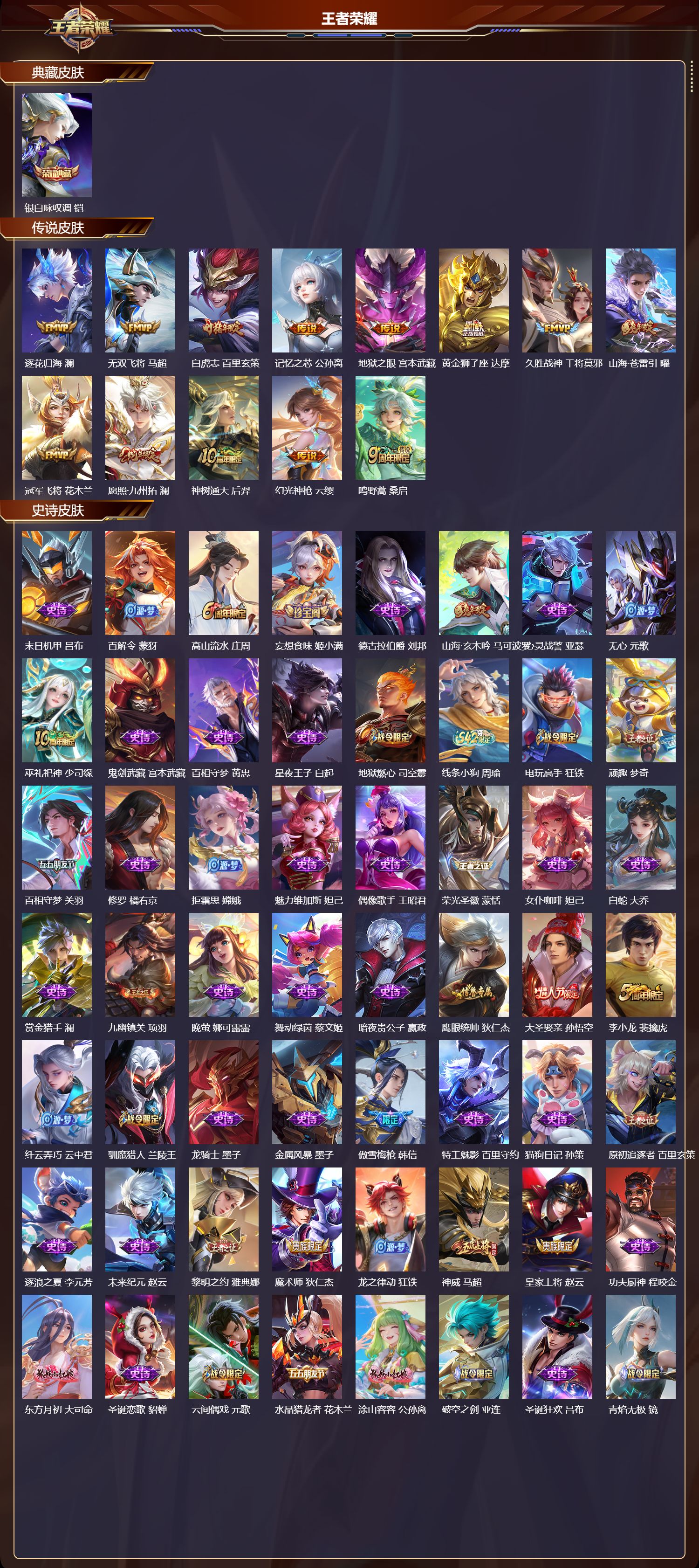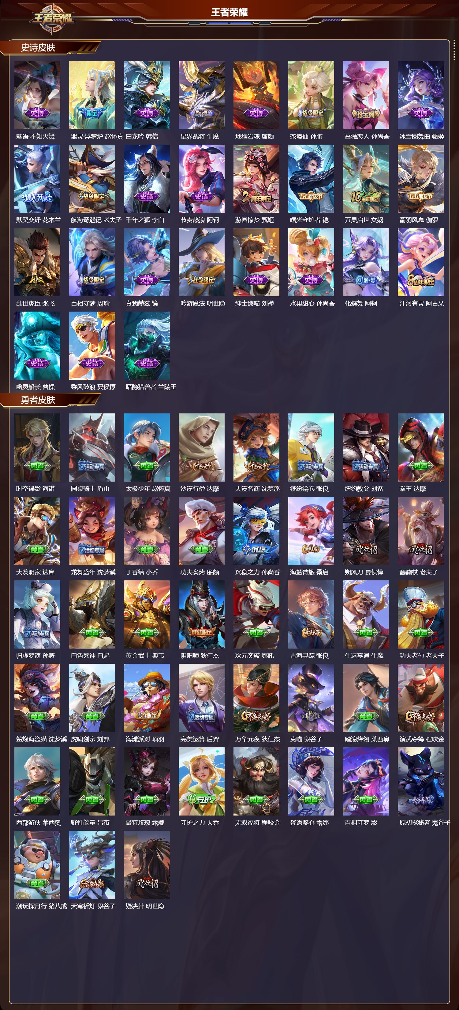 【83,史诗皮肤】末日机甲,吕布,百解令,蒙犽,高山流水,庄周,妄想食味,姬小满,德古拉伯爵,刘邦,山海·玄木吟,马可波罗,心灵战警,亚瑟,无心,元歌,巫礼祀神,少司缘,鬼剑武藏,宫本武藏,百相守梦,黄忠,星夜王子,白起,地狱燃心,司空震,线条小狗,周瑜,电玩高手,狂铁,顽趣,梦奇,百相守梦,关羽,修罗,橘右京,拒霜思,嫦娥,魅力维加斯,妲己,偶像歌手,王昭君,荣光圣徽,蒙恬,女仆咖啡,妲己,白蛇,大乔,赏金猎手,澜,九幽镇关,项羽,晚萤,娜可露露,舞动绿茵,蔡文姬,暗夜贵公子,嬴政,鹰眼统帅,狄仁杰,大圣娶亲,孙悟空,李小龙,裴擒虎,纤云弄巧,云中君,驯魔猎人,兰陵王,龙骑士,墨子,金属风暴,墨子,傲雪梅枪,韩信,特工魅影,百里守约,猫狗日记,孙策,原初追逐者,百里玄策,逐浪之夏,李元芳,未来纪元,赵云,黎明之约,雅典娜,魔术师,狄仁杰,龙之律动,狂铁,神威,马超,皇家上将,赵云,功夫厨神,程咬金,东方月初,大司命,圣诞恋歌,貂蝉,云间偶戏,元歌,水晶猎龙者,花木兰,涂山容容,公孙离,破空之剑,亚连,圣诞狂欢,吕布,青焰无极,镜,魅语,不知火舞,器灵·浮梦炉,赵怀真,白龙吟,韩信,星界战将,牛魔,地狱岩魂,廉颇,茶境仙,孙膑,蔷薇恋人,孙尚香,冰雪圆舞曲,甄姬,默契交锋,花木兰,航海奇遇记,老夫子,千年之狐,李白,节奏热浪,阿轲,游园惊梦,甄姬,曙光守护者,铠,万灵启世,女娲,箭羽风息,伽罗,乱世虎臣,张飞,百相守梦,周瑜,真我赫兹,镜,吟游魔法,明世隐,绅士熊喵,刘禅,水果甜心,孙尚香,化蝶舞,阿轲,江河有灵,阿古朵,幽灵船长,曹操,乘风破浪,夏侯惇,暗隐猎兽者,兰陵王,