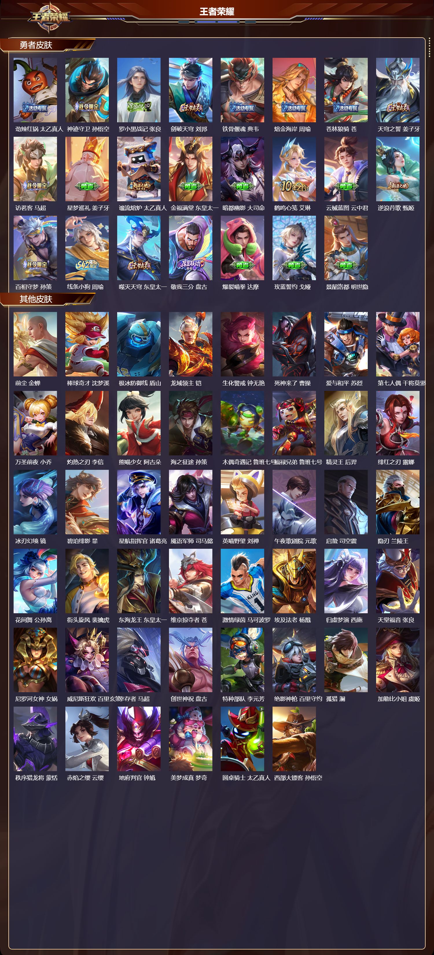 【46,其他皮肤】前尘,金蝉,棒球奇才,沈梦溪,极冰防御线,盾山,龙域领主,铠,生化警戒,钟无艳,死神来了,曹操,爱与和平,苏烈,第七人偶,干将莫邪,万圣前夜,小乔,灼热之刃,李信,熊喵少女,阿古朵,海之征途,孙策,木偶奇遇记,鲁班七号,福禄兄弟,鲁班七号,精灵王,后羿,绯红之刃,露娜,冰刃幻境,镜,碧珀绯影,暃,星航指挥官,诸葛亮,魇语军师,司马懿,英喵野望,刘禅,午夜歌剧院,元歌,启蛰,司空震,隐刃,兰陵王,花间舞,公孙离,街头旋风,裴擒虎,东海龙王,东皇太一,维京掠夺者,苍,激情绿茵,马可波罗,埃及法老,杨戬,归虚梦演,西施,天堂福音,张良,尼罗河女神,女娲,威尼斯狂欢,百里玄策,幸存者,马超,创世神祝,盘古,特种部队,李元芳,绝影神枪,百里守约,孤猎,澜,加勒比小姐,虞姬,秩序猎龙将,蒙恬,赤焰之缨,云缨,地府判官,钟馗,美梦成真,梦奇,圆桌骑士,太乙真人,西部大镖客,孙悟空,