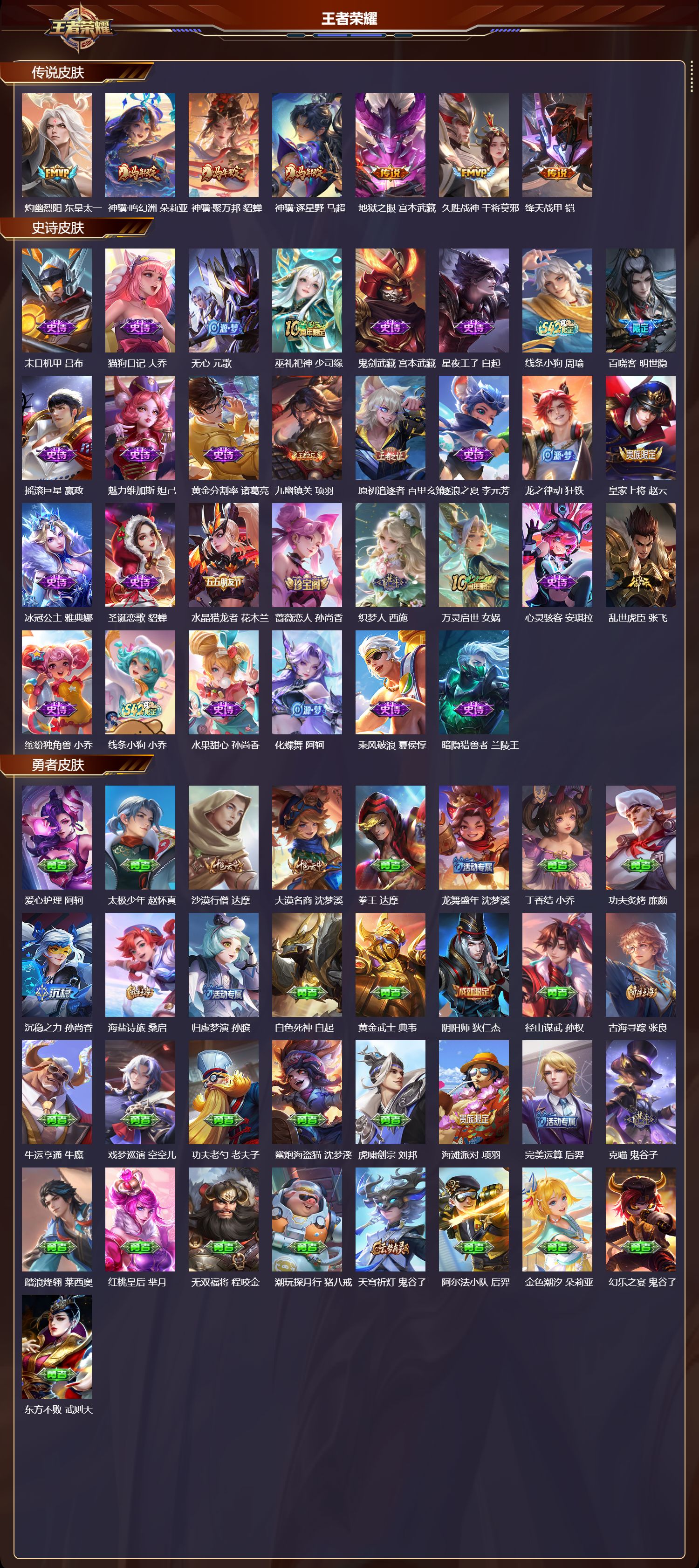 【30,史诗皮肤】末日机甲,吕布,猫狗日记,大乔,无心,元歌,巫礼祀神,少司缘,鬼剑武藏,宫本武藏,星夜王子,白起,线条小狗,周瑜,百晓客,明世隐,摇滚巨星,嬴政,魅力维加斯,妲己,黄金分割率,诸葛亮,九幽镇关,项羽,原初追逐者,百里玄策,逐浪之夏,李元芳,龙之律动,狂铁,皇家上将,赵云,冰冠公主,雅典娜,圣诞恋歌,貂蝉,水晶猎龙者,花木兰,蔷薇恋人,孙尚香,织梦人,西施,万灵启世,女娲,心灵骇客,安琪拉,乱世虎臣,张飞,缤纷独角兽,小乔,线条小狗,小乔,水果甜心,孙尚香,化蝶舞,阿轲,乘风破浪,夏侯惇,暗隐猎兽者,兰陵王,