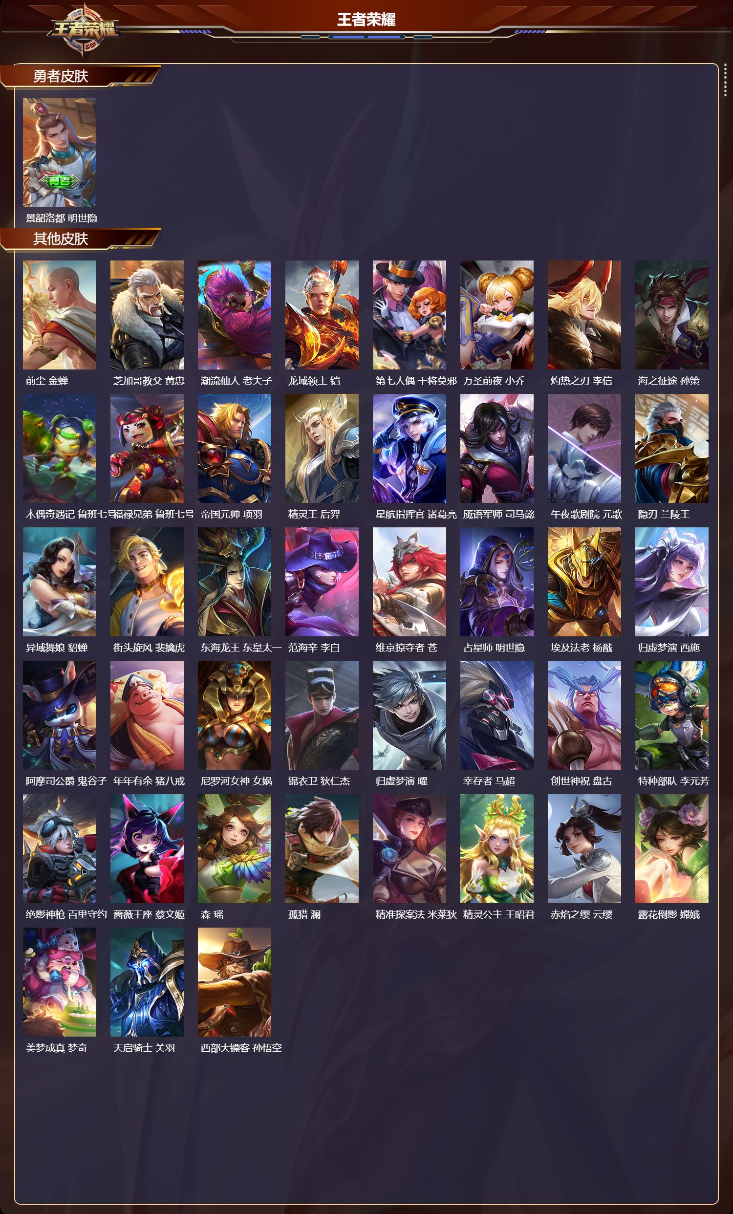 【43,其他皮肤】前尘,金蝉,芝加哥教父,黄忠,潮流仙人,老夫子,龙域领主,铠,第七人偶,干将莫邪,万圣前夜,小乔,灼热之刃,李信,海之征途,孙策,木偶奇遇记,鲁班七号,福禄兄弟,鲁班七号,帝国元帅,项羽,精灵王,后羿,星航指挥官,诸葛亮,魇语军师,司马懿,午夜歌剧院,元歌,隐刃,兰陵王,异域舞娘,貂蝉,街头旋风,裴擒虎,东海龙王,东皇太一,范海辛,李白,维京掠夺者,苍,占星师,明世隐,埃及法老,杨戬,归虚梦演,西施,阿摩司公爵,鬼谷子,年年有余,猪八戒,尼罗河女神,女娲,锦衣卫,狄仁杰,归虚梦演,曜,幸存者,马超,创世神祝,盘古,特种部队,李元芳,绝影神枪,百里守约,蔷薇王座,蔡文姬,森,瑶,孤猎,澜,精准探案法,米莱狄,精灵公主,王昭君,赤焰之缨,云缨,露花倒影,嫦娥,美梦成真,梦奇,天启骑士,关羽,西部大镖客,孙悟空,