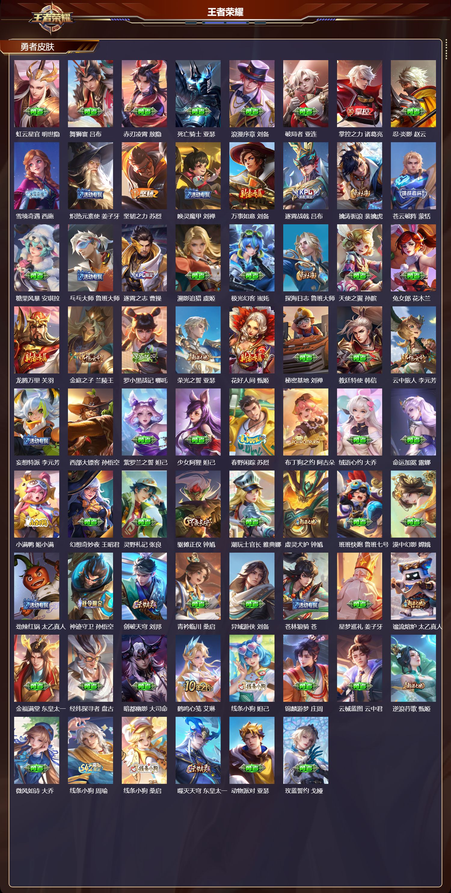 【104,勇者皮肤】爱心护理,阿轲,太极少年,赵怀真,沙漠行僧,达摩,大漠名商,沈梦溪,拳王,达摩,龙舞盛年,沈梦溪,丁香结,小乔,功夫炙烤,廉颇,沉稳之力,孙尚香,海盐诗旅,桑启,归虚梦演,孙膑,白色死神,白起,黄金武士,典韦,阴阳师,狄仁杰,径山谋武,孙权,古海寻踪,张良,牛运亨通,牛魔,戏梦巡演,空空儿,功夫老勺,老夫子,鲨炮海盗猫,沈梦溪,虎啸剑宗,刘邦,海滩派对,项羽,完美运算,后羿,克喵,鬼谷子,踏浪烽翎,莱西奥,红桃皇后,芈月,无双福将,程咬金,潮玩探月行,猪八戒,天穹祈灯,鬼谷子,阿尔法小队,后羿,金色潮汐,朵莉亚,幻乐之宴,鬼谷子,东方不败,武则天,虹云星官,明世隐,舞狮寰,吕布,赤刃凌霄,敖隐,死亡骑士,亚瑟,浪漫序章,刘备,破局者,亚连,掌控之力,诸葛亮,忍·炎影,赵云,雪境奇遇,西施,炽热元素使,姜子牙,坚韧之力,苏烈,唤灵魔甲,刘禅,万事如意,刘备,逐霄战戟,吕布,擒涛扼浪,裴擒虎,苍云破阵,蒙恬,糖果风暴,安琪拉,乓乓大师,鲁班大师,逐霄之志,曹操,溯影追猎,虞姬,极光幻客,蚩奼,探海日志,鲁班大师,天使之翼,孙膑,兔女郎,花木兰,龙腾万里,关羽,金庭之子,兰陵王,罗小黑战记,哪吒,荣光之誓,亚瑟,花好人间,甄姬,秘密基地,刘禅,教廷特使,韩信,云中旅人,李元芳,妄想特派,李元芳,西部大镖客,孙悟空,紫罗兰之誓,妲己,少女阿狸,妲己,春野闲踪,苏烈,布丁狗之约,阿古朵,绒语心约,大乔,命运加冕,露娜,小满鸭,姬小满,幻想奇妙夜,王昭君,灵野札记,张良,驱傩正仪,钟馗,潮玩士官长,雅典娜,虚灵犬护,钟馗,班班快跑,鲁班七号,漠中幻影,嫦娥,劲辣红锅,太乙真人,神迹守卫,孙悟空,剑破天穹,刘邦,青衿临川,桑启,异域游侠,刘备,苍林狼骑,苍,星梦巡礼,姜子牙,谧流熔炉,太乙真人,金福满堂,东皇太一,经纬探寻者,盘古,暗都幽影,大司命,鹤鸣心笺,艾琳,线条小狗,妲己,锦麟游梦,庄周,云械蓝图,云中君,逆浪荇歌,甄姬,微风如诗,大乔,线条小狗,周瑜,线条小狗,桑启,噬灭天穹,东皇太一,动物派对,亚瑟,玫蓝誓约,戈娅,景韶洛都,明世隐,