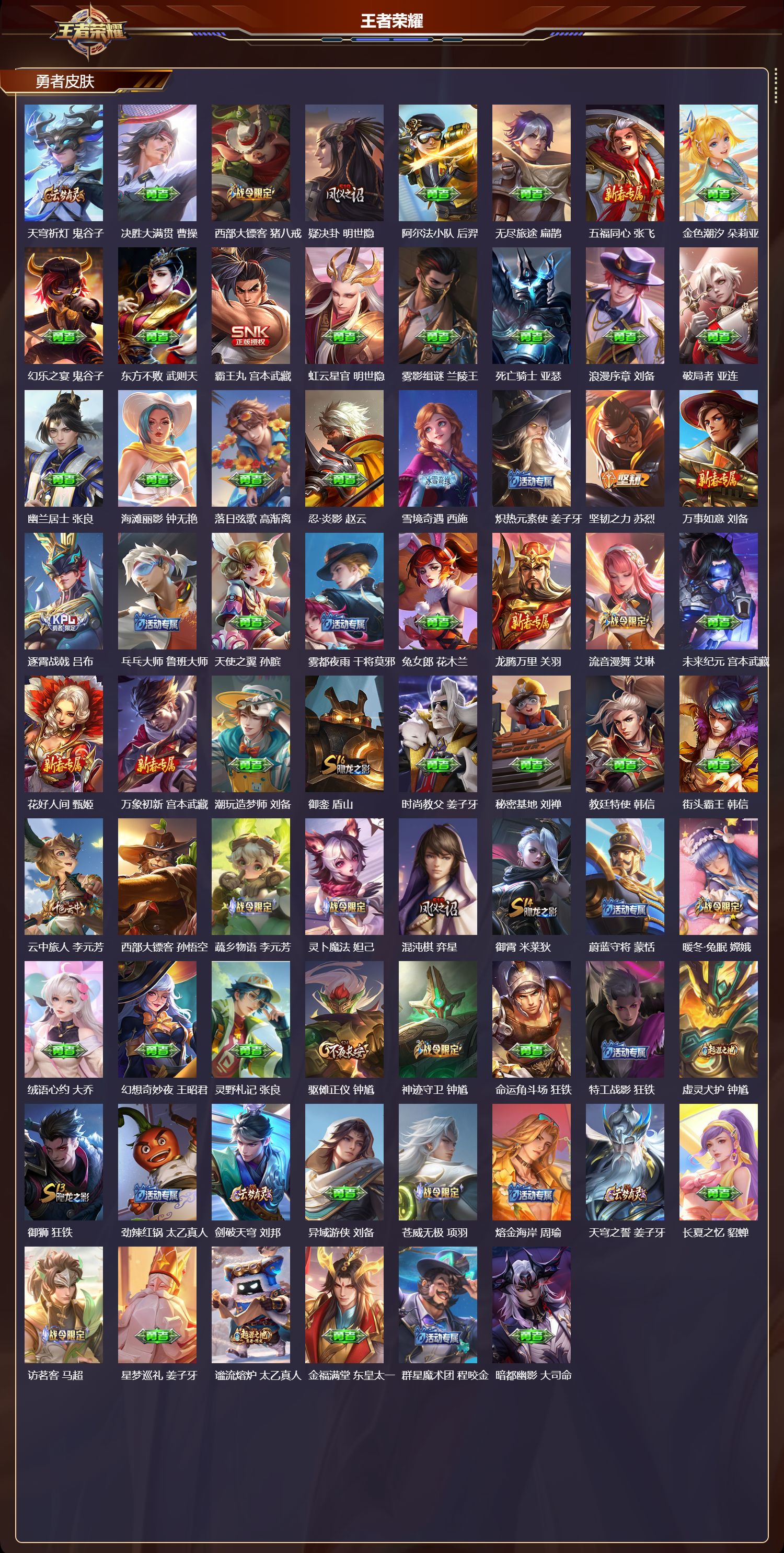【116,勇者皮肤】圆桌骑士,盾山,沙漠行僧,达摩,大漠名商,沈梦溪,缤纷绘卷,张良,纽约教父,刘备,大发明家,达摩,丁香结,小乔,功夫炙烤,廉颇,幻夜卜梦,芈月,海盐诗旅,桑启,朔风刀,夏侯惇,醍醐杖,老夫子,朔望之晖,女娲,汉昭烈帝,刘备,白色死神,白起,黄金武士,典韦,御旌,牛魔,阴阳师,狄仁杰,径山谋武,孙权,次元突破,哪吒,古海寻踪,张良,功夫老勺,老夫子,西部大镖客,牛魔,鲨炮海盗猫,沈梦溪,海滩派对,项羽,万华元夜,狄仁杰,无尽征程,廉颇,演武夺筹,程咬金,红桃皇后,芈月,奇妙博物学,庄周,猎兽之王,吕布,哥特玫瑰,露娜,守护之力,大乔,无双福将,程咬金,百相守梦,影,原初探秘者,鬼谷子,潮玩探月行,猪八戒,鸿运当头,亚瑟,天穹祈灯,鬼谷子,决胜大满贯,曹操,西部大镖客,猪八戒,疑决卦,明世隐,阿尔法小队,后羿,无尽旅途,扁鹊,五福同心,张飞,金色潮汐,朵莉亚,幻乐之宴,鬼谷子,东方不败,武则天,霸王丸,宫本武藏,虹云星官,明世隐,雾影缉谜,兰陵王,死亡骑士,亚瑟,浪漫序章,刘备,破局者,亚连,幽兰居士,张良,海滩丽影,钟无艳,落日弦歌,高渐离,忍·炎影,赵云,雪境奇遇,西施,炽热元素使,姜子牙,坚韧之力,苏烈,万事如意,刘备,逐霄战戟,吕布,乓乓大师,鲁班大师,天使之翼,孙膑,雾都夜雨,干将莫邪,兔女郎,花木兰,龙腾万里,关羽,流音漫舞,艾琳,未来纪元,宫本武藏,花好人间,甄姬,万象初新,宫本武藏,潮玩造梦师,刘备,御銮,盾山,时尚教父,姜子牙,秘密基地,刘禅,教廷特使,韩信,街头霸王,韩信,云中旅人,李元芳,西部大镖客,孙悟空,蔬乡物语,李元芳,灵卜魔法,妲己,混沌棋,弈星,御霄,米莱狄,蔚蓝守将,蒙恬,暖冬·兔眠,嫦娥,绒语心约,大乔,幻想奇妙夜,王昭君,灵野札记,张良,驱傩正仪,钟馗,神迹守卫,钟馗,命运角斗场,狂铁,特工战影,狂铁,虚灵犬护,钟馗,御狮,狂铁,劲辣红锅,太乙真人,剑破天穹,刘邦,异域游侠,刘备,苍威无极,项羽,熔金海岸,周瑜,天穹之誓,姜子牙,长夏之忆,貂蝉,访茗客,马超,星梦巡礼,姜子牙,谧流熔炉,太乙真人,金福满堂,东皇太一,群星魔术团,程咬金,暗都幽影,大司命,夏日便利店,虞姬,鹤鸣心笺,艾琳,海之女神,海月,线条小狗,周瑜,灵卦秘语,少司缘,爆裂喵拳,达摩,玫蓝誓约,戈娅,景韶洛都,明世隐,