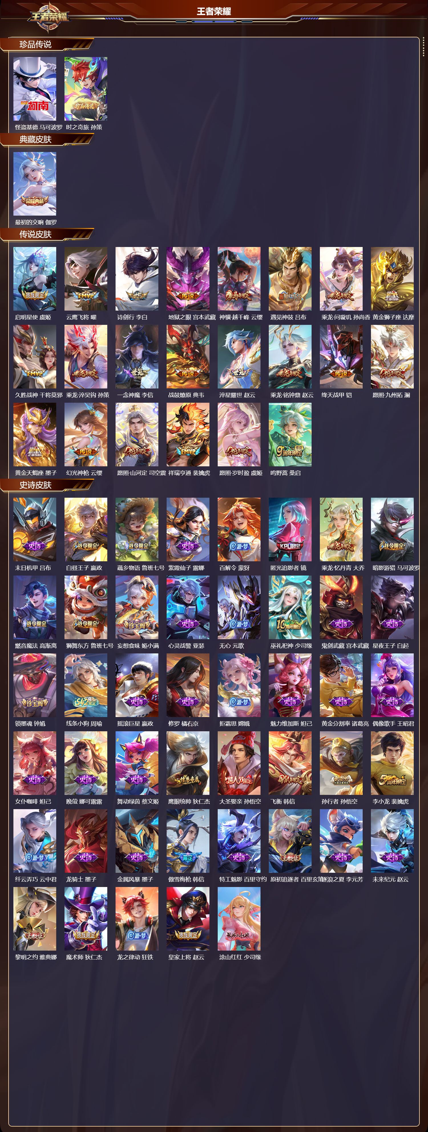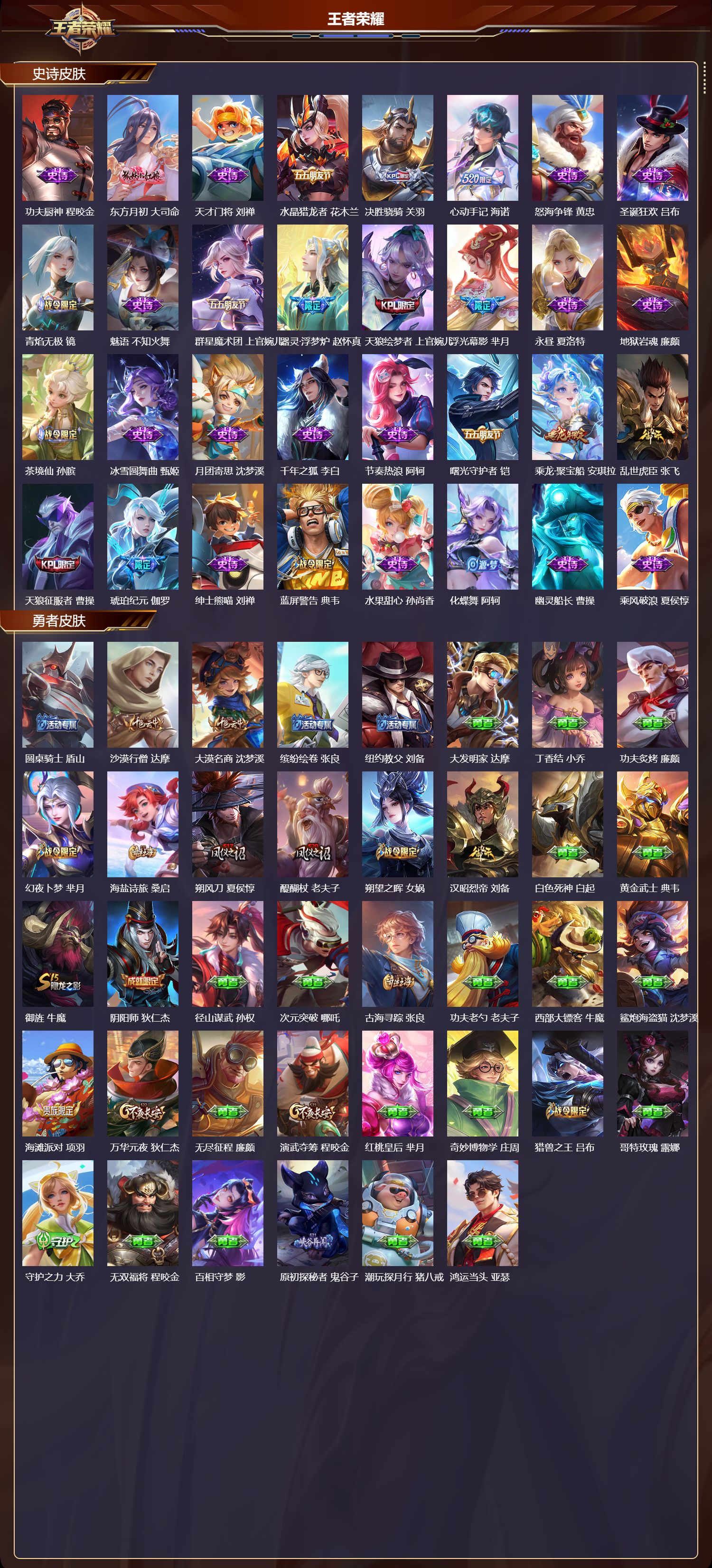 【77,史诗皮肤】末日机甲,吕布,白昼王子,嬴政,蔬乡物语,鲁班七号,紫霞仙子,露娜,百解令,蒙犽,匿光追影者,镜,乘龙·忆丹青,大乔,暗影游猎,马可波罗,燃音魔法,高渐离,狮舞东方,鲁班七号,妄想食味,姬小满,心灵战警,亚瑟,无心,元歌,巫礼祀神,少司缘,鬼剑武藏,宫本武藏,星夜王子,白起,锁墨魂,钟馗,线条小狗,周瑜,摇滚巨星,嬴政,修罗,橘右京,拒霜思,嫦娥,魅力维加斯,妲己,黄金分割率,诸葛亮,偶像歌手,王昭君,女仆咖啡,妲己,晚萤,娜可露露,舞动绿茵,蔡文姬,鹰眼统帅,狄仁杰,大圣娶亲,孙悟空,飞衡,韩信,孙行者,孙悟空,李小龙,裴擒虎,纤云弄巧,云中君,龙骑士,墨子,金属风暴,墨子,傲雪梅枪,韩信,特工魅影,百里守约,原初追逐者,百里玄策,逐浪之夏,李元芳,未来纪元,赵云,黎明之约,雅典娜,魔术师,狄仁杰,龙之律动,狂铁,皇家上将,赵云,涂山红红,少司缘,功夫厨神,程咬金,东方月初,大司命,天才门将,刘禅,水晶猎龙者,花木兰,决胜骁骑,关羽,心动手记,海诺,怒海争锋,黄忠,圣诞狂欢,吕布,青焰无极,镜,魅语,不知火舞,群星魔术团,上官婉儿,器灵·浮梦炉,赵怀真,天狼绘梦者,上官婉儿,浮光幕影,芈月,永昼,夏洛特,地狱岩魂,廉颇,茶境仙,孙膑,冰雪圆舞曲,甄姬,月团寄思,沈梦溪,千年之狐,李白,节奏热浪,阿轲,曙光守护者,铠,乘龙·聚宝船,安琪拉,乱世虎臣,张飞,天狼征服者,曹操,琥珀纪元,伽罗,绅士熊喵,刘禅,蓝屏警告,典韦,水果甜心,孙尚香,化蝶舞,阿轲,幽灵船长,曹操,乘风破浪,夏侯惇,