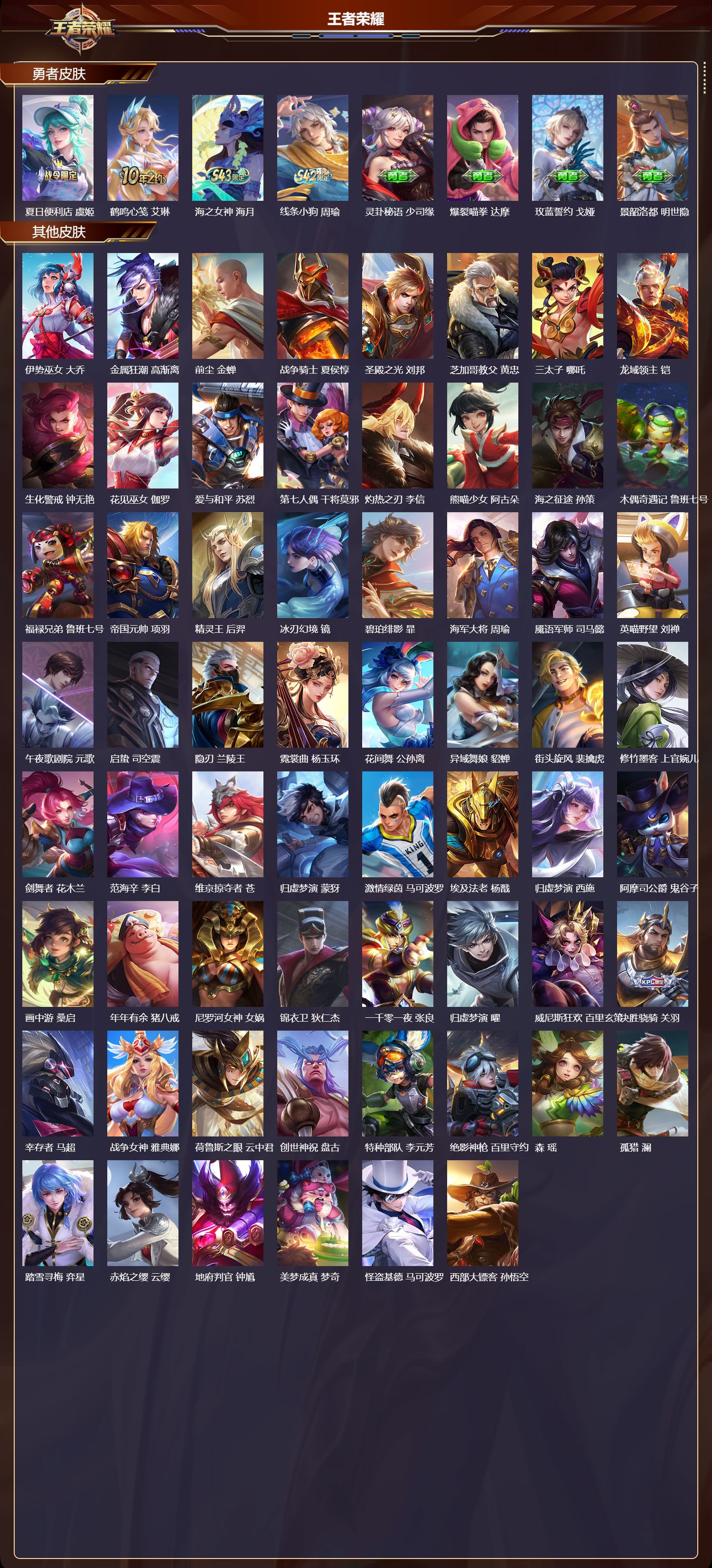【63,其他皮肤】伊势巫女,大乔,金属狂潮,高渐离,前尘,金蝉,战争骑士,夏侯惇,圣殿之光,刘邦,芝加哥教父,黄忠,三太子,哪吒,龙域领主,铠,生化警戒,钟无艳,花见巫女,伽罗,爱与和平,苏烈,第七人偶,干将莫邪,灼热之刃,李信,熊喵少女,阿古朵,海之征途,孙策,木偶奇遇记,鲁班七号,福禄兄弟,鲁班七号,帝国元帅,项羽,精灵王,后羿,冰刃幻境,镜,碧珀绯影,暃,海军大将,周瑜,魇语军师,司马懿,英喵野望,刘禅,午夜歌剧院,元歌,启蛰,司空震,隐刃,兰陵王,霓裳曲,杨玉环,花间舞,公孙离,异域舞娘,貂蝉,街头旋风,裴擒虎,修竹墨客,上官婉儿,剑舞者,花木兰,范海辛,李白,维京掠夺者,苍,归虚梦演,蒙犽,激情绿茵,马可波罗,埃及法老,杨戬,归虚梦演,西施,阿摩司公爵,鬼谷子,画中游,桑启,年年有余,猪八戒,尼罗河女神,女娲,锦衣卫,狄仁杰,一千零一夜,张良,归虚梦演,曜,威尼斯狂欢,百里玄策,决胜骁骑,关羽,幸存者,马超,战争女神,雅典娜,荷鲁斯之眼,云中君,创世神祝,盘古,特种部队,李元芳,绝影神枪,百里守约,森,瑶,孤猎,澜,踏雪寻梅,弈星,赤焰之缨,云缨,地府判官,钟馗,美梦成真,梦奇,怪盗基德,马可波罗,西部大镖客,孙悟空,时之奇旅,孙策,