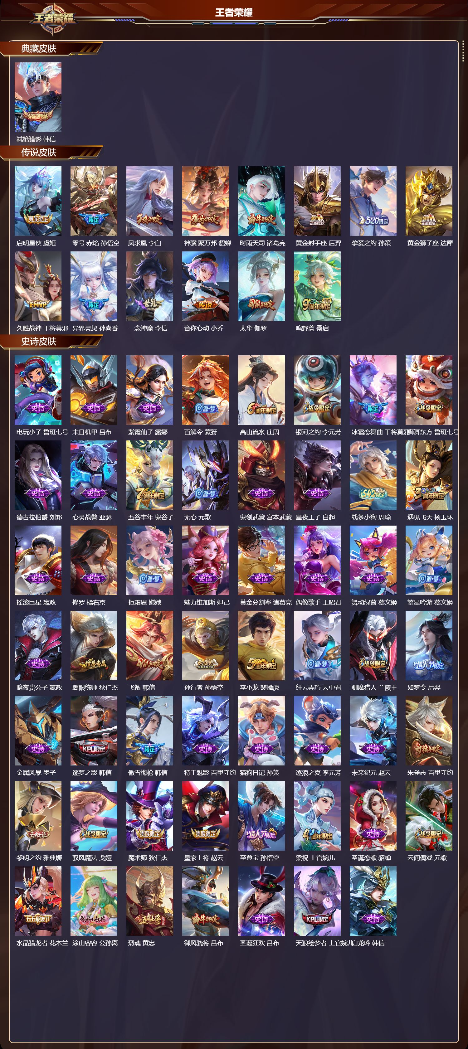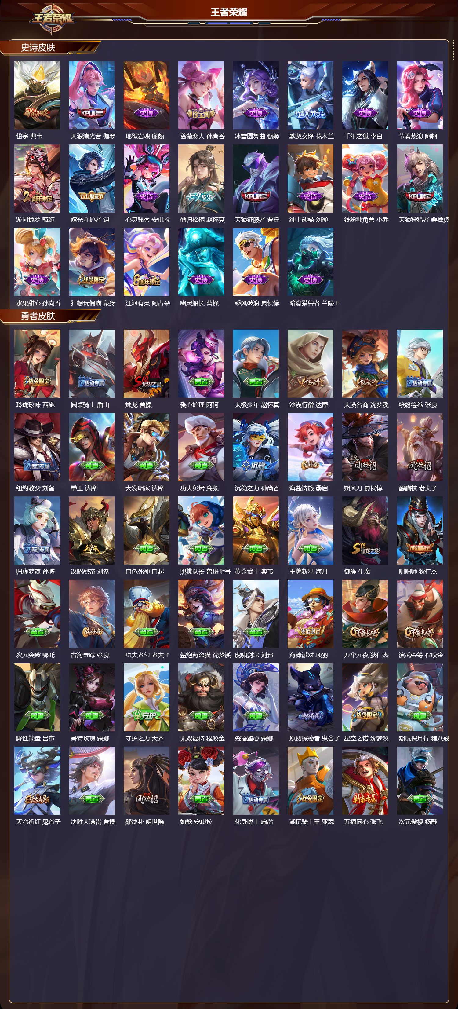 【77,史诗皮肤】电玩小子,鲁班七号,末日机甲,吕布,紫霞仙子,露娜,百解令,蒙犽,高山流水,庄周,银河之约,李元芳,冰霜恋舞曲,干将莫邪,狮舞东方,鲁班七号,德古拉伯爵,刘邦,心灵战警,亚瑟,五谷丰年,鬼谷子,无心,元歌,鬼剑武藏,宫本武藏,星夜王子,白起,线条小狗,周瑜,遇见飞天,杨玉环,摇滚巨星,嬴政,修罗,橘右京,拒霜思,嫦娥,魅力维加斯,妲己,黄金分割率,诸葛亮,偶像歌手,王昭君,舞动绿茵,蔡文姬,繁星吟游,蔡文姬,暗夜贵公子,嬴政,鹰眼统帅,狄仁杰,飞衡,韩信,孙行者,孙悟空,李小龙,裴擒虎,纤云弄巧,云中君,驯魔猎人,兰陵王,如梦令,后羿,金属风暴,墨子,逐梦之影,韩信,傲雪梅枪,韩信,特工魅影,百里守约,猫狗日记,孙策,逐浪之夏,李元芳,未来纪元,赵云,朱雀志,百里守约,黎明之约,雅典娜,驭风魔法,戈娅,魔术师,狄仁杰,皇家上将,赵云,至尊宝,孙悟空,梁祝,上官婉儿,圣诞恋歌,貂蝉,云间偶戏,元歌,水晶猎龙者,花木兰,涂山容容,公孙离,烈魂,黄忠,御风骁将,吕布,圣诞狂欢,吕布,天狼绘梦者,上官婉儿,白龙吟,韩信,岱宗,典韦,天狼溯光者,伽罗,地狱岩魂,廉颇,蔷薇恋人,孙尚香,冰雪圆舞曲,甄姬,默契交锋,花木兰,千年之狐,李白,节奏热浪,阿轲,游园惊梦,甄姬,曙光守护者,铠,心灵骇客,安琪拉,鹤归松栖,赵怀真,天狼征服者,曹操,绅士熊喵,刘禅,缤纷独角兽,小乔,天狼狩猎者,裴擒虎,水果甜心,孙尚香,狂想玩偶喵,蒙犽,江河有灵,阿古朵,幽灵船长,曹操,乘风破浪,夏侯惇,暗隐猎兽者,兰陵王,