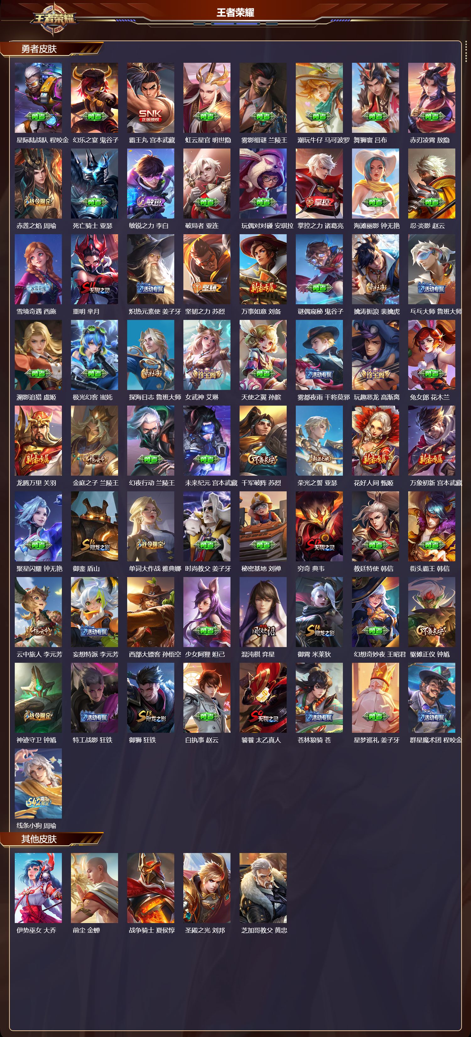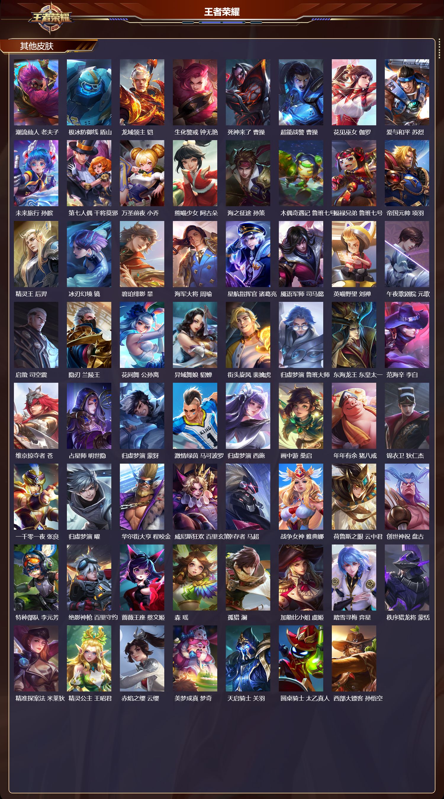 【68,其他皮肤】伊势巫女,大乔,前尘,金蝉,战争骑士,夏侯惇,圣殿之光,刘邦,芝加哥教父,黄忠,潮流仙人,老夫子,极冰防御线,盾山,龙域领主,铠,生化警戒,钟无艳,死神来了,曹操,超能战警,曹操,花见巫女,伽罗,爱与和平,苏烈,未来旅行,孙膑,第七人偶,干将莫邪,万圣前夜,小乔,熊喵少女,阿古朵,海之征途,孙策,木偶奇遇记,鲁班七号,福禄兄弟,鲁班七号,帝国元帅,项羽,精灵王,后羿,冰刃幻境,镜,碧珀绯影,暃,海军大将,周瑜,星航指挥官,诸葛亮,魇语军师,司马懿,英喵野望,刘禅,午夜歌剧院,元歌,启蛰,司空震,隐刃,兰陵王,花间舞,公孙离,异域舞娘,貂蝉,街头旋风,裴擒虎,归虚梦演,鲁班大师,东海龙王,东皇太一,范海辛,李白,维京掠夺者,苍,占星师,明世隐,归虚梦演,蒙犽,激情绿茵,马可波罗,归虚梦演,西施,画中游,桑启,年年有余,猪八戒,锦衣卫,狄仁杰,一千零一夜,张良,归虚梦演,曜,华尔街大亨,程咬金,威尼斯狂欢,百里玄策,幸存者,马超,战争女神,雅典娜,荷鲁斯之眼,云中君,创世神祝,盘古,特种部队,李元芳,绝影神枪,百里守约,蔷薇王座,蔡文姬,森,瑶,孤猎,澜,加勒比小姐,虞姬,踏雪寻梅,弈星,秩序猎龙将,蒙恬,精准探案法,米莱狄,精灵公主,王昭君,赤焰之缨,云缨,美梦成真,梦奇,天启骑士,关羽,圆桌骑士,太乙真人,西部大镖客,孙悟空,