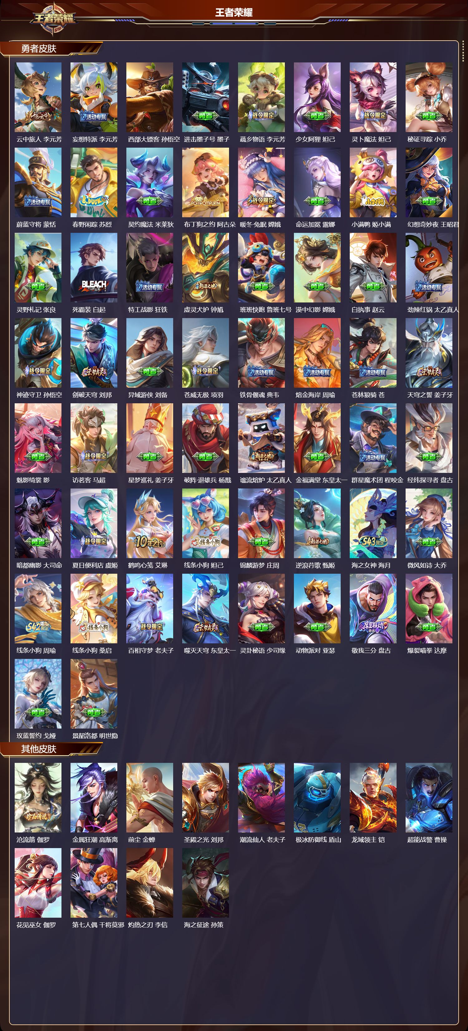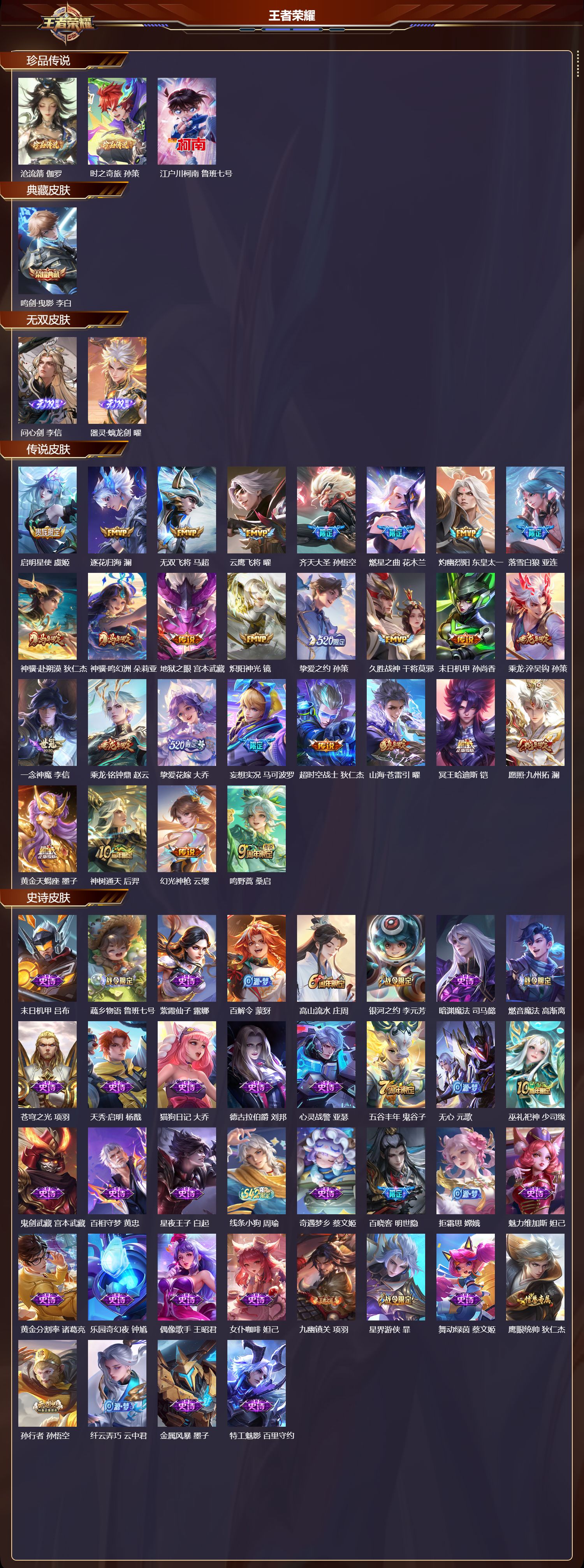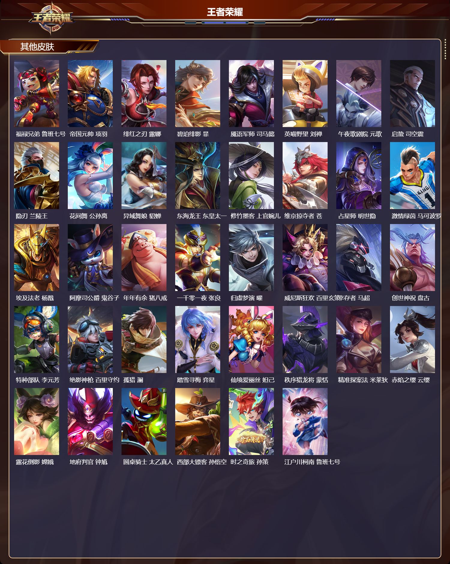 【50,其他皮肤】沧流箭,伽罗,金属狂潮,高渐离,前尘,金蝉,圣殿之光,刘邦,潮流仙人,老夫子,极冰防御线,盾山,龙域领主,铠,超能战警,曹操,花见巫女,伽罗,第七人偶,干将莫邪,灼热之刃,李信,海之征途,孙策,福禄兄弟,鲁班七号,帝国元帅,项羽,绯红之刃,露娜,碧珀绯影,暃,魇语军师,司马懿,英喵野望,刘禅,午夜歌剧院,元歌,启蛰,司空震,隐刃,兰陵王,花间舞,公孙离,异域舞娘,貂蝉,东海龙王,东皇太一,修竹墨客,上官婉儿,维京掠夺者,苍,占星师,明世隐,激情绿茵,马可波罗,埃及法老,杨戬,阿摩司公爵,鬼谷子,年年有余,猪八戒,一千零一夜,张良,归虚梦演,曜,威尼斯狂欢,百里玄策,幸存者,马超,创世神祝,盘古,特种部队,李元芳,绝影神枪,百里守约,孤猎,澜,踏雪寻梅,弈星,仙境爱丽丝,妲己,秩序猎龙将,蒙恬,精准探案法,米莱狄,赤焰之缨,云缨,露花倒影,嫦娥,地府判官,钟馗,圆桌骑士,太乙真人,西部大镖客,孙悟空,时之奇旅,孙策,江户川柯南,鲁班七号,