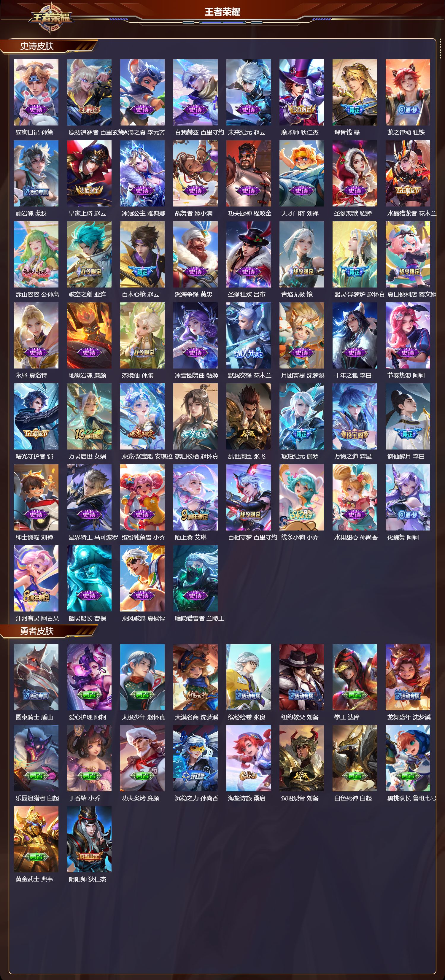 【88,史诗皮肤】末日机甲,吕布,蔬乡物语,鲁班七号,紫霞仙子,露娜,百解令,蒙犽,高山流水,庄周,银河之约,李元芳,暗渊魔法,司马懿,燃音魔法,高渐离,苍穹之光,项羽,天秀·启明,杨戬,猫狗日记,大乔,德古拉伯爵,刘邦,心灵战警,亚瑟,五谷丰年,鬼谷子,无心,元歌,巫礼祀神,少司缘,鬼剑武藏,宫本武藏,百相守梦,黄忠,星夜王子,白起,线条小狗,周瑜,奇遇梦乡,蔡文姬,百晓客,明世隐,拒霜思,嫦娥,魅力维加斯,妲己,黄金分割率,诸葛亮,乐园奇幻夜,钟馗,偶像歌手,王昭君,女仆咖啡,妲己,九幽镇关,项羽,星界游侠,暃,舞动绿茵,蔡文姬,鹰眼统帅,狄仁杰,孙行者,孙悟空,纤云弄巧,云中君,金属风暴,墨子,特工魅影,百里守约,猫狗日记,孙策,原初追逐者,百里玄策,逐浪之夏,李元芳,真我赫兹,百里守约,未来纪元,赵云,魔术师,狄仁杰,埋骨钱,暃,龙之律动,狂铁,顽岩魄,蒙犽,皇家上将,赵云,冰冠公主,雅典娜,战舞者,姬小满,功夫厨神,程咬金,天才门将,刘禅,圣诞恋歌,貂蝉,水晶猎龙者,花木兰,涂山容容,公孙离,破空之剑,亚连,百木心枪,赵云,怒海争锋,黄忠,圣诞狂欢,吕布,青焰无极,镜,器灵·浮梦炉,赵怀真,夏日便利店,蔡文姬,永昼,夏洛特,地狱岩魂,廉颇,茶境仙,孙膑,冰雪圆舞曲,甄姬,默契交锋,花木兰,月团寄思,沈梦溪,千年之狐,李白,节奏热浪,阿轲,曙光守护者,铠,万灵启世,女娲,乘龙·聚宝船,安琪拉,鹤归松栖,赵怀真,乱世虎臣,张飞,琥珀纪元,伽罗,万物之道,弈星,谪仙醉月,李白,绅士熊喵,刘禅,星界特工,马可波罗,缤纷独角兽,小乔,陌上桑,艾琳,百相守梦,百里守约,线条小狗,小乔,水果甜心,孙尚香,化蝶舞,阿轲,江河有灵,阿古朵,幽灵船长,曹操,乘风破浪,夏侯惇,暗隐猎兽者,兰陵王,