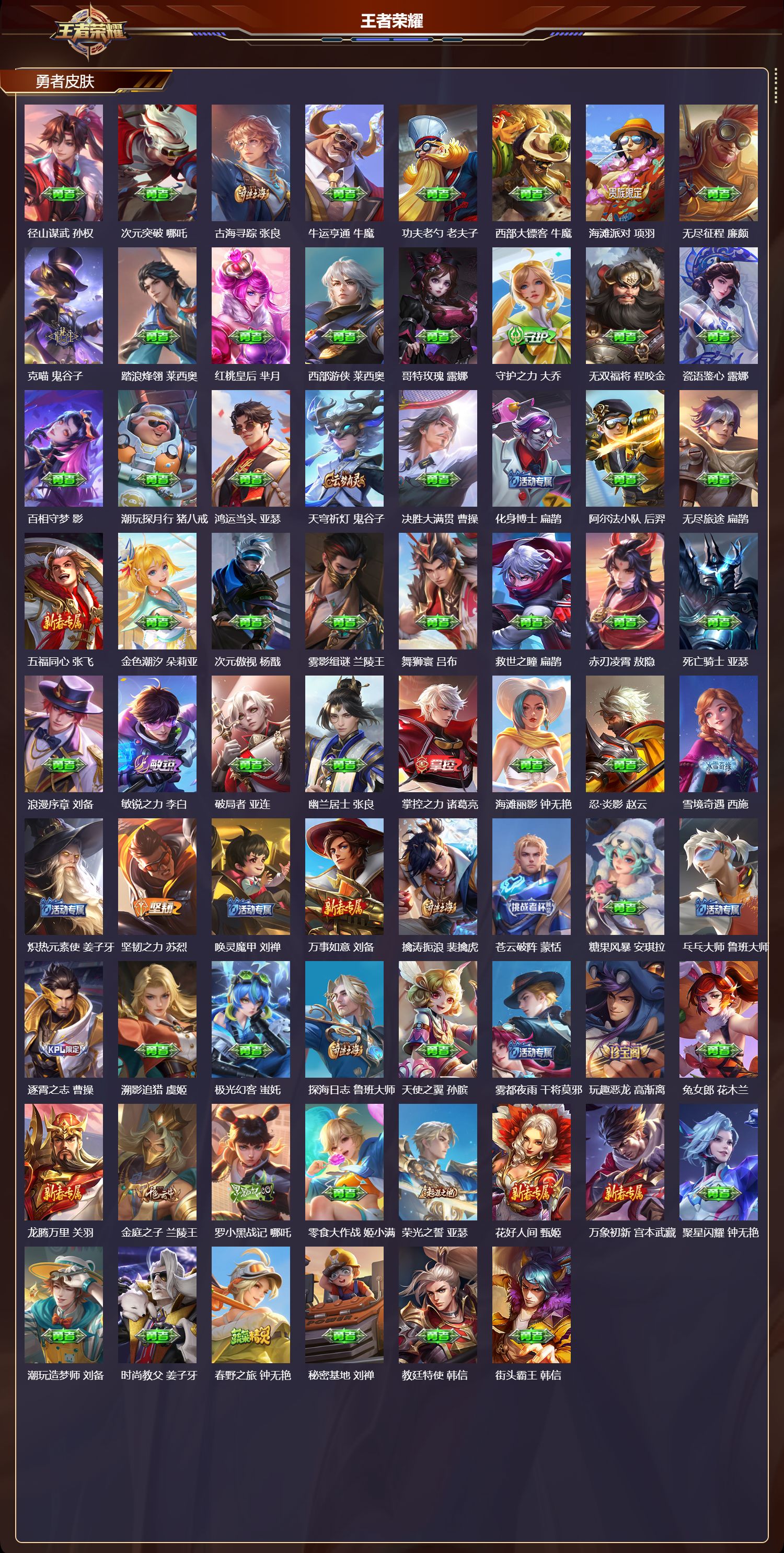 【146,勇者皮肤】圆桌骑士,盾山,爱心护理,阿轲,太极少年,赵怀真,大漠名商,沈梦溪,缤纷绘卷,张良,纽约教父,刘备,拳王,达摩,龙舞盛年,沈梦溪,乐园追猎者,白起,丁香结,小乔,功夫炙烤,廉颇,沉稳之力,孙尚香,海盐诗旅,桑启,汉昭烈帝,刘备,白色死神,白起,黑桃队长,鲁班七号,黄金武士,典韦,阴阳师,狄仁杰,径山谋武,孙权,次元突破,哪吒,古海寻踪,张良,牛运亨通,牛魔,功夫老勺,老夫子,西部大镖客,牛魔,海滩派对,项羽,无尽征程,廉颇,克喵,鬼谷子,踏浪烽翎,莱西奥,红桃皇后,芈月,西部游侠,莱西奥,哥特玫瑰,露娜,守护之力,大乔,无双福将,程咬金,瓷语鉴心,露娜,百相守梦,影,潮玩探月行,猪八戒,鸿运当头,亚瑟,天穹祈灯,鬼谷子,决胜大满贯,曹操,化身博士,扁鹊,阿尔法小队,后羿,无尽旅途,扁鹊,五福同心,张飞,金色潮汐,朵莉亚,次元傲视,杨戬,雾影缉谜,兰陵王,舞狮寰,吕布,救世之瞳,扁鹊,赤刃凌霄,敖隐,死亡骑士,亚瑟,浪漫序章,刘备,敏锐之力,李白,破局者,亚连,幽兰居士,张良,掌控之力,诸葛亮,海滩丽影,钟无艳,忍·炎影,赵云,雪境奇遇,西施,炽热元素使,姜子牙,坚韧之力,苏烈,唤灵魔甲,刘禅,万事如意,刘备,擒涛扼浪,裴擒虎,苍云破阵,蒙恬,糖果风暴,安琪拉,乓乓大师,鲁班大师,逐霄之志,曹操,溯影追猎,虞姬,极光幻客,蚩奼,探海日志,鲁班大师,天使之翼,孙膑,雾都夜雨,干将莫邪,玩趣恶龙,高渐离,兔女郎,花木兰,龙腾万里,关羽,金庭之子,兰陵王,罗小黑战记,哪吒,零食大作战,姬小满,荣光之誓,亚瑟,花好人间,甄姬,万象初新,宫本武藏,聚星闪耀,钟无艳,潮玩造梦师,刘备,时尚教父,姜子牙,春野之旅,钟无艳,秘密基地,刘禅,教廷特使,韩信,街头霸王,韩信,云中旅人,李元芳,妄想特派,李元芳,西部大镖客,孙悟空,进击墨子号,墨子,蔬乡物语,李元芳,少女阿狸,妲己,灵卜魔法,妲己,秘证寻踪,小乔,蔚蓝守将,蒙恬,春野闲踪,苏烈,契约魔法,米莱狄,布丁狗之约,阿古朵,暖冬·兔眠,嫦娥,命运加冕,露娜,小满鸭,姬小满,幻想奇妙夜,王昭君,灵野札记,张良,死霸装,白起,特工战影,狂铁,虚灵犬护,钟馗,班班快跑,鲁班七号,漠中幻影,嫦娥,白执事,赵云,劲辣红锅,太乙真人,神迹守卫,孙悟空,剑破天穹,刘邦,异域游侠,刘备,苍威无极,项羽,铁骨偃魂,典韦,熔金海岸,周瑜,苍林狼骑,苍,天穹之誓,姜子牙,魅影绮裳,影,访茗客,马超,星梦巡礼,姜子牙,破阵·退雄兵,杨戬,谧流熔炉,太乙真人,金福满堂,东皇太一,群星魔术团,程咬金,经纬探寻者,盘古,暗都幽影,大司命,夏日便利店,虞姬,鹤鸣心笺,艾琳,线条小狗,妲己,锦麟游梦,庄周,逆浪荇歌,甄姬,海之女神,海月,微风如诗,大乔,线条小狗,周瑜,线条小狗,桑启,百相守梦,老夫子,噬灭天穹,东皇太一,灵卦秘语,少司缘,动物派对,亚瑟,敬我三分,盘古,爆裂喵拳,达摩,玫蓝誓约,戈娅,景韶洛都,明世隐,