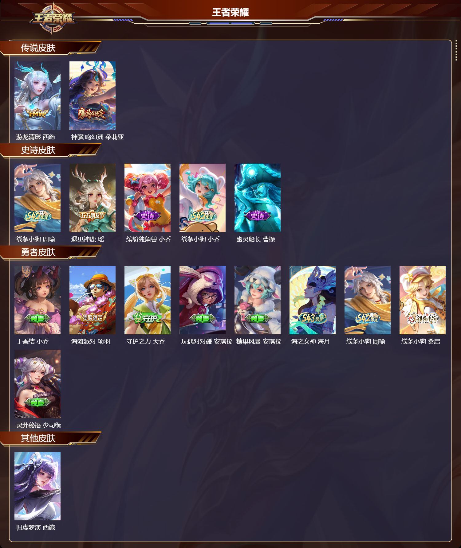 【9,勇者皮肤】,丁香结,小乔,海滩派对,项羽,守护之力,大乔,玩偶对对碰,安琪拉,糖果风暴,安琪拉,海之女神,海月,线条小狗,周瑜,线条小狗,桑启,灵卦秘语,少司缘,