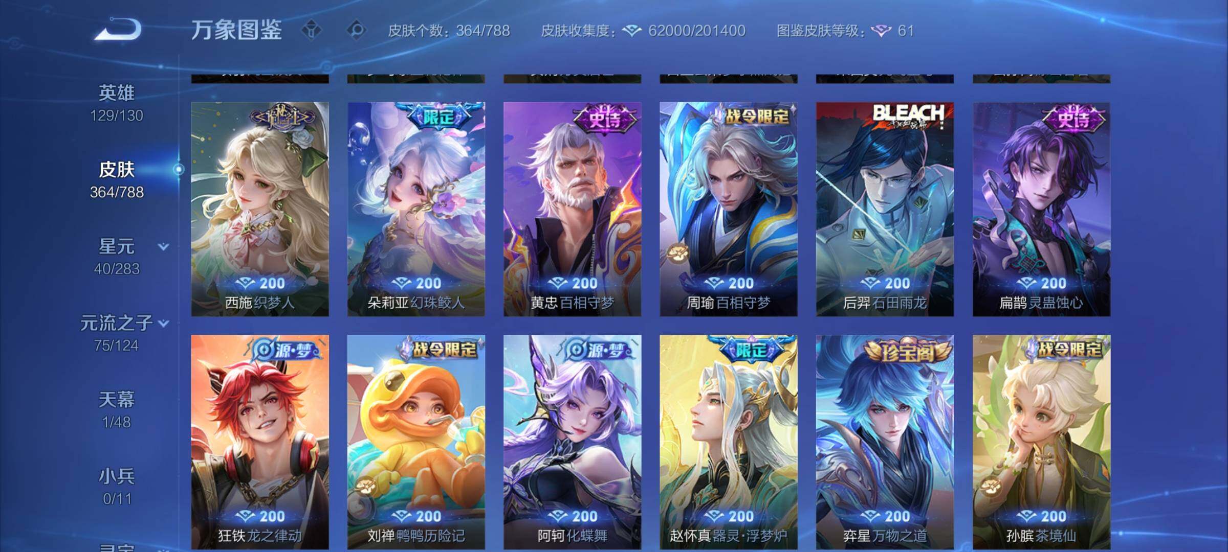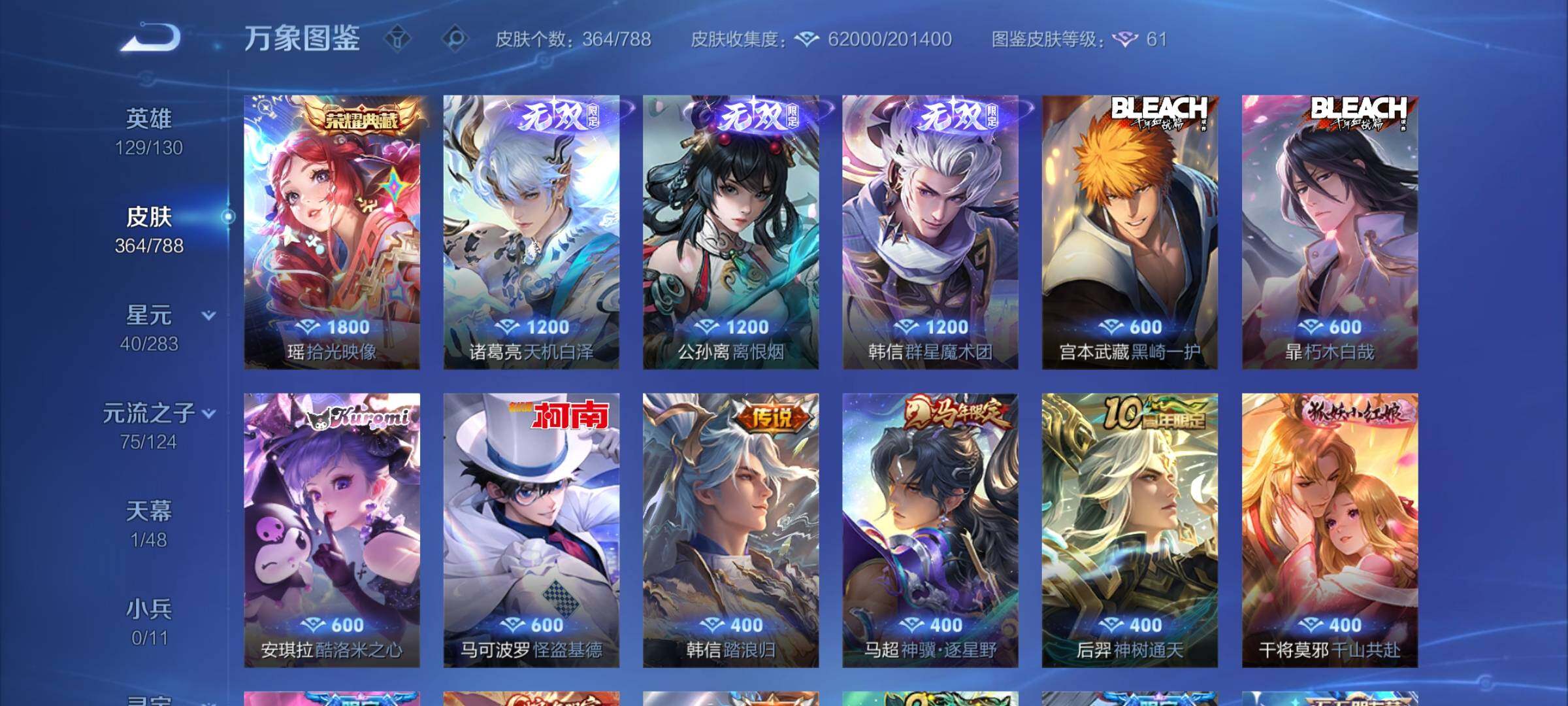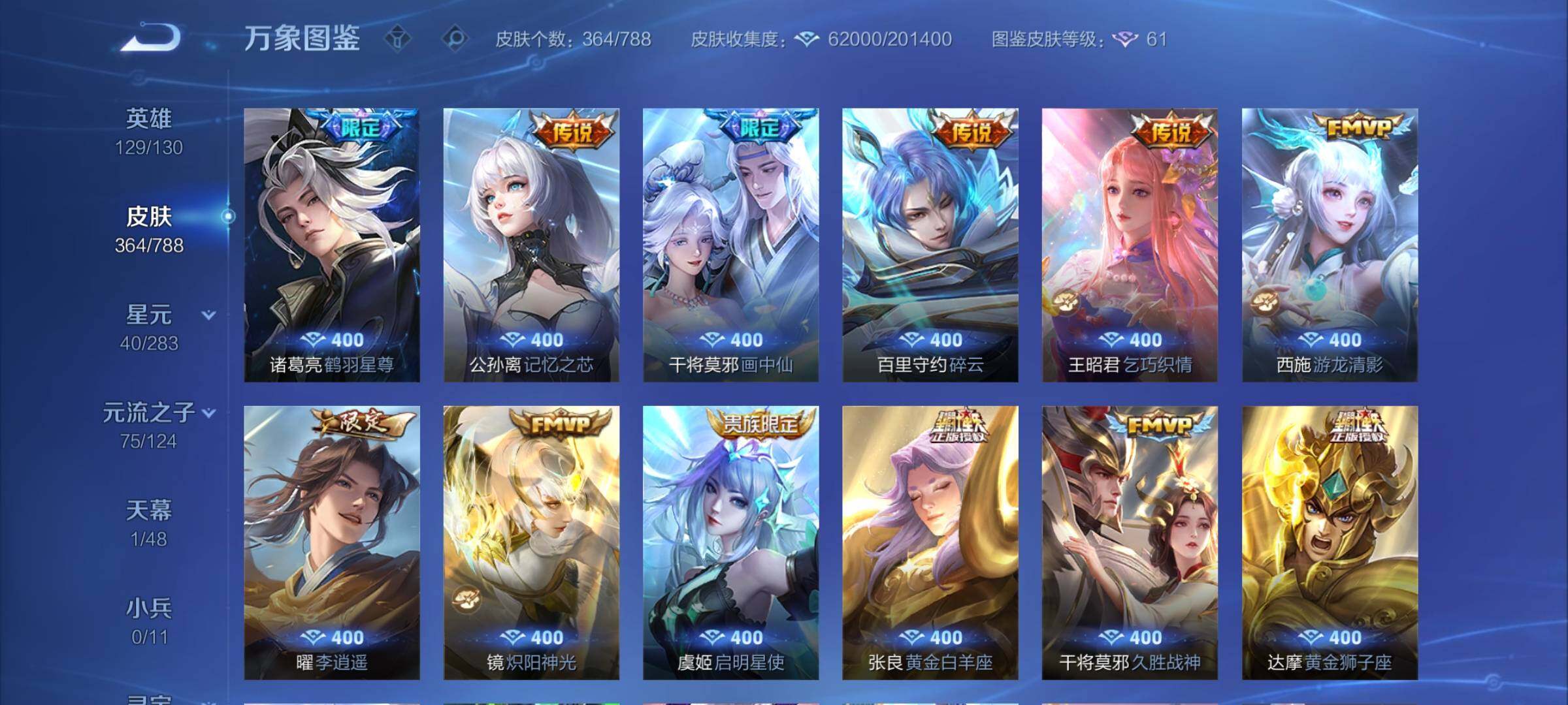 【史诗皮肤】:海月海之女神,周瑜线条小狗,小乔线条小狗,项羽九幽镇关,少司缘巫礼祀神,女娲万灵启世,百里玄策罗小黑战记,莱西奥光弋星穹,公孙离涂山容容,西施织梦人,朵莉亚幻珠鲛人,黄忠百相守梦,周瑜百相守梦,后羿石田雨龙,扁鹊灵蛊蚀心,狂铁龙之律动,刘禅鸭鸭历险记,阿轲化蝶舞,赵怀真器灵浮梦炉,弈星万物之道,孙膑茶境仙,牛魔星界战将,百里守约百相守梦,艾琳陌上桑,李白谪仙醉月,亚连破空之剑,廉颇撼地雄心,姬小满战舞者,大司命东方月初,少司缘涂山红红,暃埋骨钱,蒙犽顽岩魄,蔡文姬夏日便利店,黄忠怒海争锋,镜青焰无极,上官婉儿群星魔术团,鲁班七号蔬乡物语,大乔乘龙忆丹青,安琪拉乘龙聚宝船,姬小满妄想食味,伽罗琥珀纪元,蒙恬荣光圣徽,高渐离燃音魔法,妲己灵卜魔法,阿古朵江河有灵,司空震地狱燃心,赵怀真鹤归松栖,马可波罗山海玄木吟,暃星界游侠,梦奇顽趣,元歌无心,鬼谷子五谷丰年,澜赏金猎手,韩信傲雪梅枪,雅典娜黎明之约,黄忠火炮绅士,嫦娥拒霜思,司马懿暗渊魔法,庄周高山流水,猪八戒猪悟能,孙悟空孙行者,钟馗乐园奇幻夜,沈梦溪月团寄思,杨戬天秀启明,百里玄策热力回旋,米莱狄胡桃异想国,元歌云间偶戏,裴擒虎李小龙,百里玄策原初追逐者,瑶遇见神鹿,不知火舞魅语,娜可露露晚萤,李元芳银河之约,公孙离无限星赏官,狄仁杰鹰眼统帅,伽罗箭羽风息,典韦蓝屏警告,大乔猫狗日记,孙策猫狗日记,阿轲节奏热浪,白起星夜王子,程咬金功夫厨神,李元芳逐浪之夏,刘禅天才门将,蔡文姬舞动绿茵,铠曙光守护者,百里守约特工魅影,安琪拉心灵骇客,雅典娜冰冠公主,亚瑟心灵战警,兰陵王暗隐猎兽者,小乔缤纷独角兽,夏侯惇乘风破浪,韩信逐梦之影,刘邦德古拉伯爵,花木兰水晶猎龙者,赵云引擎之心,孙悟空至尊宝,张飞乱世虎臣,吕布末日机甲,李白千年之狐,曹操幽灵船长,刘禅绅士熊喵,吕布圣诞狂欢,墨子金属风暴,妲己女仆咖啡,妲己魅力维加斯,嬴政摇滚巨星,嬴政暗夜贵公子,孙尚香水果甜心,孙尚香蔷薇恋人,宫本武藏鬼剑武藏,廉颇地狱岩魂,狄仁杰魔术师,王昭君偶像歌手,甄姬冰雪圆舞曲,貂蝉圣诞恋歌,赵云未来纪元,赵云皇家上将,露娜紫霞仙子,项羽苍穹之光,鲁班七号电玩小子
