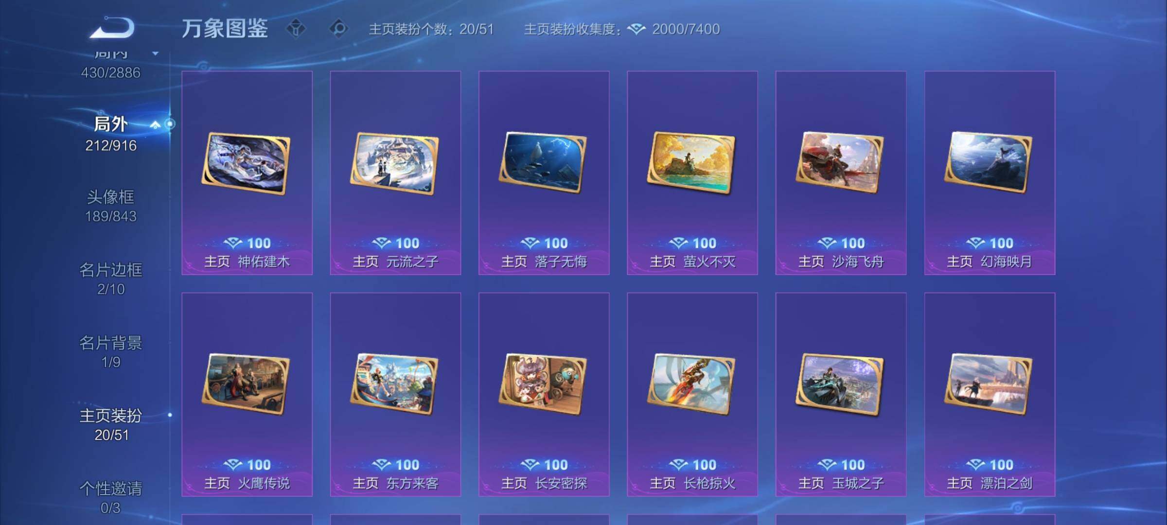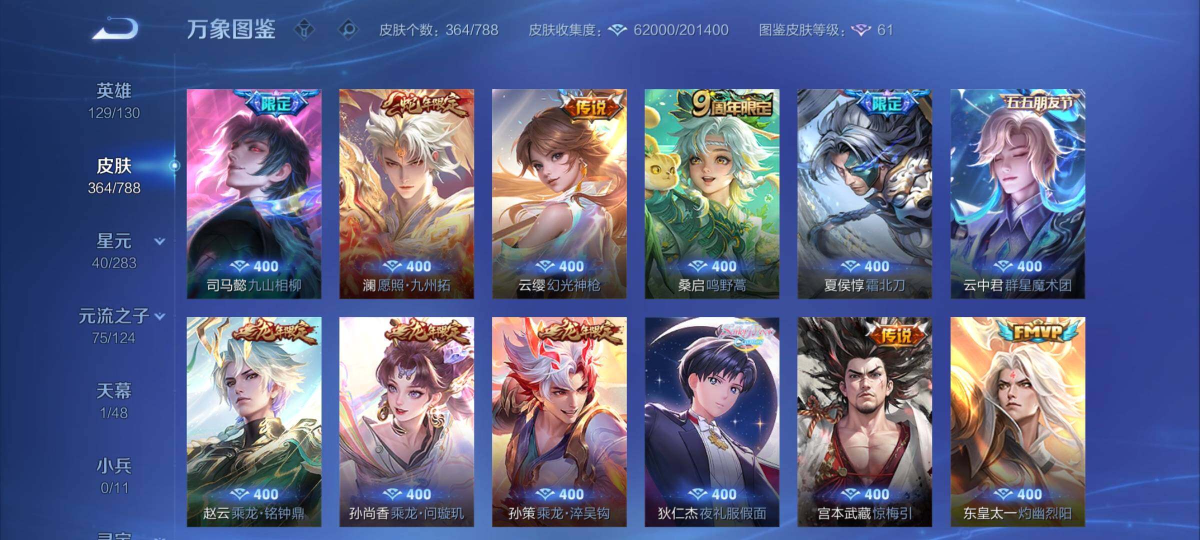 【限定皮肤】:公孙离离恨烟,夏侯惇霜北刀,暃埋骨钱,蒙犽顽岩魄,蔡文姬夏日便利店,虞姬夏日便利店,姜子牙天穹之誓,杨戬破阵退雄兵,李白谪仙醉月,狄仁杰阴阳师,赵云皇家上将,赵云引擎之心,孙尚香蔷薇恋人,庄周高山流水,元歌云间偶戏,元歌无心,典韦蓝屏警告,马可波罗山海玄木吟,狄仁杰魔术师,达摩沙漠行僧,项羽海滩派对,程咬金演武夺筹,韩信逐梦之影,韩信傲雪梅枪,兰陵王金庭之子,孙悟空至尊宝,孙悟空孙行者,李元芳银河之约,李元芳云中旅人,虞姬启明星使,钟馗驱傩正仪,干将莫邪画中仙,雅典娜黎明之约,太乙真人华丽摇滚,鬼谷子五谷丰年,诸葛亮鹤羽星尊,黄忠火炮绅士,苏烈千军破阵,百里玄策原初追逐者,梦奇顽趣,沈梦溪大漠名商,裴擒虎李小龙,裴擒虎擒涛扼浪,米莱狄胡桃异想国,猪八戒猪悟能,嫦娥拒霜思,嫦娥暖冬兔眠,曜李逍遥,,鲁班大师探海日志,桑启海盐诗旅,暃星界游侠,艾琳女武神,艾琳流音漫舞,赵怀真鹤归松栖,司空震地狱燃心,阿古朵江河有灵,张良古海寻踪,狄仁杰夜礼服假面,蒙恬荣光圣徽,高渐离燃音魔法,妲己灵卜魔法,鬼谷子天穹祈灯,伽罗琥珀纪元,姬小满妄想食味,大乔乘龙忆丹青,安琪拉乘龙聚宝船,孙尚香乘龙问璇玑,孙策乘龙淬吴钩,赵云乘龙铭钟鼎,沈梦溪龙舞盛年,鲁班七号蔬乡物语,李元芳蔬乡物语,刘邦剑破天穹,上官婉儿群星魔术团,程咬金群星魔术团,韩信群星魔术团,云中君群星魔术团,镜青焰无极,项羽苍威无极,周瑜熔金海岸