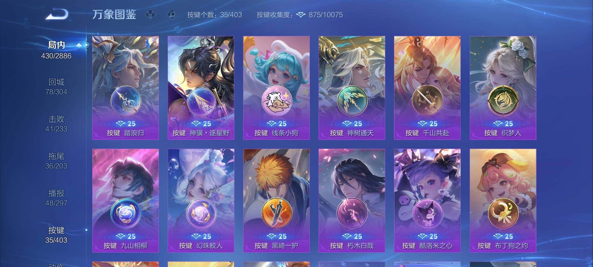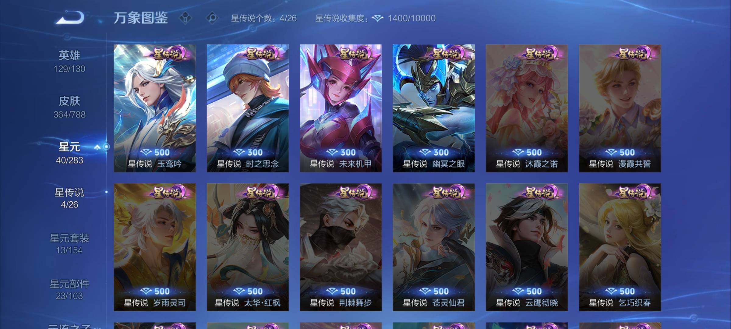 【其他皮肤】:影百相守梦,吕布舞狮寰,兰陵王雾影缉谜,妲己线条小狗,桑启线条小狗,蒙恬苍云破阵,虞姬溯影追猎,蚩奼极光幻客,曹操逐霄之志,艾琳鹤鸣心笺,孙权径山谋武,张良罗小黑战记,明世隐往忆晖光,亚瑟荣光之誓,哪吒罗小黑战记,桑启青衿临川,鬼谷子克喵,莱西奥踏浪烽翎,空空儿戏梦巡演,庄周锦麟游梦,孙策百相守梦,云中君云械蓝图,甄姬逆浪荇歌,白起死霸装,姬小满小满鸭,露娜命运加冕,阿古朵布丁狗之约,张良灵野札记,苏烈春野闲踪,沈梦溪鸭鸭历险记,钟馗虚灵犬护,刘备浪漫序章,戈娅玫蓝誓约,明世隐景韶洛都,少司缘灵卦秘语,达摩爆裂喵拳,姜子牙星梦巡礼,西施雪境奇遇,影魅影绮裳,马超访茗客,典韦铁骨偃魂,太乙真人谧流熔炉,苍苍林狼骑,干将莫邪雾都夜雨,老夫子百相守梦,东皇太一噬灭天穹,盘古敬我三分,孙悟空神迹守卫,虞姬夏日便利店,周瑜熔金海岸,姜子牙天穹之誓,杨戬破阵退雄兵,大司命暗都幽影,项羽苍威无极,程咬金群星魔术团,盘古经纬探寻者,刘邦剑破天穹,扁鹊无尽旅途,李元芳蔬乡物语,钟无艳春野之旅,沈梦溪龙舞盛年,亚瑟鸿运当头,廉颇功夫炙烤,朵莉亚金色潮汐,嫦娥漠中幻影,海诺时空谍影,妲己灵卜魔法,鬼谷子天穹祈灯,后羿完美运算,亚连破局者,海月王牌新星,钟无艳聚星闪耀,张良古海寻踪,艾琳流音漫舞,哪吒热血海滩,李元芳妄想特派,鲁班大师探海日志,莱西奥西部游侠,太乙真人劲辣红锅,裴擒虎擒涛扼浪,赵怀真太极少年,猪八戒潮玩探月行,海月幻泉雾影,嫦娥暖冬兔眠,桑启海盐诗旅,戈娅危途狂花,刘备潮玩造梦师,李元芳云中旅人,蒙恬蔚蓝守将,沈梦溪大漠名商,米莱狄契约魔法,刘禅唤灵魔甲,兰陵王金庭之子,刘邦虎啸剑宗,程咬金无双福将,达摩沙漠行僧,马可波罗潮玩牛仔,苏烈千军破阵,鲁班大师乓乓大师,钟馗驱傩正仪,张良缤纷绘卷,程咬金演武夺筹,刘禅秘密基地,狂铁特工战影,盾山圆桌骑士,哪吒次元突破,姜子牙炽热元素使,沈梦溪鲨炮海盗猫,孙膑归虚梦演,吕布野性能量,小乔丁香结,庄周奇妙博物学,明世隐虹云星官,大乔守护之力,苏烈坚韧之力,太乙真人华丽摇滚,鬼谷子幻乐之宴,李白敏锐之力,诸葛亮掌控之力,孙尚香沉稳之力,牛魔制霸全明星,老夫子功夫老勺,狂铁命运角斗场,钟无艳海滩丽影,关羽龙腾万里,刘备汉昭烈帝,刘备纽约教父,狄仁杰阴阳师,后羿阿尔法小队,宫本武藏万象初新,刘备万事如意,甄姬花好人间,张飞五福同心,花木兰兔女郎,达摩拳王,亚瑟死亡骑士,典韦黄金武士,姜子牙时尚教父,孙膑天使之翼,安琪拉玩偶对对碰,宫本武藏未来纪元,扁鹊化身博士,牛魔西部大镖客,白起白色死神,程咬金星际陆战队,艾琳女武神,芈月红桃皇后,赵云忍炎影,赵云白执事,露娜哥特玫瑰,韩信街头霸王,韩信教廷特使,项羽海滩派对,暃碧珀绯影,金蝉前尘,云缨赤焰之缨,司空震启蛰,澜孤猎,阿古朵熊喵少女,蒙恬秩序猎龙将,镜冰刃幻境,蒙犽归虚梦演,鲁班大师归虚梦演,西施归虚梦演,马超幸存者,曜归虚梦演,盘古创世神祝,嫦娥露花倒影,李信灼热之刃,沈梦溪棒球奇才,伽罗花见巫女,盾山极冰防御线,司马懿魇语军师,元歌午夜歌剧院,米莱狄精准探案法,弈星踏雪寻梅,裴擒虎街头旋风,杨玉环霓裳曲,公孙离花间舞,女娲尼罗河女神,梦奇美梦成真,苏烈爱与和平,百里玄策威尼斯狂欢,百里守约绝影神枪,铠龙域领主,鬼谷子阿摩司公爵,干将莫邪第七人偶,东皇太一东海龙王,大乔伊势巫女,黄忠芝加哥教父,苍维京掠夺者,马可波罗激情绿茵,虞姬加勒比小姐,刘邦圣殿之光,李元芳特种部队,钟馗地府判官,兰陵王隐刃,小乔万圣前夜,曹操超能战警,老夫子潮流仙人,项羽帝国元帅,高渐离金属狂潮,鲁班七号木偶奇遇记