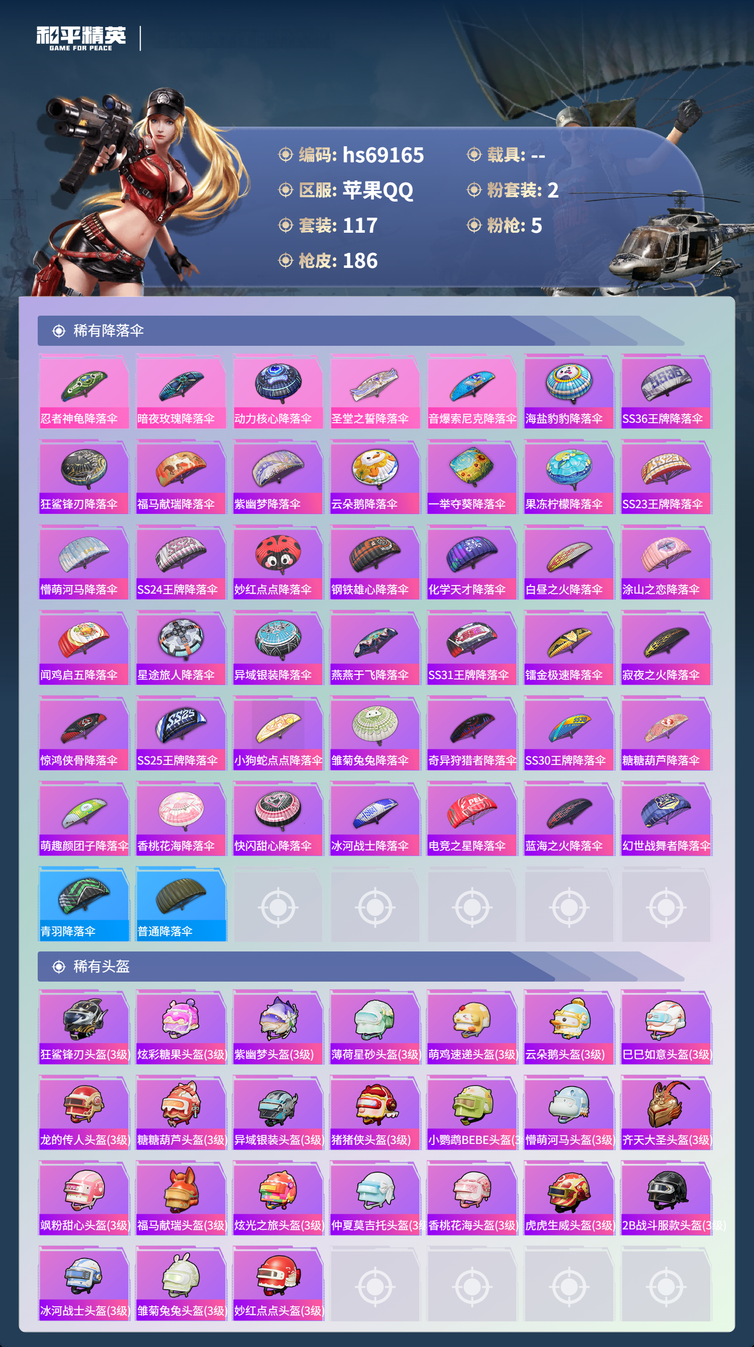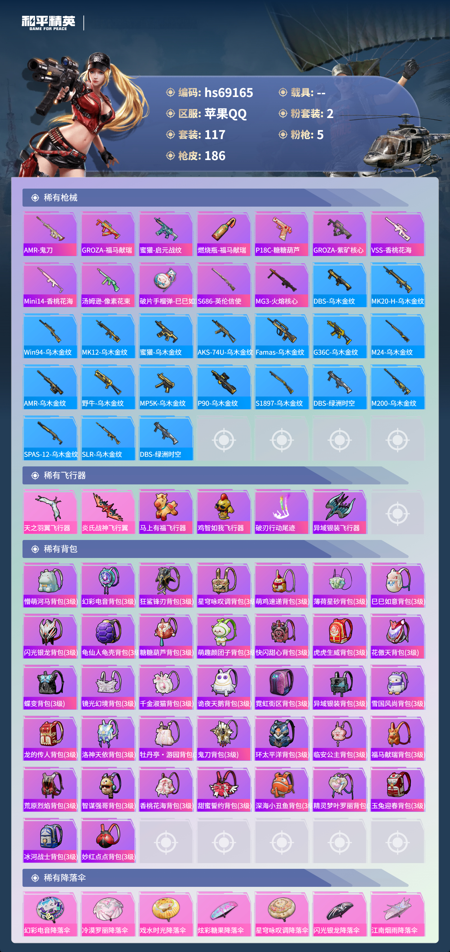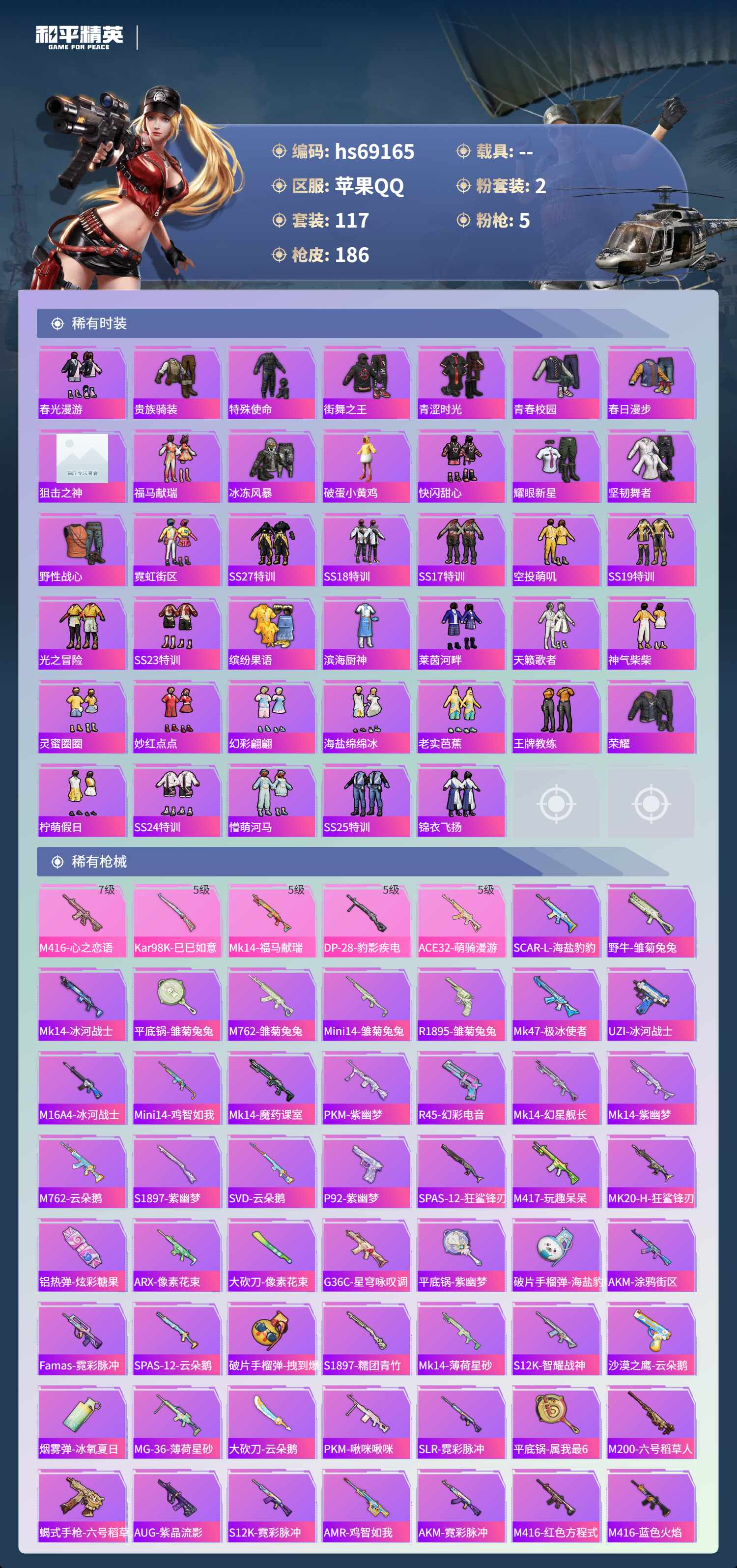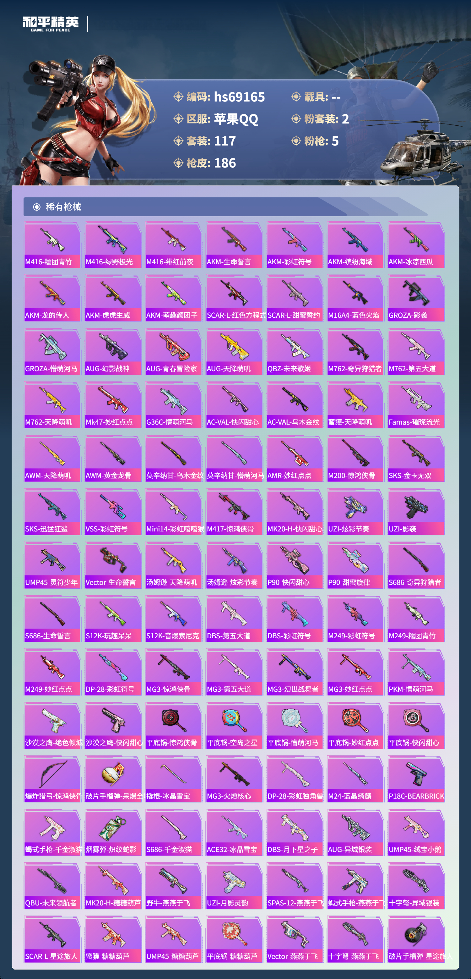 【185稀有枪械】M416-心之恋语/7级,Kar98K-巳巳如意/5级,Mk14-福马献瑞/5级,DP-28-豹影疾电/5级,ACE32-萌骑漫游/5级,DBS-乌木金纹,SCAR-L-海盐豹豹,野牛-雏菊兔兔,Mk14-冰河战士,平底锅-雏菊兔兔,M762-雏菊兔兔,Mini14-雏菊兔兔,R1895-雏菊兔兔,Mk47-极冰使者,UZI-冰河战士,M16A4-冰河战士,MK20-H-乌木金纹,Mini14-鸡智如我,Win94-乌木金纹,MK12-乌木金纹,Mk14-魔药课室,PKM-紫幽梦,R45-幻彩电音,Mk14-幻星舰长,Mk14-紫幽梦,蜜獾-乌木金纹,M762-云朵鹅,S1897-紫幽梦,SVD-云朵鹅,P92-紫幽梦,SPAS-12-狂鲨锋刃,M417-玩趣呆呆,MK20-H-狂鲨锋刃,铝热弹-炫彩糖果,ARX-像素花束,大砍刀-像素花束,G36C-星穹咏叹调,平底锅-紫幽梦,破片手榴弹-海盐豹豹,AKS-74U-乌木金纹,AKM-涂鸦街区,Famas-乌木金纹,Famas-霓彩脉冲,SPAS-12-云朵鹅,破片手榴弹-拽到爆炸,S1897-糯团青竹,Mk14-薄荷星砂,S12K-智耀战神,沙漠之鹰-云朵鹅,烟雾弹-冰氧夏日,MG-36-薄荷星砂,大砍刀-云朵鹅,PKM-啾咪啾咪,SLR-霓彩脉冲,平底锅-属我最6,M200-六号稻草人,蝎式手枪-六号稻草人,AUG-紫晶流影,S12K-霓彩脉冲,AMR-鸡智如我,AKM-霓彩脉冲,M416-红色方程式,M416-蓝色火焰,M416-糯团青竹,M416-绿野极光,M416-绯红前夜,AKM-生命誓言,AKM-彩虹符号,AKM-缤纷海域,AKM-冰凉西瓜,AKM-龙的传人,AKM-虎虎生威,AKM-萌趣颜团子,SCAR-L-红色方程式,SCAR-L-甜蜜誓约,M16A4-蓝色火焰,GROZA-影袭,GROZA-懵萌河马,AUG-幻影战神,AUG-青春冒险家,AUG-天降萌叽,QBZ-未来歌姬,M762-奇异狩猎者,M762-第五大道,M762-天降萌叽,Mk47-妙红点点,G36C-乌木金纹,G36C-懵萌河马,AC-VAL-快闪甜心,AC-VAL-乌木金纹,蜜獾-天降萌叽,Famas-璀璨流光,M24-乌木金纹,AWM-天降萌叽,AWM-黄金龙骨,莫辛纳甘-乌木金纹,莫辛纳甘-懵萌河马,AMR-乌木金纹,AMR-妙红点点,M200-惊鸿侠骨,SKS-金玉无双,SKS-迅猛狂鲨,VSS-彩虹符号,Mini14-彩虹嘻嘻猴,M417-惊鸿侠骨,MK20-H-快闪甜心,UZI-炫彩节奏,UZI-影袭,UMP45-灵符少年,Vector-生命誓言,汤姆逊-天降萌叽,汤姆逊-炫彩节奏,野牛-乌木金纹,MP5K-乌木金纹,P90-乌木金纹,P90-快闪甜心,P90-甜蜜旋律,S686-奇异狩猎者,S686-生命誓言,S1897-乌木金纹,S12K-玩趣呆呆,S12K-音爆索尼克,DBS-第五大道,DBS-彩虹符号,M249-彩虹符号,M249-糯团青竹,M249-妙红点点,DP-28-彩虹符号,MG3-惊鸿侠骨,MG3-第五大道,MG3-幻世战舞者,MG3-妙红点点,PKM-懵萌河马,沙漠之鹰-绝色倾城,沙漠之鹰-快闪甜心,平底锅-惊鸿侠骨,平底锅-空岛之星,平底锅-懵萌河马,平底锅-妙红点点,平底锅-快闪甜心,爆炸猎弓-惊鸿侠骨,破片手榴弹-呆爆全场,撬棍-冰晶雪宝,DBS-绿洲时空,MG3-火熔核心,DP-28-彩虹独角兽,M24-蓝晶绮麟,P18C-BEARBRICK,蝎式手枪-千金淑猫,烟雾弹-炽纹蛇影,S686-千金淑猫,ACE32-冰晶雪宝,DBS-月下星之子,AUG-异域银装,UMP45-绒宝小鹅,QBU-未来领航者,MK20-H-糖糖葫芦,野牛-燕燕于飞,UZI-月影灵韵,M200-乌木金纹,SPAS-12-燕燕于飞,蝎式手枪-燕燕于飞,十字弩-异域银装,SCAR-L-星途旅人,蜜獾-糖糖葫芦,UMP45-糖糖葫芦,SPAS-12-乌木金纹,平底锅-糖糖葫芦,Vector-燕燕于飞,十字弩-燕燕于飞,破片手榴弹-星途旅人,AMR-鬼刀,GROZA-福马献瑞,蜜獾-启元战纹,SLR-乌木金纹,燃烧瓶-福马献瑞,P18C-糖糖葫芦,GROZA-紫矿核心,VSS-香桃花海,Mini14-香桃花海,汤姆逊-像素花束,破片手榴弹-巳巳如意,S686-英伦信使,DBS-绿洲时空,MG3-火熔核心