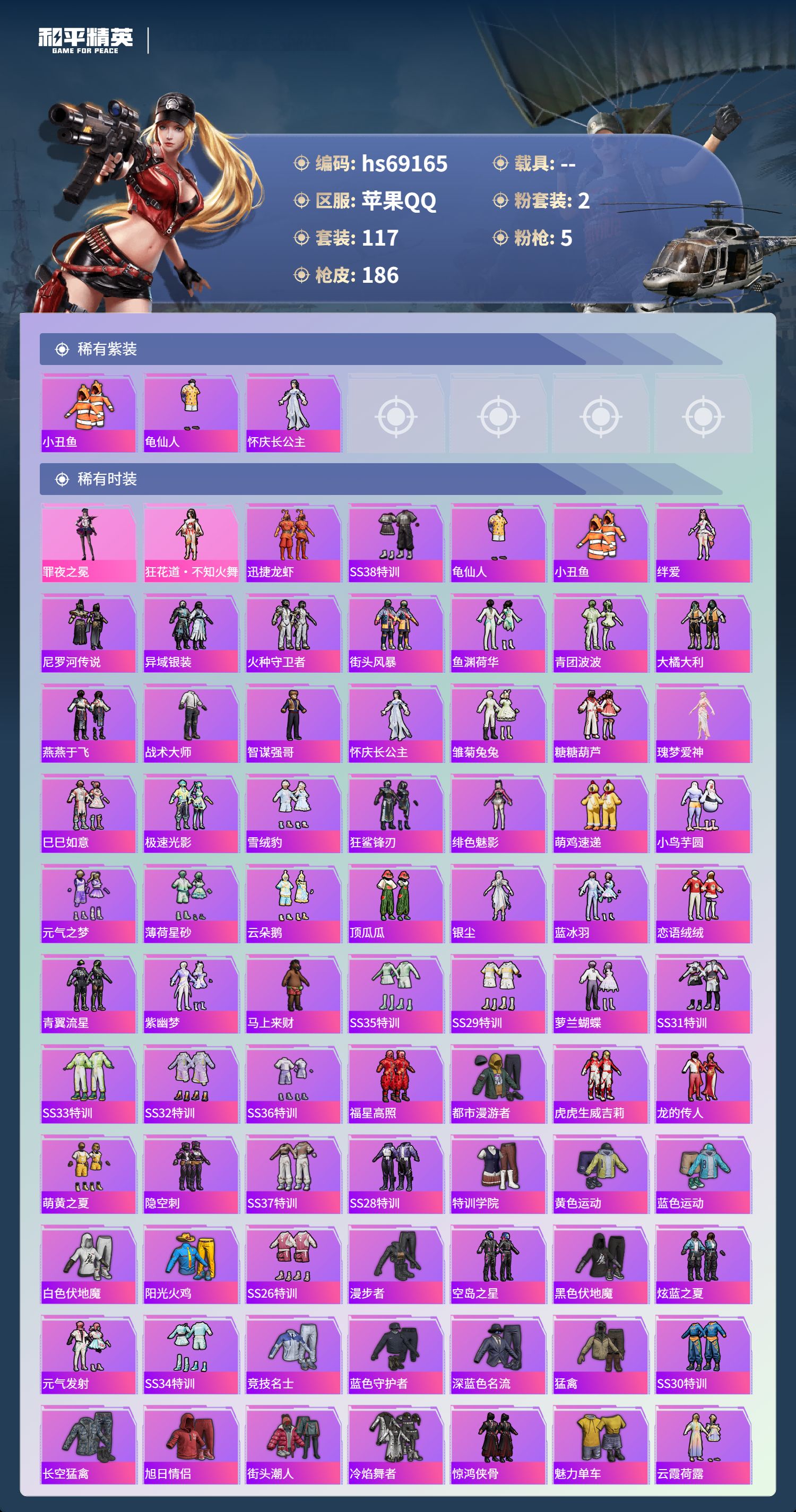 【117稀有时装】罪夜之冕,狂花道·不知火舞,迅捷龙虾,SS38特训,龟仙人,小丑鱼,绊爱,尼罗河传说,异域银装,火种守卫者,街头风暴,鱼渊荷华,青团波波,大橘大利,燕燕于飞,战术大师,智谋强哥,怀庆长公主,雏菊兔兔,糖糖葫芦,瑰梦爱神,巳巳如意,极速光影,雪绒豹,狂鲨锋刃,绯色魅影,萌鸡速递,小鸟芋圆,元气之梦,薄荷星砂,云朵鹅,顶瓜瓜,银尘,蓝冰羽,恋语绒绒,青翼流星,紫幽梦,马上来财,SS35特训,SS29特训,萝兰蝴蝶,SS31特训,SS33特训,SS32特训,SS36特训,福星高照,都市漫游者,虎虎生威吉莉,龙的传人,萌黄之夏,隐空刺,SS37特训,SS28特训,特训学院,黄色运动,蓝色运动,白色伏地魔,阳光火鸡,SS26特训,漫步者,空岛之星,黑色伏地魔,炫蓝之夏,元气发射,SS34特训,竞技名士,蓝色守护者,深蓝色名流,猛禽,SS30特训,长空猛禽,旭日情侣,街头潮人,冷焰舞者,惊鸿侠骨,魅力单车,云霞荷露,春光漫游,贵族骑装,特殊使命,街舞之王,青涩时光,青春校园,春日漫步,狙击之神,福马献瑞,冰冻风暴,破蛋小黄鸡,快闪甜心,耀眼新星,坚韧舞者,野性战心,霓虹街区,SS27特训,SS18特训,SS17特训,空投萌叽,SS19特训,光之冒险,SS23特训,缤纷果语,滨海厨神,莱茵河畔,天籁歌者,神气柴柴,灵蜜圈圈,妙红点点,幻彩翩翩,海盐绵绵冰,老实芭蕉,王牌教练,荣耀,柠萌假日,SS24特训,懵萌河马,SS25特训,锦衣飞扬