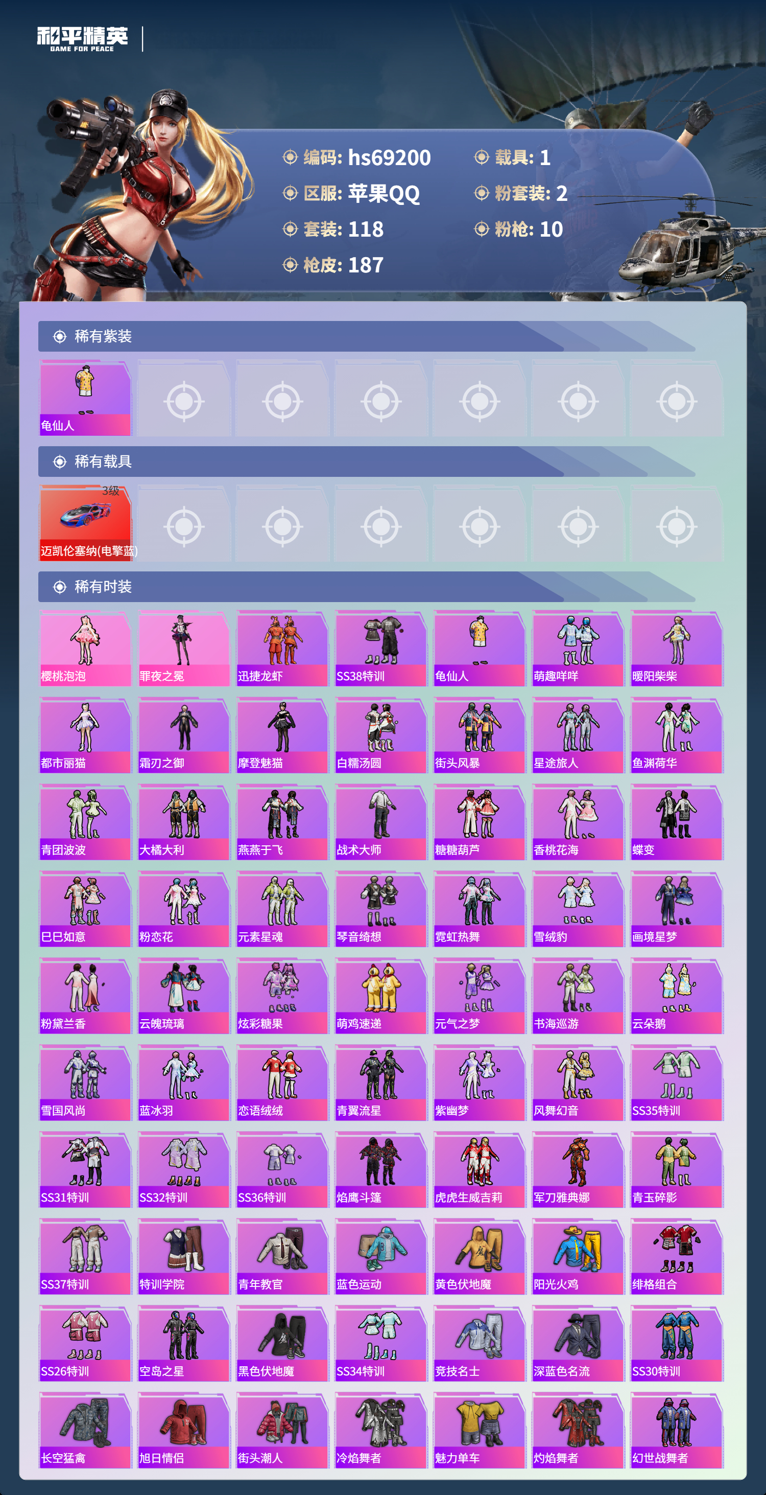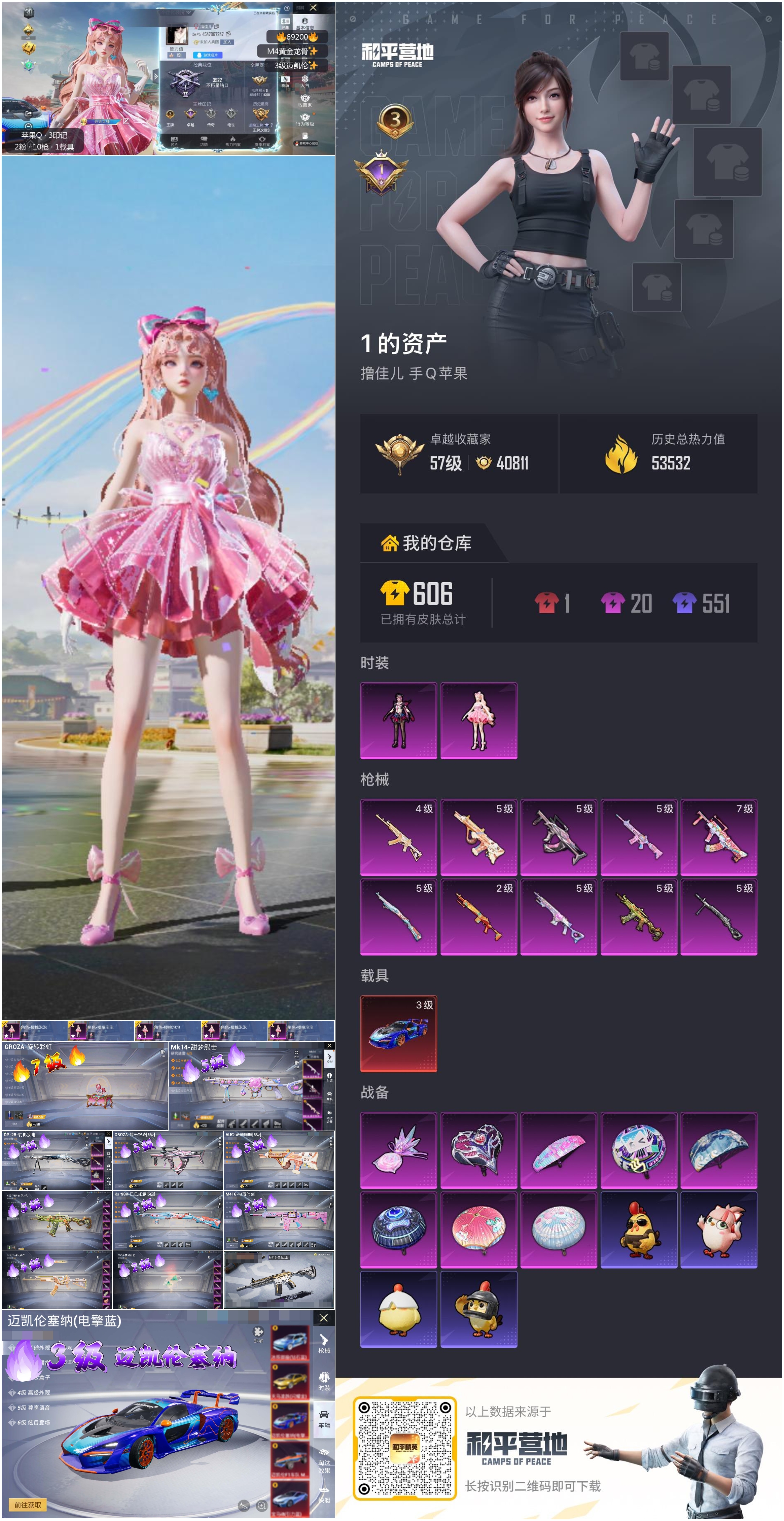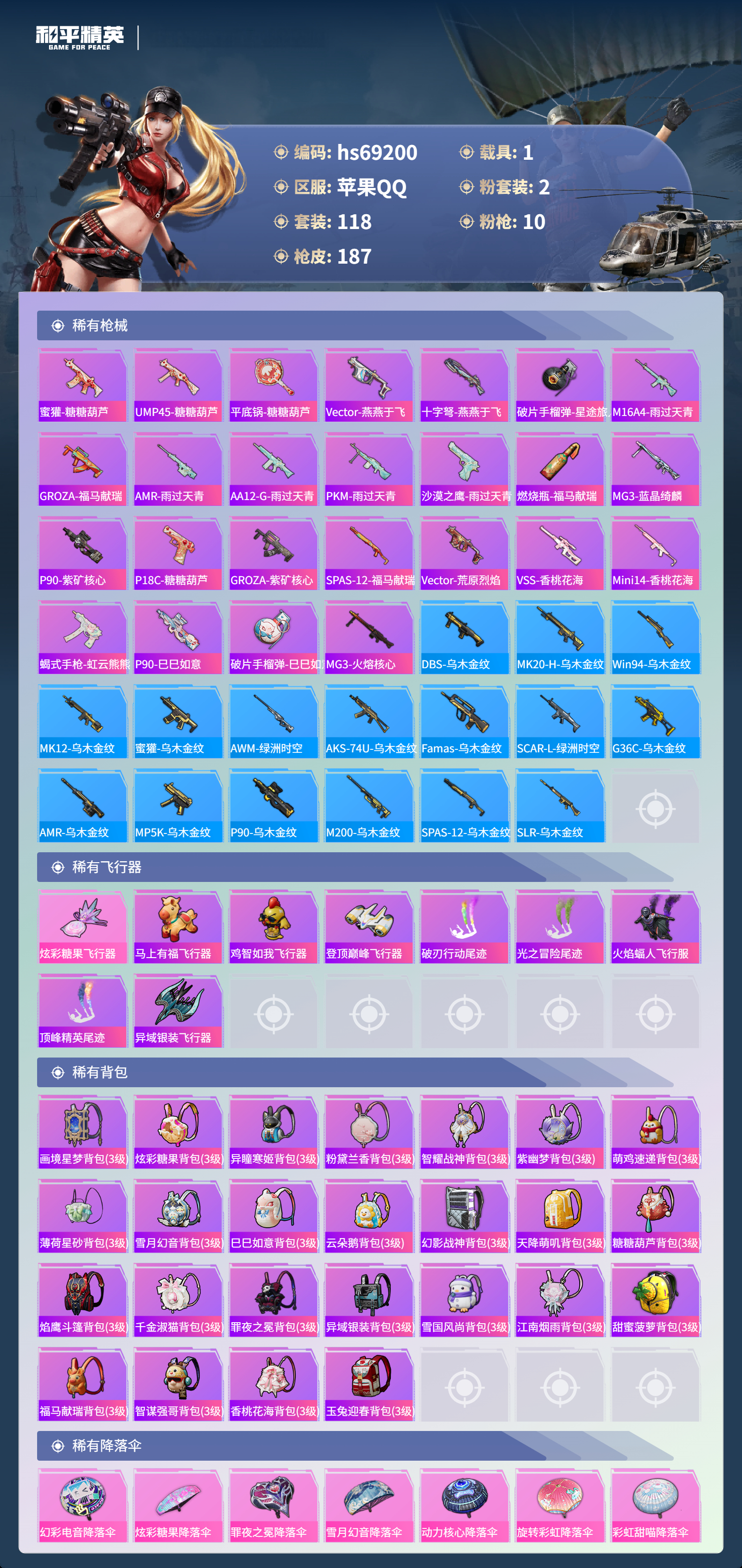 PX_2562271-,苹果手Q-3王牌印记-2粉装-10特效枪-1载具-53532热力值-118套装-187枪皮-1卓越印记