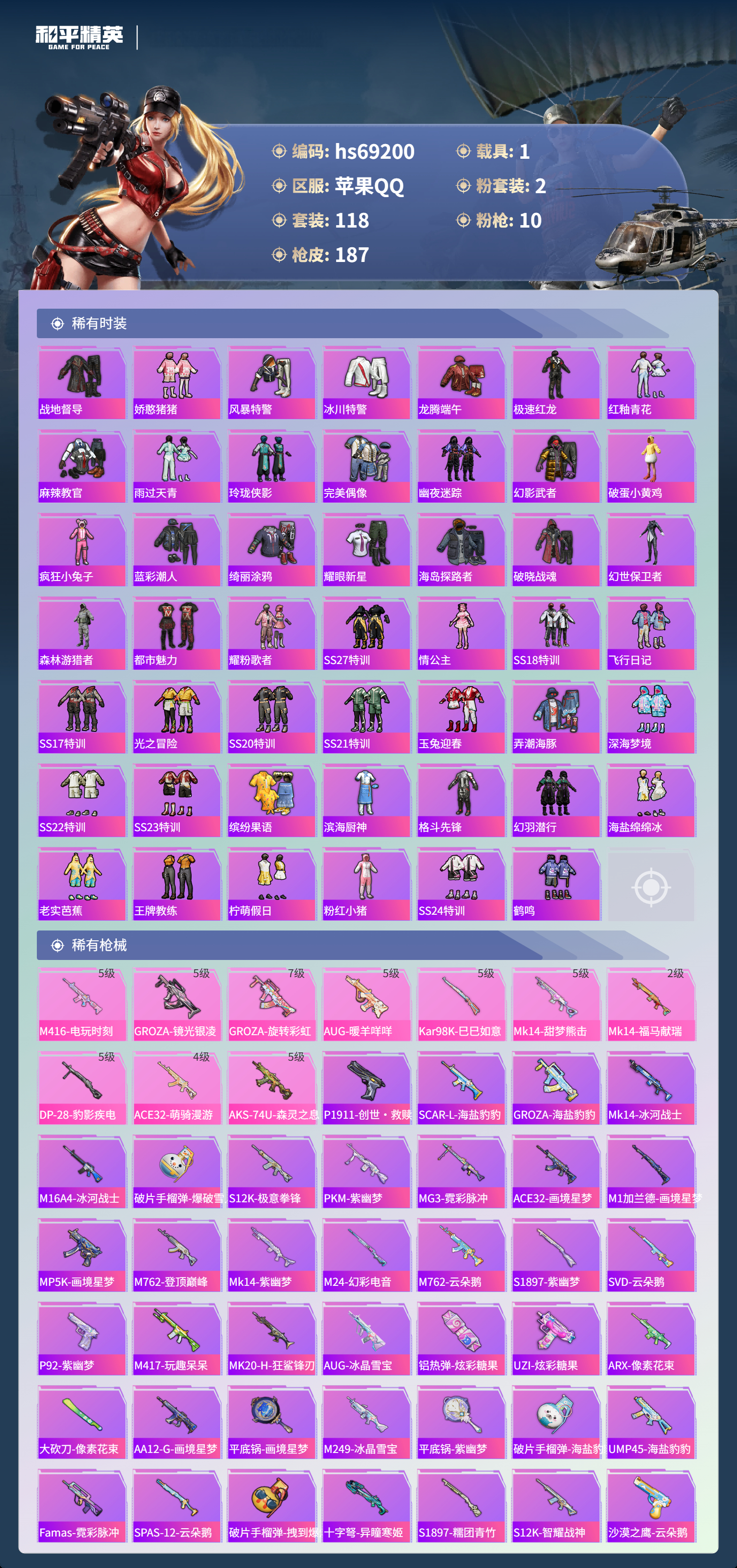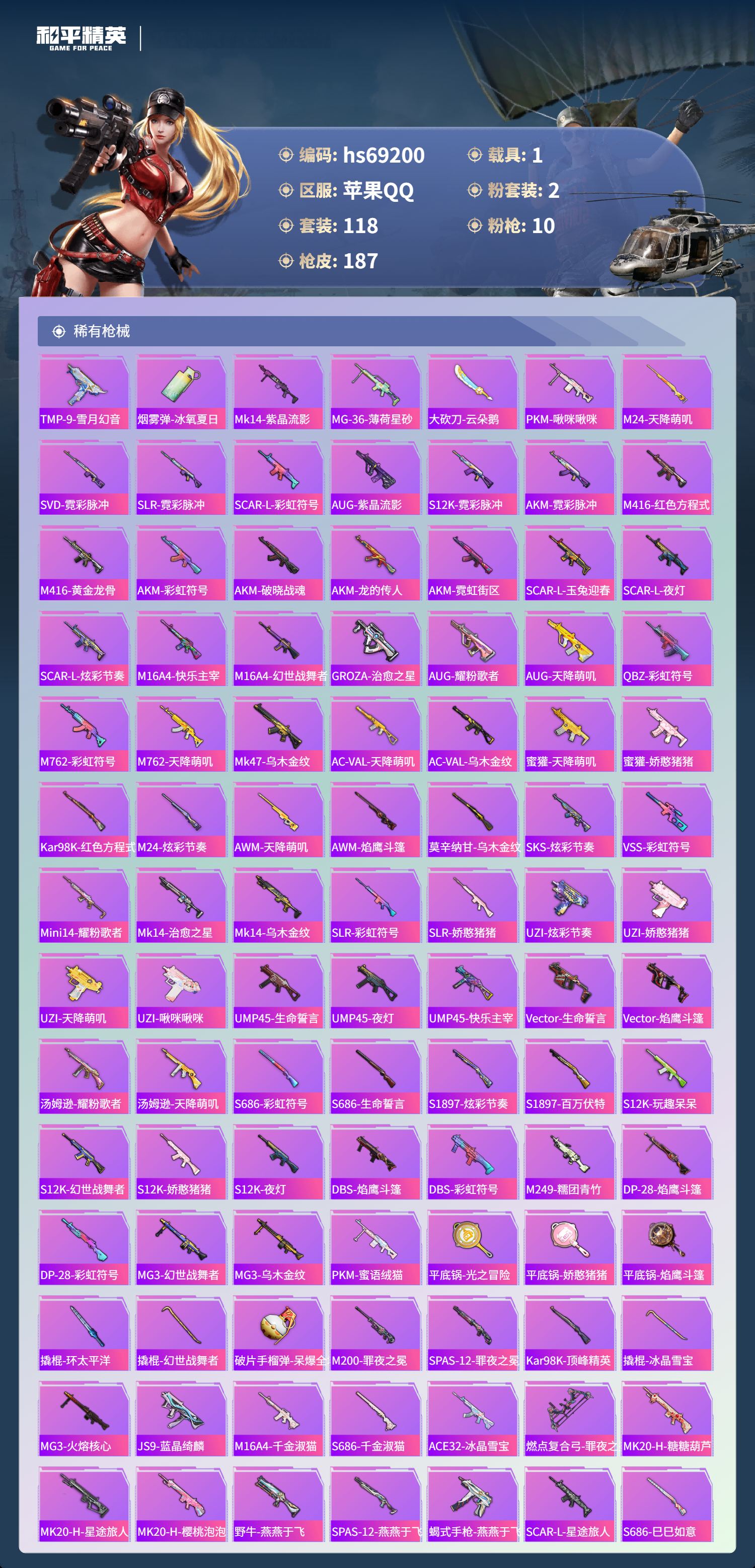 【188稀有枪械】M416-电玩时刻/5级,GROZA-镜光银凌/5级,GROZA-旋转彩虹/7级,AUG-暖羊咩咩/5级,Kar98K-巳巳如意/5级,Mk14-甜梦熊击/5级,Mk14-福马献瑞/2级,DP-28-豹影疾电/5级,ACE32-萌骑漫游/4级,AKS-74U-森灵之息/5级,DBS-乌木金纹,P1911-创世·救赎,SCAR-L-海盐豹豹,GROZA-海盐豹豹,Mk14-冰河战士,M16A4-冰河战士,MK20-H-乌木金纹,Win94-乌木金纹,MK12-乌木金纹,破片手榴弹-爆破雪人,S12K-极意拳锋,PKM-紫幽梦,MG3-霓彩脉冲,ACE32-画境星梦,M1加兰德-画境星梦,MP5K-画境星梦,M762-登顶巅峰,Mk14-紫幽梦,M24-幻彩电音,蜜獾-乌木金纹,M762-云朵鹅,S1897-紫幽梦,SVD-云朵鹅,P92-紫幽梦,AWM-绿洲时空,M417-玩趣呆呆,MK20-H-狂鲨锋刃,AUG-冰晶雪宝,铝热弹-炫彩糖果,UZI-炫彩糖果,ARX-像素花束,大砍刀-像素花束,AA12-G-画境星梦,平底锅-画境星梦,M249-冰晶雪宝,平底锅-紫幽梦,破片手榴弹-海盐豹豹,UMP45-海盐豹豹,AKS-74U-乌木金纹,Famas-乌木金纹,Famas-霓彩脉冲,SPAS-12-云朵鹅,破片手榴弹-拽到爆炸,十字弩-异瞳寒姬,S1897-糯团青竹,S12K-智耀战神,沙漠之鹰-云朵鹅,TMP-9-雪月幻音,烟雾弹-冰氧夏日,Mk14-紫晶流影,MG-36-薄荷星砂,SCAR-L-绿洲时空,大砍刀-云朵鹅,PKM-啾咪啾咪,M24-天降萌叽,SVD-霓彩脉冲,SLR-霓彩脉冲,SCAR-L-彩虹符号,AUG-紫晶流影,S12K-霓彩脉冲,AKM-霓彩脉冲,M416-红色方程式,M416-黄金龙骨,AKM-彩虹符号,AKM-破晓战魂,AKM-龙的传人,AKM-霓虹街区,SCAR-L-玉兔迎春,SCAR-L-夜灯,SCAR-L-炫彩节奏,M16A4-快乐主宰,M16A4-幻世战舞者,GROZA-治愈之星,AUG-耀粉歌者,AUG-天降萌叽,QBZ-彩虹符号,M762-彩虹符号,M762-天降萌叽,Mk47-乌木金纹,G36C-乌木金纹,AC-VAL-天降萌叽,AC-VAL-乌木金纹,蜜獾-天降萌叽,蜜獾-娇憨猪猪,Kar98K-红色方程式,M24-炫彩节奏,AWM-天降萌叽,AWM-焰鹰斗篷,莫辛纳甘-乌木金纹,AMR-乌木金纹,SKS-炫彩节奏,VSS-彩虹符号,Mini14-耀粉歌者,Mk14-治愈之星,Mk14-乌木金纹,SLR-彩虹符号,SLR-娇憨猪猪,UZI-炫彩节奏,UZI-娇憨猪猪,UZI-天降萌叽,UZI-啾咪啾咪,UMP45-生命誓言,UMP45-夜灯,UMP45-快乐主宰,Vector-生命誓言,Vector-焰鹰斗篷,汤姆逊-耀粉歌者,汤姆逊-天降萌叽,MP5K-乌木金纹,P90-乌木金纹,S686-彩虹符号,S686-生命誓言,S1897-炫彩节奏,S1897-百万伏特,S12K-玩趣呆呆,S12K-幻世战舞者,S12K-娇憨猪猪,S12K-夜灯,DBS-焰鹰斗篷,DBS-彩虹符号,M249-糯团青竹,DP-28-焰鹰斗篷,DP-28-彩虹符号,MG3-幻世战舞者,MG3-乌木金纹,PKM-蜜语绒猫,平底锅-光之冒险,平底锅-娇憨猪猪,平底锅-焰鹰斗篷,撬棍-环太平洋,撬棍-幻世战舞者,破片手榴弹-呆爆全场,M200-罪夜之冕,SPAS-12-罪夜之冕,Kar98K-顶峰精英,撬棍-冰晶雪宝,MG3-火熔核心,JS9-蓝晶绮麟,M16A4-千金淑猫,S686-千金淑猫,ACE32-冰晶雪宝,燃点复合弓-罪夜之冕,MK20-H-糖糖葫芦,MK20-H-星途旅人,MK20-H-樱桃泡泡,野牛-燕燕于飞,M200-乌木金纹,SPAS-12-燕燕于飞,蝎式手枪-燕燕于飞,SCAR-L-星途旅人,S686-巳巳如意,蜜獾-糖糖葫芦,UMP45-糖糖葫芦,SPAS-12-乌木金纹,平底锅-糖糖葫芦,Vector-燕燕于飞,十字弩-燕燕于飞,破片手榴弹-星途旅人,M16A4-雨过天青,GROZA-福马献瑞,AMR-雨过天青,SLR-乌木金纹,AA12-G-雨过天青,PKM-雨过天青,沙漠之鹰-雨过天青,燃烧瓶-福马献瑞,MG3-蓝晶绮麟,P90-紫矿核心,P18C-糖糖葫芦,GROZA-紫矿核心,SPAS-12-福马献瑞,Vector-荒原烈焰,VSS-香桃花海,Mini14-香桃花海,蝎式手枪-虹云熊熊,P90-巳巳如意,破片手榴弹-巳巳如意,MG3-火熔核心