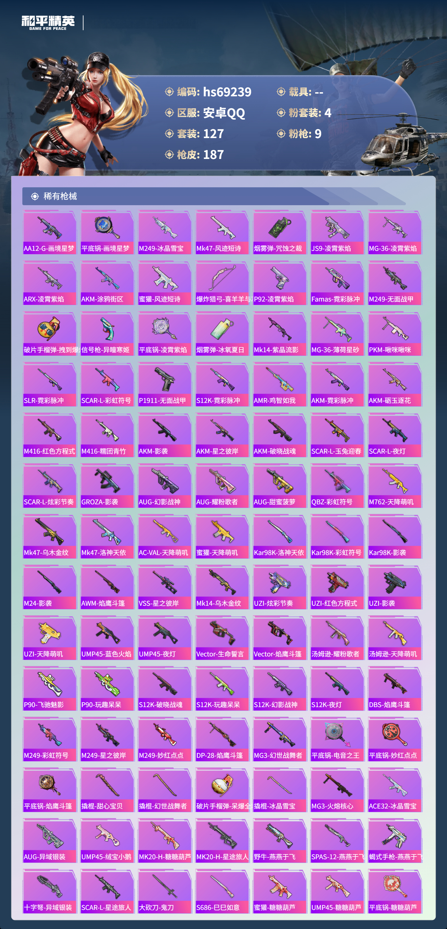 【182稀有枪械】M416-电玩时刻/5级,GROZA-镜光银凌/5级,AUG-暖羊咩咩/5级,Kar98K-巳巳如意/5级,Mk14-福马献瑞/5级,Mk14-樱桃泡泡/7级,UMP45-萌骑冒险/5级,DP-28-豹影疾电/5级,AKS-74U-森灵之息/5级,突击盾牌-初号机,觉醒Ver.,SCAR-L-海盐豹豹,野牛-雏菊兔兔,蝎式手枪-金丰海韵,Mk14-冰河战士,平底锅-雏菊兔兔,M762-雏菊兔兔,Mini14-雏菊兔兔,R1895-雏菊兔兔,UZI-冰河战士,M16A4-冰河战士,MK20-H-乌木金纹,DBS-风迹短诗,莫辛纳甘-风迹短诗,Win94-乌木金纹,MK12-风迹短诗,M24-快狙起手(快手),MK12-乌木金纹,破片手榴弹-爆破雪人,PKM-紫幽梦,ACE32-画境星梦,M1加兰德-画境星梦,MP5K-画境星梦,M762-登顶巅峰,Mk14-紫幽梦,蜜獾-乌木金纹,S1897-紫幽梦,蜜獾-绯穹魔姬,AWM-绿洲时空,SPAS-12-狂鲨锋刃,MK20-H-狂鲨锋刃,AUG-冰晶雪宝,突击盾牌-绝对恒星,铝热弹-炫彩糖果,UZI-炫彩糖果,ARX-像素花束,UMP45-极意拳锋,大砍刀-像素花束,AA12-G-画境星梦,平底锅-画境星梦,M249-冰晶雪宝,Mk47-风迹短诗,烟雾弹-咒蚀之裁,JS9-凌霄紫焰,MG-36-凌霄紫焰,ARX-凌霄紫焰,AKS-74U-乌木金纹,AKM-涂鸦街区,蜜獾-风迹短诗,爆炸猎弓-喜羊羊与灰太狼,P92-凌霄紫焰,Famas-乌木金纹,Famas-霓彩脉冲,M249-无面战甲,破片手榴弹-拽到爆炸,信号枪-异瞳寒姬,平底锅-凌霄紫焰,烟雾弹-冰氧夏日,Mk14-紫晶流影,MG-36-薄荷星砂,SCAR-L-绿洲时空,PKM-啾咪啾咪,SLR-霓彩脉冲,SCAR-L-彩虹符号,P1911-无面战甲,S12K-霓彩脉冲,AMR-鸡智如我,AKM-霓彩脉冲,AKM-砺玉逐花,M416-红色方程式,M416-糯团青竹,AKM-影袭,AKM-星之彼岸,AKM-破晓战魂,SCAR-L-玉兔迎春,SCAR-L-夜灯,SCAR-L-炫彩节奏,GROZA-影袭,AUG-幻影战神,AUG-耀粉歌者,AUG-甜蜜菠萝,QBZ-彩虹符号,M762-天降萌叽,Mk47-乌木金纹,Mk47-洛神天依,AC-VAL-天降萌叽,蜜獾-天降萌叽,Kar98K-洛神天依,Kar98K-彩虹符号,Kar98K-影袭,M24-乌木金纹,M24-影袭,AWM-焰鹰斗篷,AMR-乌木金纹,VSS-星之彼岸,Mk14-乌木金纹,UZI-炫彩节奏,UZI-红色方程式,UZI-影袭,UZI-天降萌叽,UMP45-蓝色火焰,UMP45-夜灯,Vector-生命誓言,Vector-焰鹰斗篷,汤姆逊-耀粉歌者,汤姆逊-天降萌叽,野牛-乌木金纹,MP5K-乌木金纹,P90-乌木金纹,P90-飞驰魅影,P90-玩趣呆呆,S12K-破晓战魂,S12K-玩趣呆呆,S12K-幻影战神,S12K-夜灯,DBS-焰鹰斗篷,M249-彩虹符号,M249-星之彼岸,M249-妙红点点,DP-28-焰鹰斗篷,MG3-幻世战舞者,平底锅-电音之王,平底锅-妙红点点,平底锅-焰鹰斗篷,撬棍-甜心宝贝,撬棍-幻世战舞者,破片手榴弹-呆爆全场,撬棍-冰晶雪宝,DBS-绿洲时空,MG3-火熔核心,ACE32-冰晶雪宝,AUG-异域银装,UMP45-绒宝小鹅,MK20-H-糖糖葫芦,MK20-H-星途旅人,野牛-燕燕于飞,M200-乌木金纹,SPAS-12-燕燕于飞,蝎式手枪-燕燕于飞,十字弩-异域银装,SCAR-L-星途旅人,大砍刀-鬼刀,S686-巳巳如意,蜜獾-糖糖葫芦,UMP45-糖糖葫芦,SPAS-12-乌木金纹,平底锅-糖糖葫芦,Vector-燕燕于飞,撬棍-信仰神谕,十字弩-燕燕于飞,AKS-74U-鬼刀,AMR-鬼刀,M16A4-雨过天青,GROZA-福马献瑞,蜜獾-启元战纹,AMR-雨过天青,SLR-乌木金纹,AA12-G-雨过天青,PKM-雨过天青,沙漠之鹰-雨过天青,燃烧瓶-福马献瑞,P90-紫矿核心,P18C-糖糖葫芦,GROZA-紫矿核心,SPAS-12-福马献瑞,VSS-香桃花海,Mini14-香桃花海,汤姆逊-像素花束,P90-巳巳如意,破片手榴弹-巳巳如意,ARX-天马神君,DBS-绿洲时空,MG3-火熔核心
