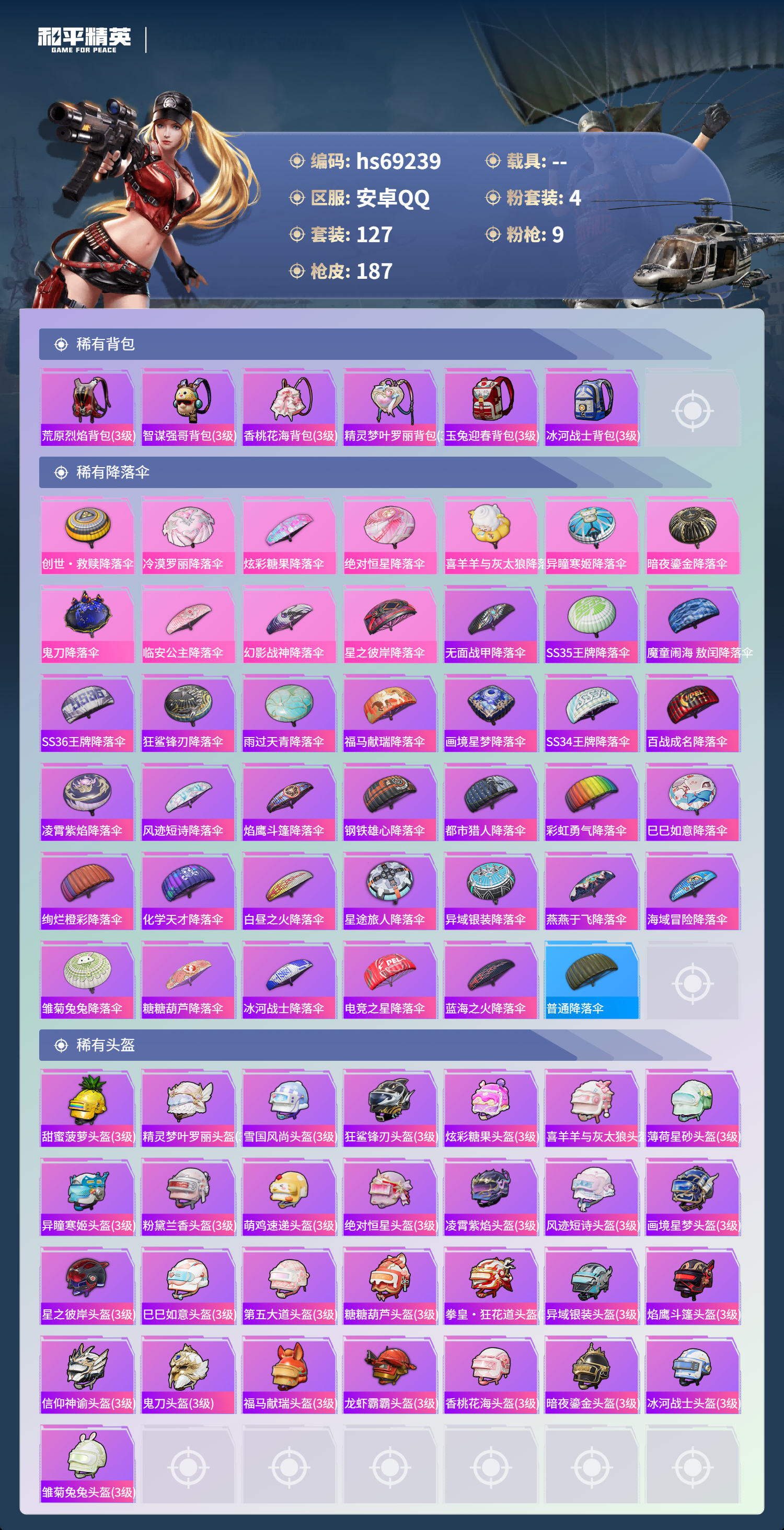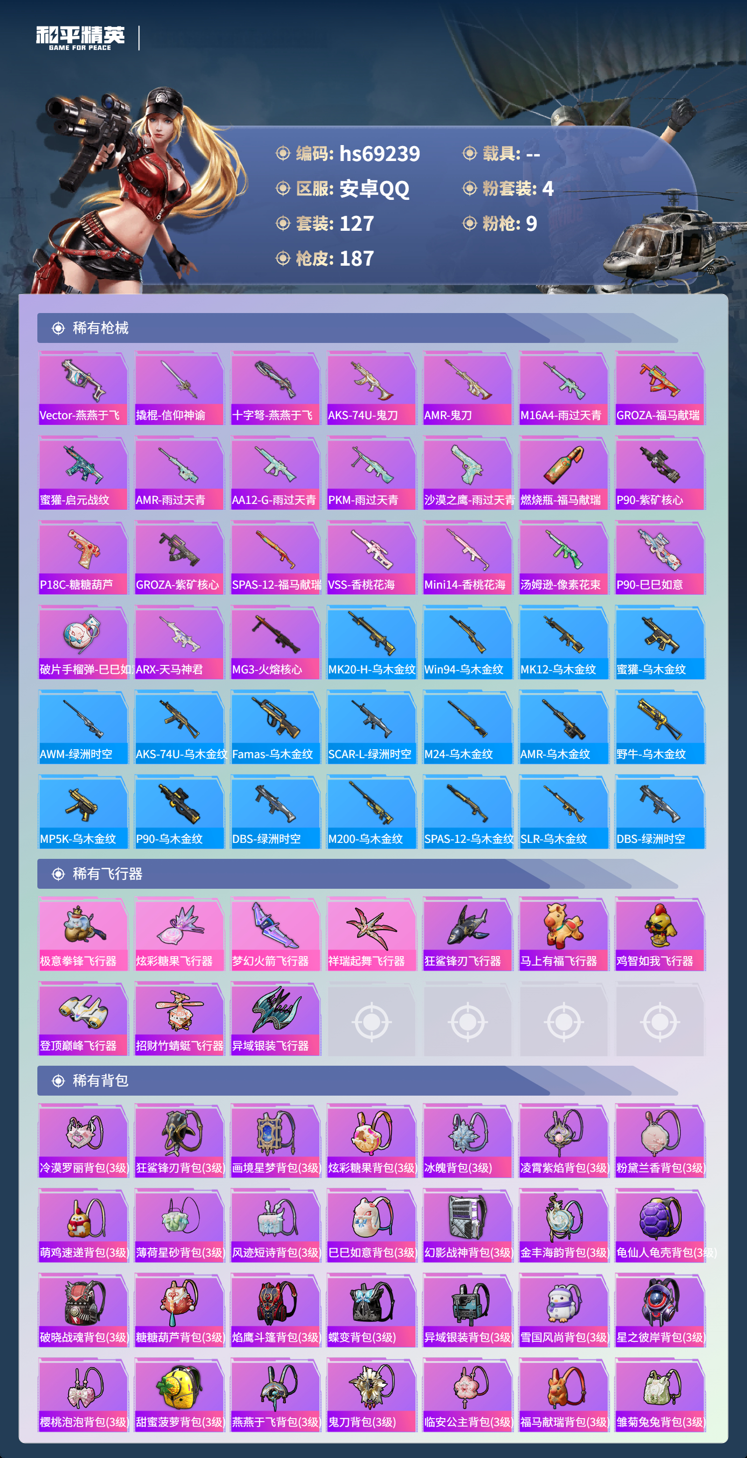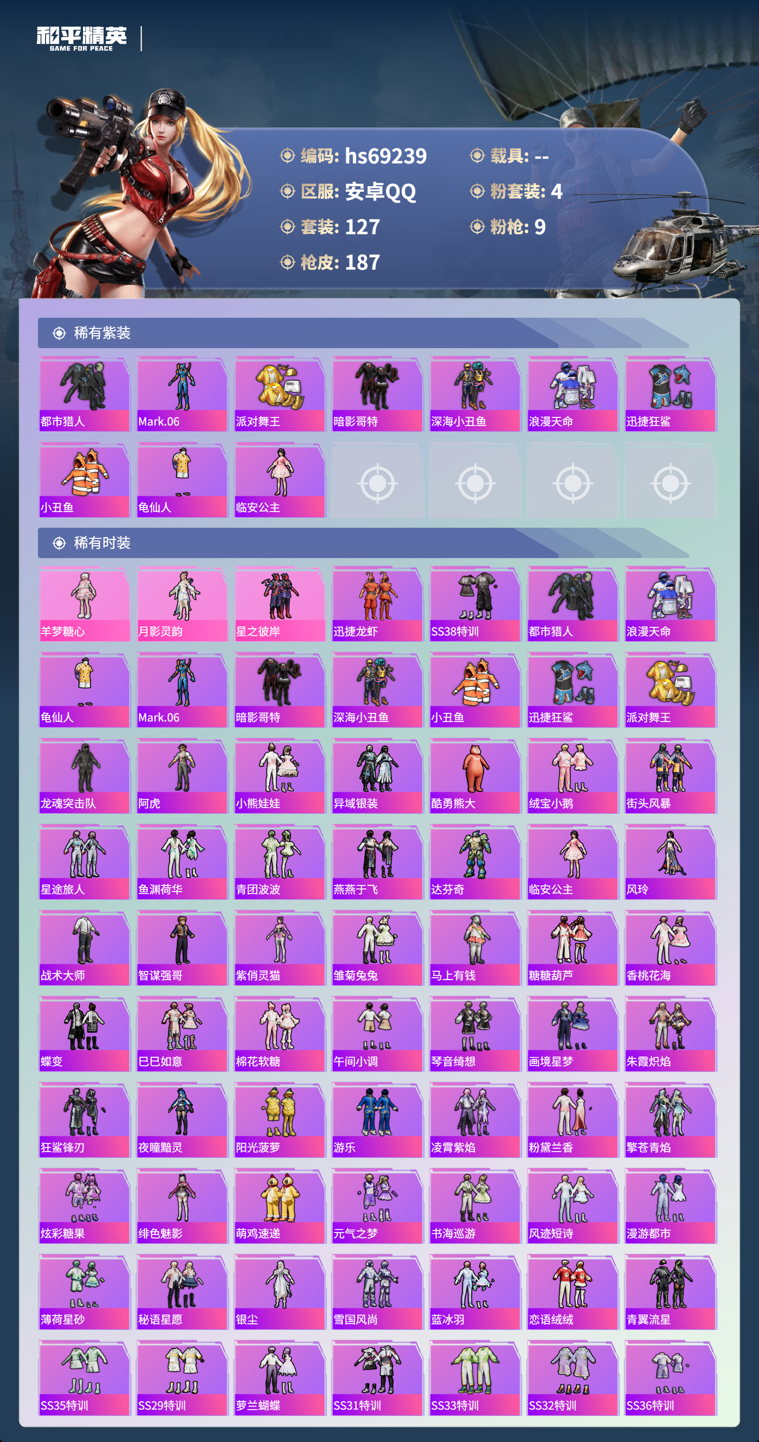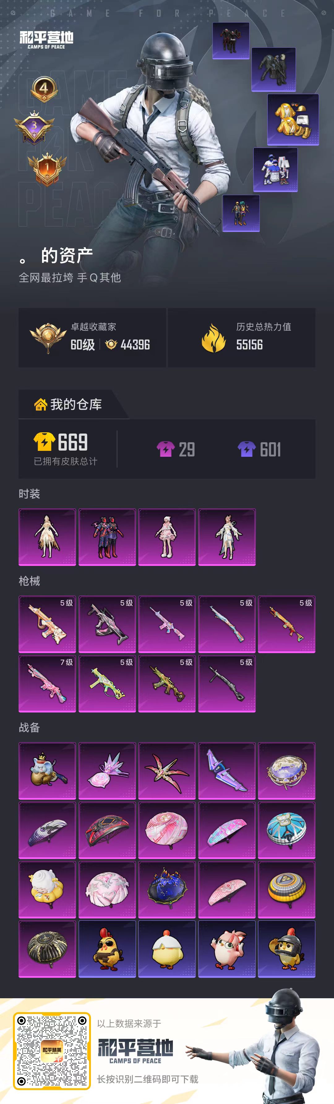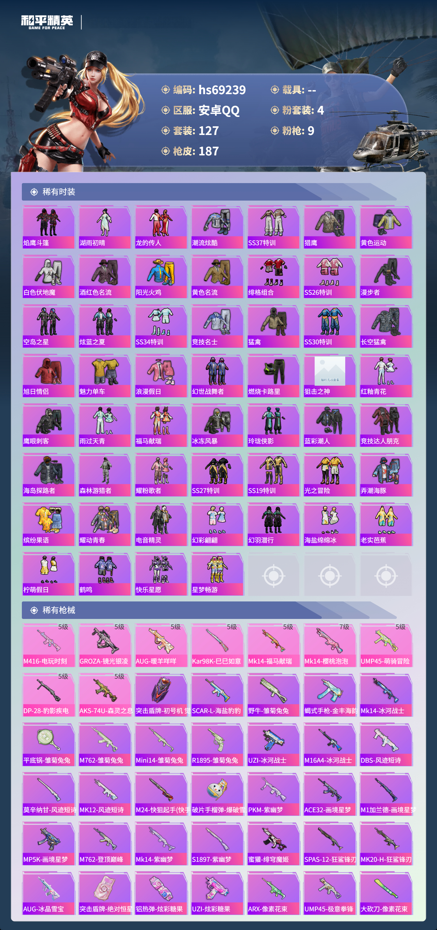 PX_2562305-,安卓手Q-4王牌印记-4粉装-9特效枪-55156热力值-127套装-187枪皮-3卓越印记-1传奇印记