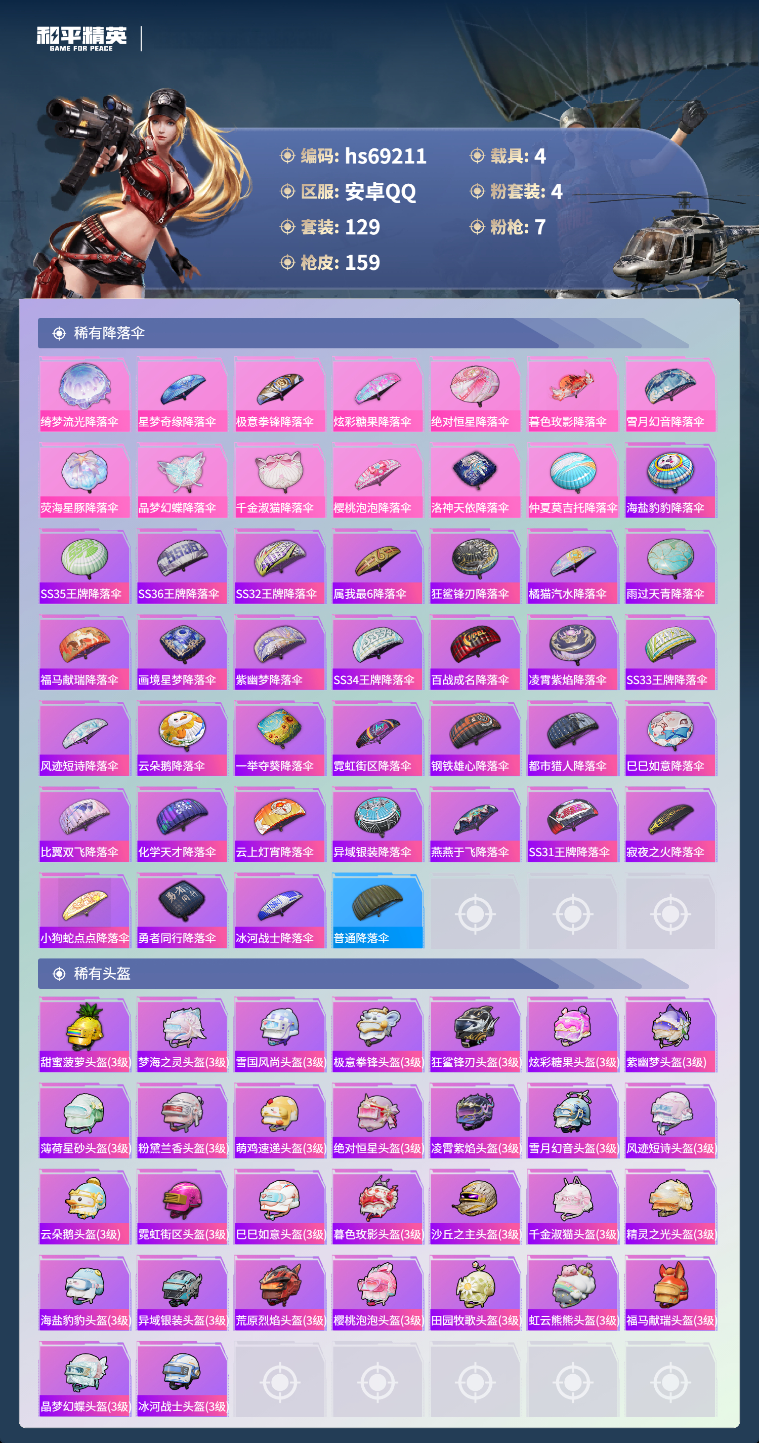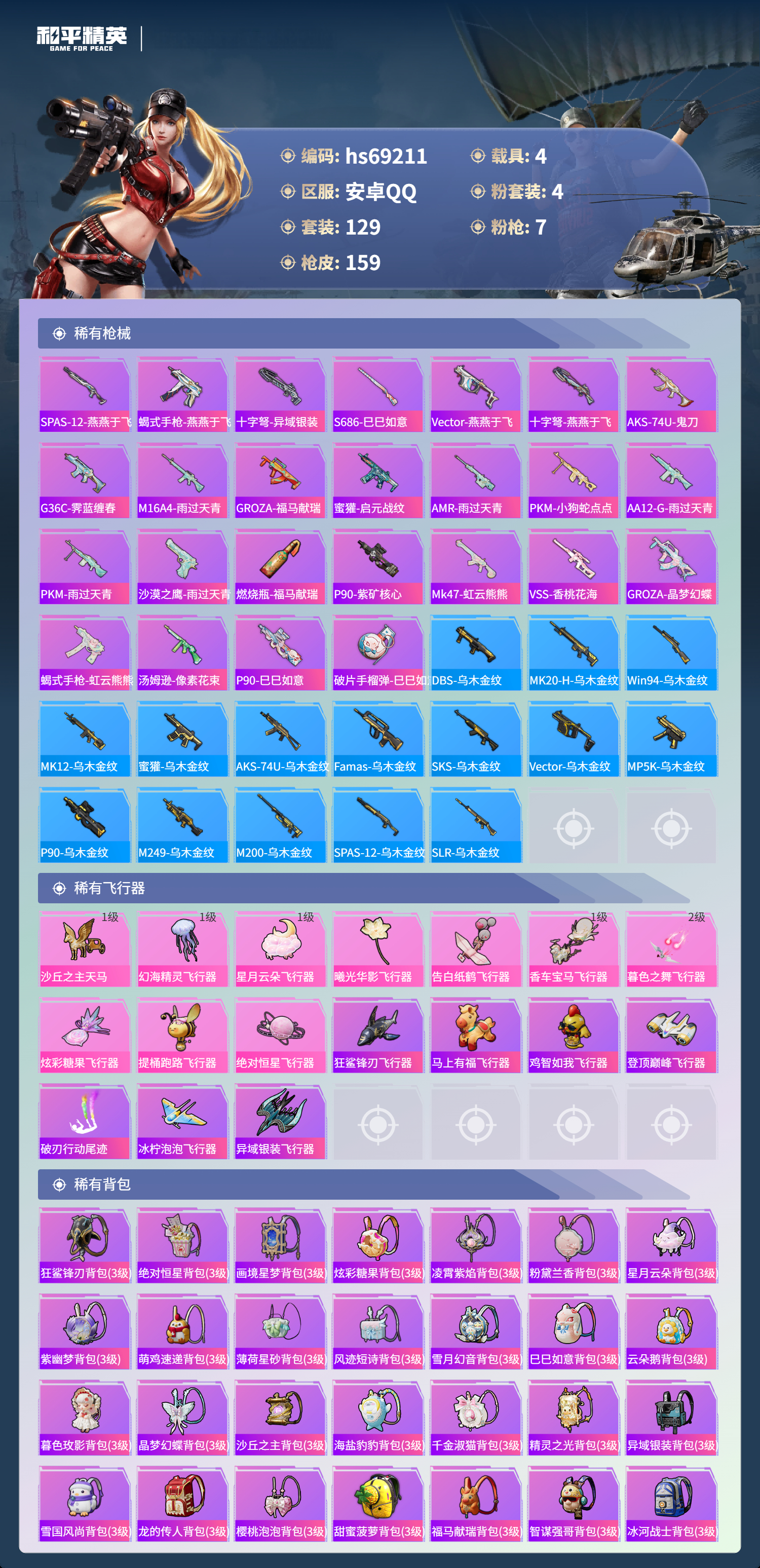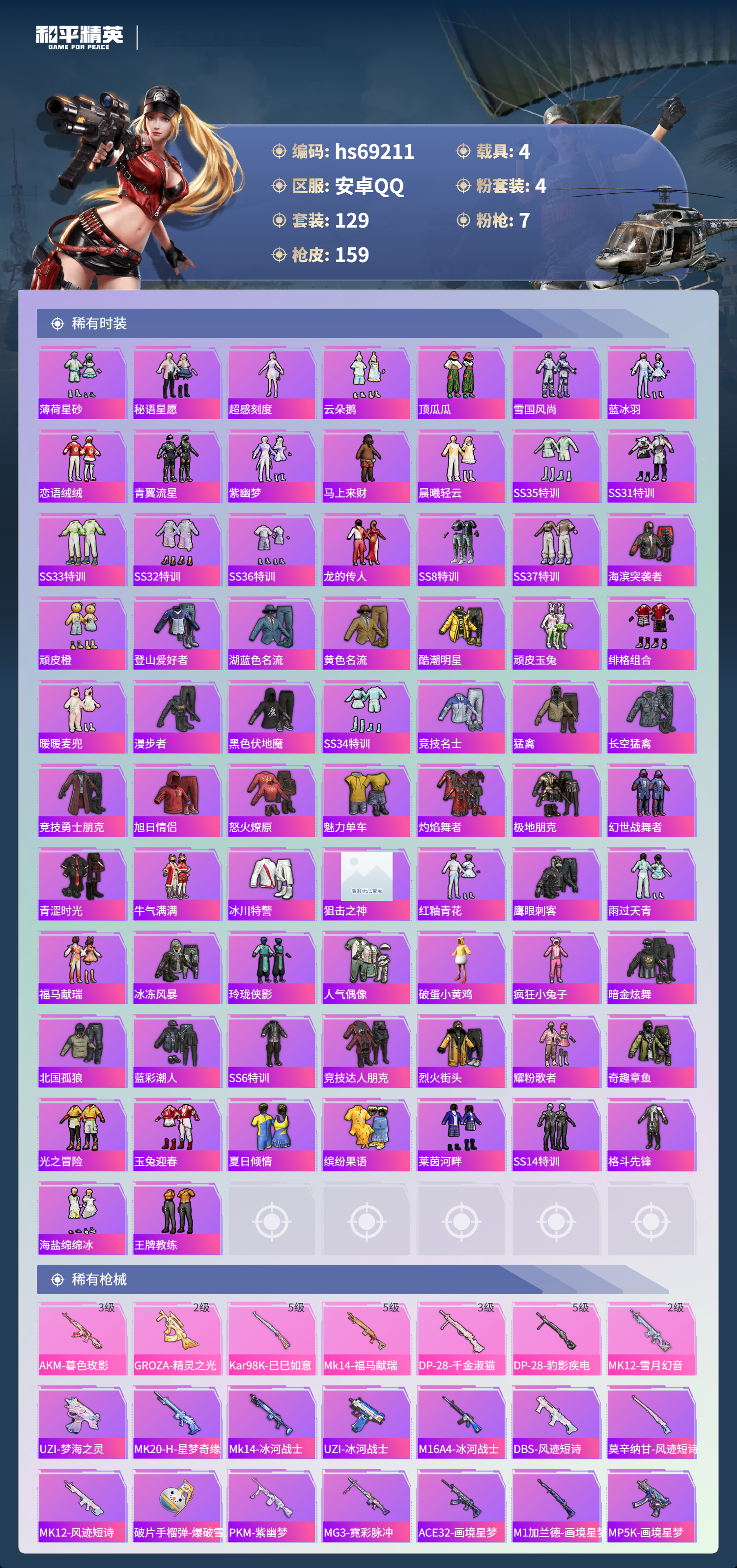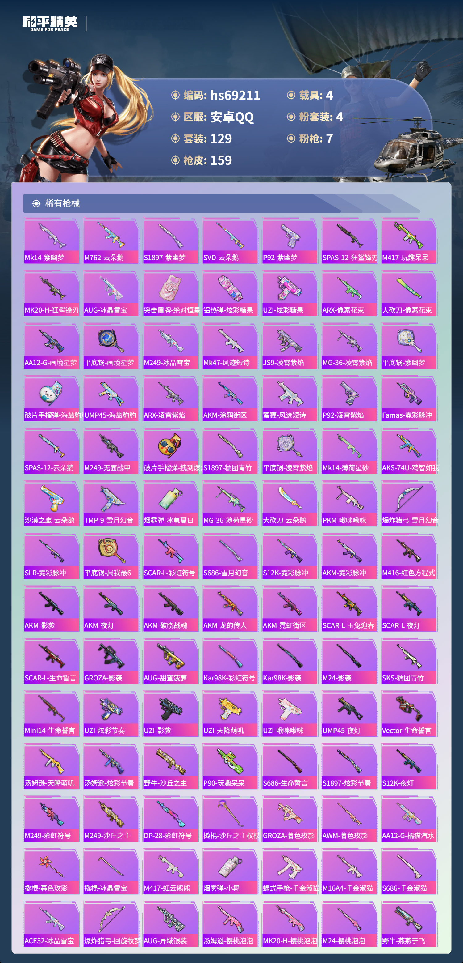 【159稀有枪械】AKM-暮色玫影/3级,GROZA-精灵之光/2级,Kar98K-巳巳如意/5级,Mk14-福马献瑞/5级,DP-28-千金淑猫/3级,DP-28-豹影疾电/5级,MK12-雪月幻音/2级,UZI-梦海之灵,DBS-乌木金纹,MK20-H-星梦奇缘,Mk14-冰河战士,UZI-冰河战士,M16A4-冰河战士,MK20-H-乌木金纹,DBS-风迹短诗,莫辛纳甘-风迹短诗,Win94-乌木金纹,MK12-风迹短诗,MK12-乌木金纹,破片手榴弹-爆破雪人,PKM-紫幽梦,MG3-霓彩脉冲,ACE32-画境星梦,M1加兰德-画境星梦,MP5K-画境星梦,Mk14-紫幽梦,蜜獾-乌木金纹,M762-云朵鹅,S1897-紫幽梦,SVD-云朵鹅,P92-紫幽梦,SPAS-12-狂鲨锋刃,M417-玩趣呆呆,MK20-H-狂鲨锋刃,AUG-冰晶雪宝,突击盾牌-绝对恒星,铝热弹-炫彩糖果,UZI-炫彩糖果,ARX-像素花束,大砍刀-像素花束,AA12-G-画境星梦,平底锅-画境星梦,M249-冰晶雪宝,Mk47-风迹短诗,JS9-凌霄紫焰,MG-36-凌霄紫焰,平底锅-紫幽梦,破片手榴弹-海盐豹豹,UMP45-海盐豹豹,ARX-凌霄紫焰,AKS-74U-乌木金纹,AKM-涂鸦街区,蜜獾-风迹短诗,P92-凌霄紫焰,Famas-乌木金纹,Famas-霓彩脉冲,SPAS-12-云朵鹅,M249-无面战甲,破片手榴弹-拽到爆炸,S1897-糯团青竹,平底锅-凌霄紫焰,Mk14-薄荷星砂,AKS-74U-鸡智如我,沙漠之鹰-云朵鹅,TMP-9-雪月幻音,烟雾弹-冰氧夏日,MG-36-薄荷星砂,大砍刀-云朵鹅,PKM-啾咪啾咪,爆炸猎弓-雪月幻音,SLR-霓彩脉冲,平底锅-属我最6,SCAR-L-彩虹符号,S686-雪月幻音,S12K-霓彩脉冲,AKM-霓彩脉冲,M416-红色方程式,AKM-影袭,AKM-夜灯,AKM-破晓战魂,AKM-龙的传人,AKM-霓虹街区,SCAR-L-玉兔迎春,SCAR-L-夜灯,SCAR-L-生命誓言,GROZA-影袭,AUG-甜蜜菠萝,Kar98K-彩虹符号,Kar98K-影袭,M24-影袭,SKS-乌木金纹,SKS-糯团青竹,Mini14-生命誓言,UZI-炫彩节奏,UZI-影袭,UZI-天降萌叽,UZI-啾咪啾咪,UMP45-夜灯,Vector-乌木金纹,Vector-生命誓言,汤姆逊-天降萌叽,汤姆逊-炫彩节奏,野牛-沙丘之主,MP5K-乌木金纹,P90-乌木金纹,P90-玩趣呆呆,S686-生命誓言,S1897-炫彩节奏,S12K-夜灯,M249-彩虹符号,M249-沙丘之主,M249-乌木金纹,DP-28-彩虹符号,撬棍-沙丘之主权杖,GROZA-暮色玫影,AWM-暮色玫影,AA12-G-橘猫汽水,撬棍-暮色玫影,撬棍-冰晶雪宝,M417-虹云熊熊,烟雾弹-小舞,蝎式手枪-千金淑猫,M16A4-千金淑猫,S686-千金淑猫,ACE32-冰晶雪宝,爆炸猎弓-回旋牧梦使,AUG-异域银装,汤姆逊-樱桃泡泡,MK20-H-樱桃泡泡,M24-樱桃泡泡,野牛-燕燕于飞,M200-乌木金纹,SPAS-12-燕燕于飞,蝎式手枪-燕燕于飞,十字弩-异域银装,S686-巳巳如意,SPAS-12-乌木金纹,Vector-燕燕于飞,十字弩-燕燕于飞,AKS-74U-鬼刀,G36C-霁蓝缠春,M16A4-雨过天青,GROZA-福马献瑞,蜜獾-启元战纹,AMR-雨过天青,PKM-小狗蛇点点,SLR-乌木金纹,AA12-G-雨过天青,PKM-雨过天青,沙漠之鹰-雨过天青,燃烧瓶-福马献瑞,P90-紫矿核心,Mk47-虹云熊熊,VSS-香桃花海,GROZA-晶梦幻蝶,蝎式手枪-虹云熊熊,汤姆逊-像素花束,P90-巳巳如意,破片手榴弹-巳巳如意