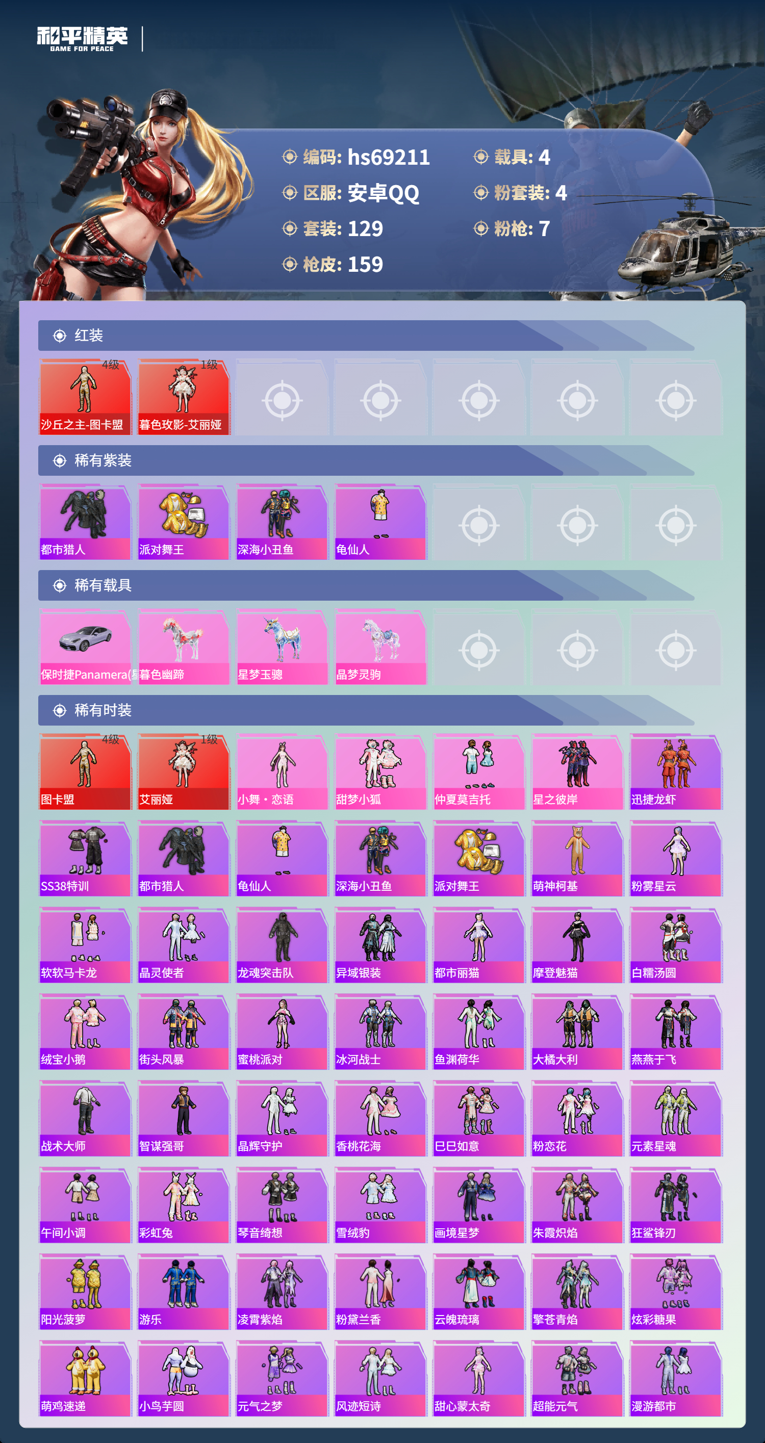PX_2562333-,安卓手Q-8王牌印记-2红装-4粉装-7特效枪-4载具-59940热力值-129套装-159枪皮-5卓越印记-2传奇印记