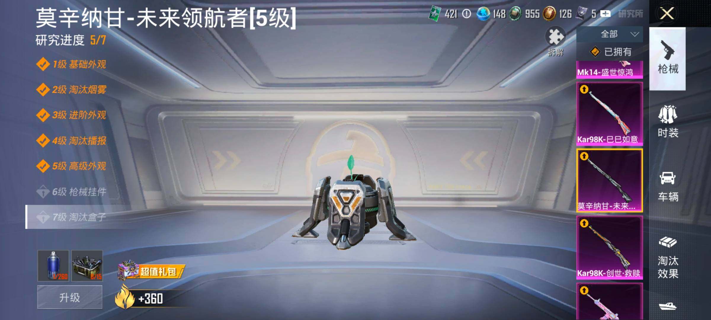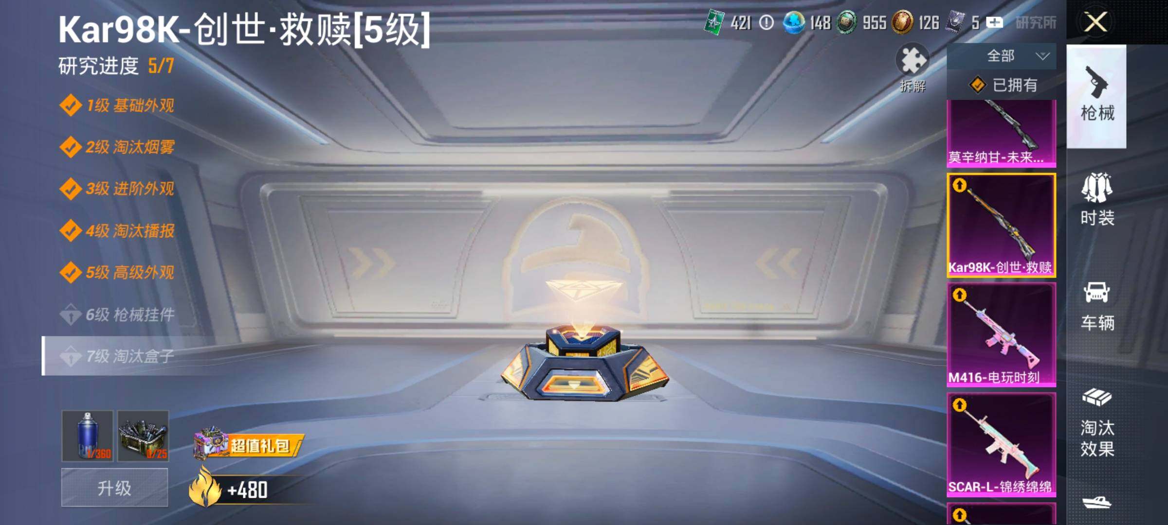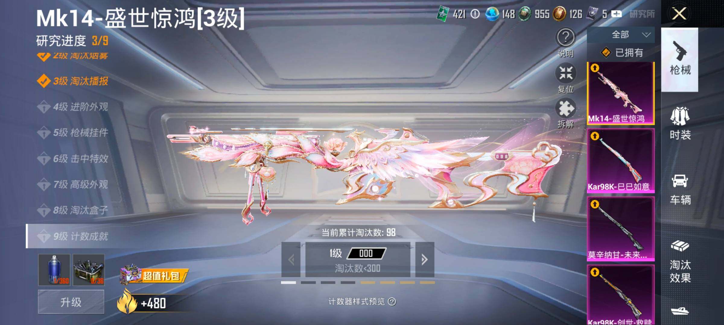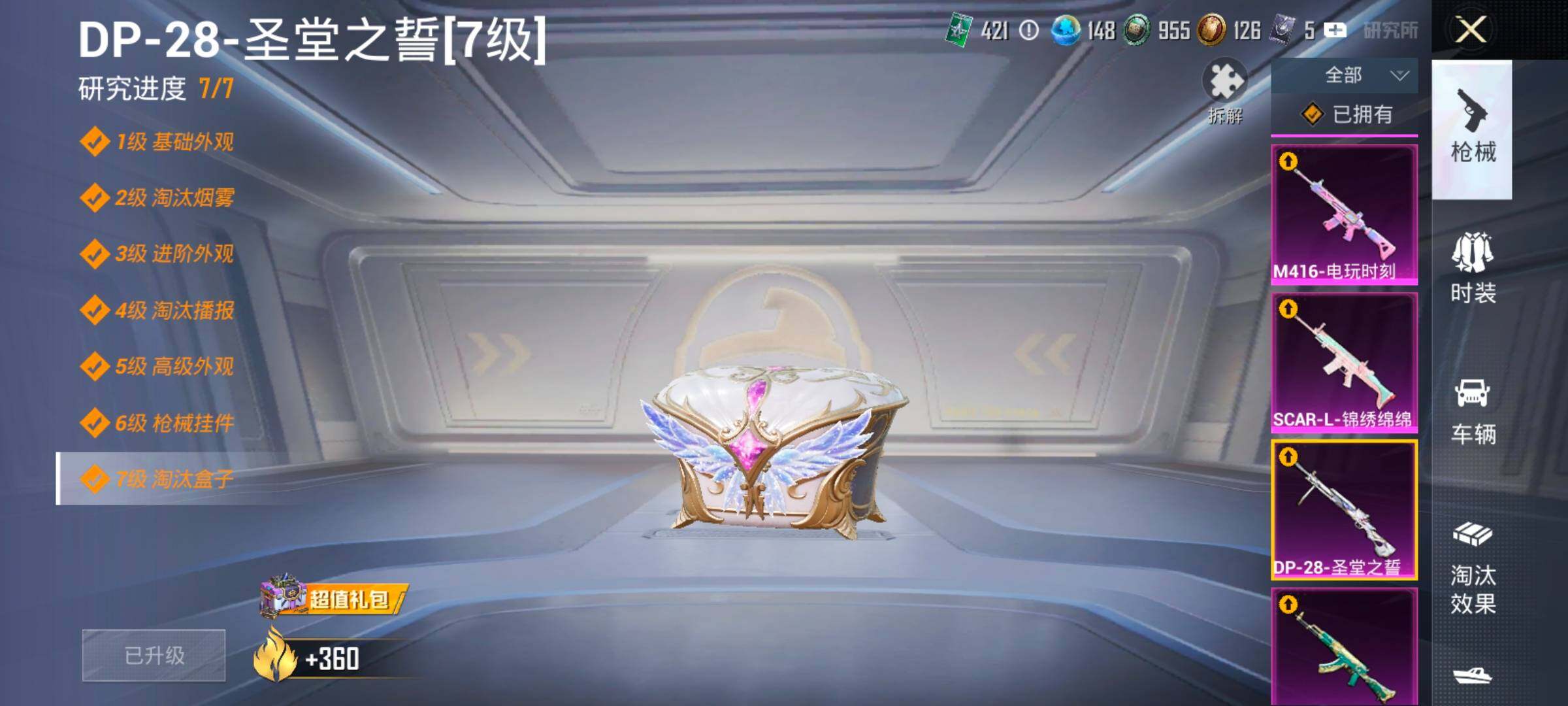 【12特效枪】,SCAR-L-锦绣绵绵,(5级),M416-电玩时刻,(5级),AKS-74U-森灵之息,(5级),AKM-绿萝繁花,(5级),Kar98K-巳巳如意,(5级),DP-28-豹影疾电,(5级),Mk14-盛世惊鸿,(3级),DP-28-圣堂之誓,(7级),Kar98K-创世救赎,(5级),莫辛纳甘-未来领航者,(5级),Mk14-福马献瑞,(2级),ACE32-萌骑漫游,(5级),