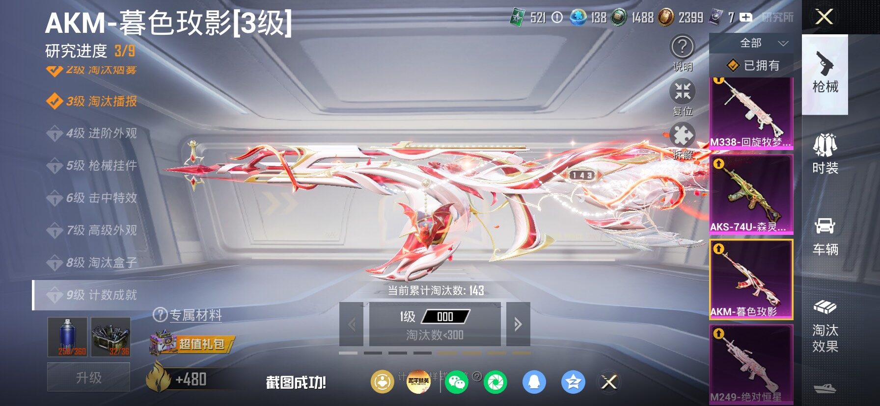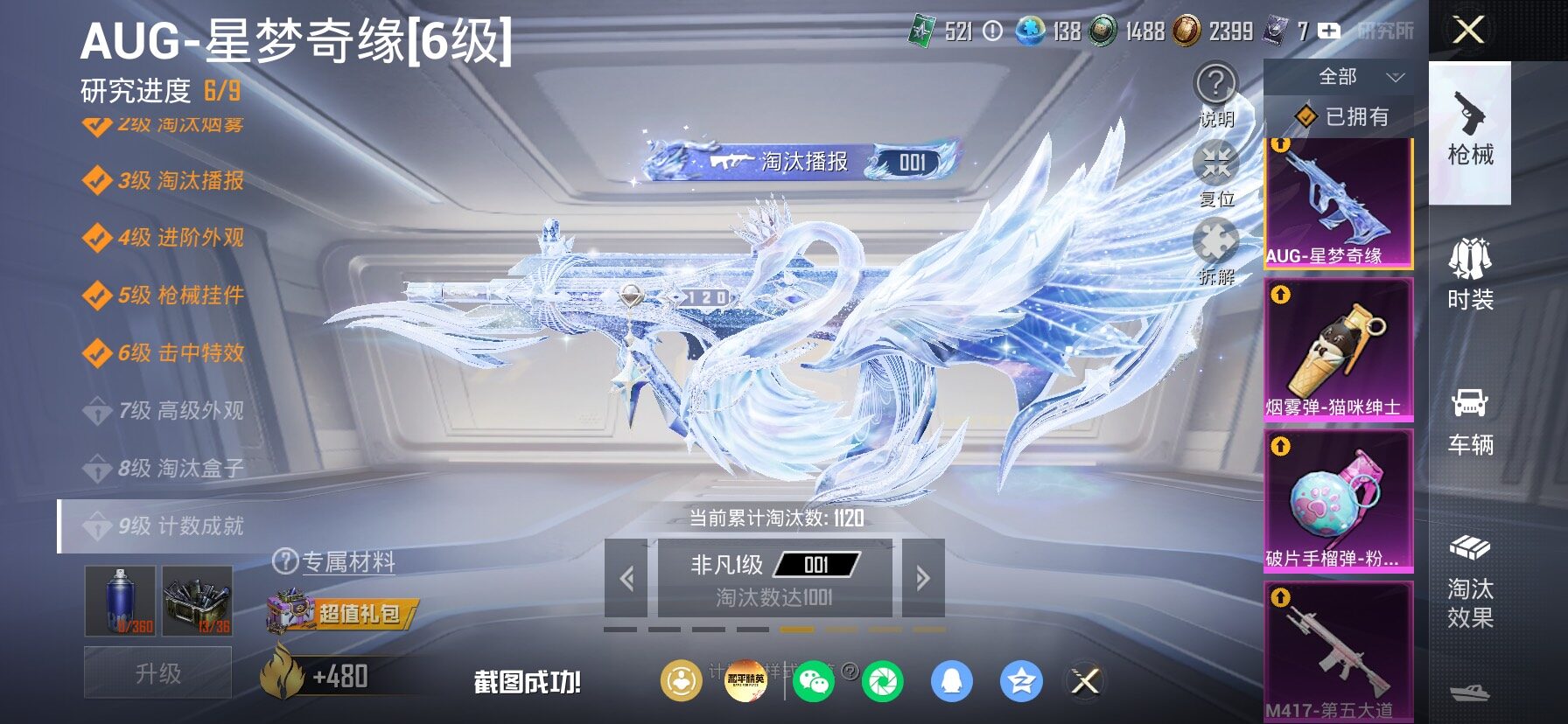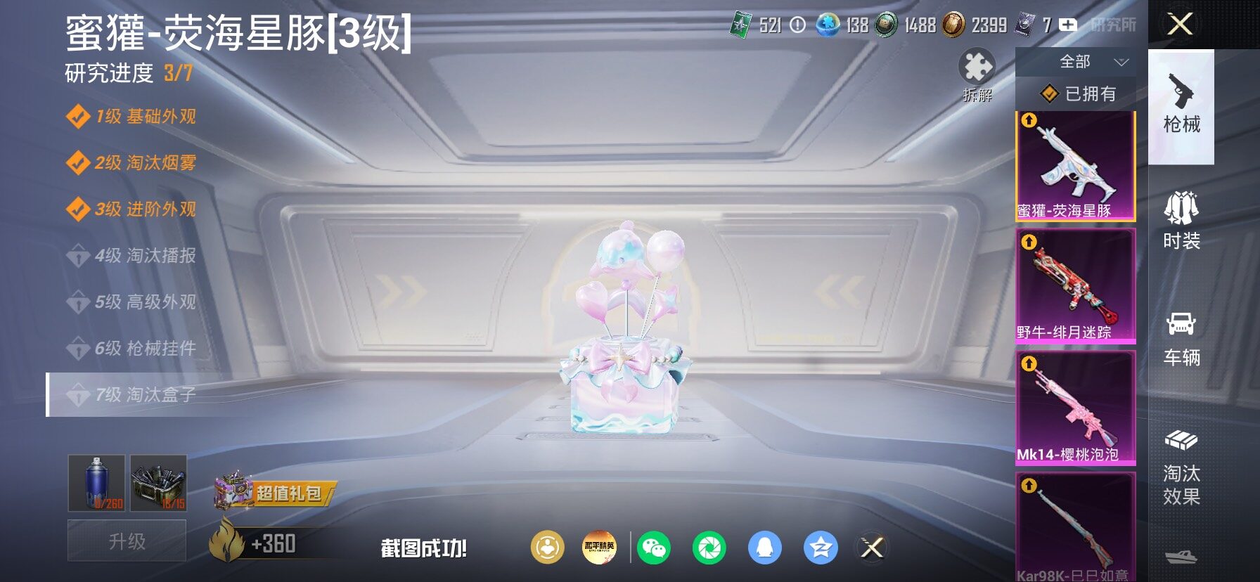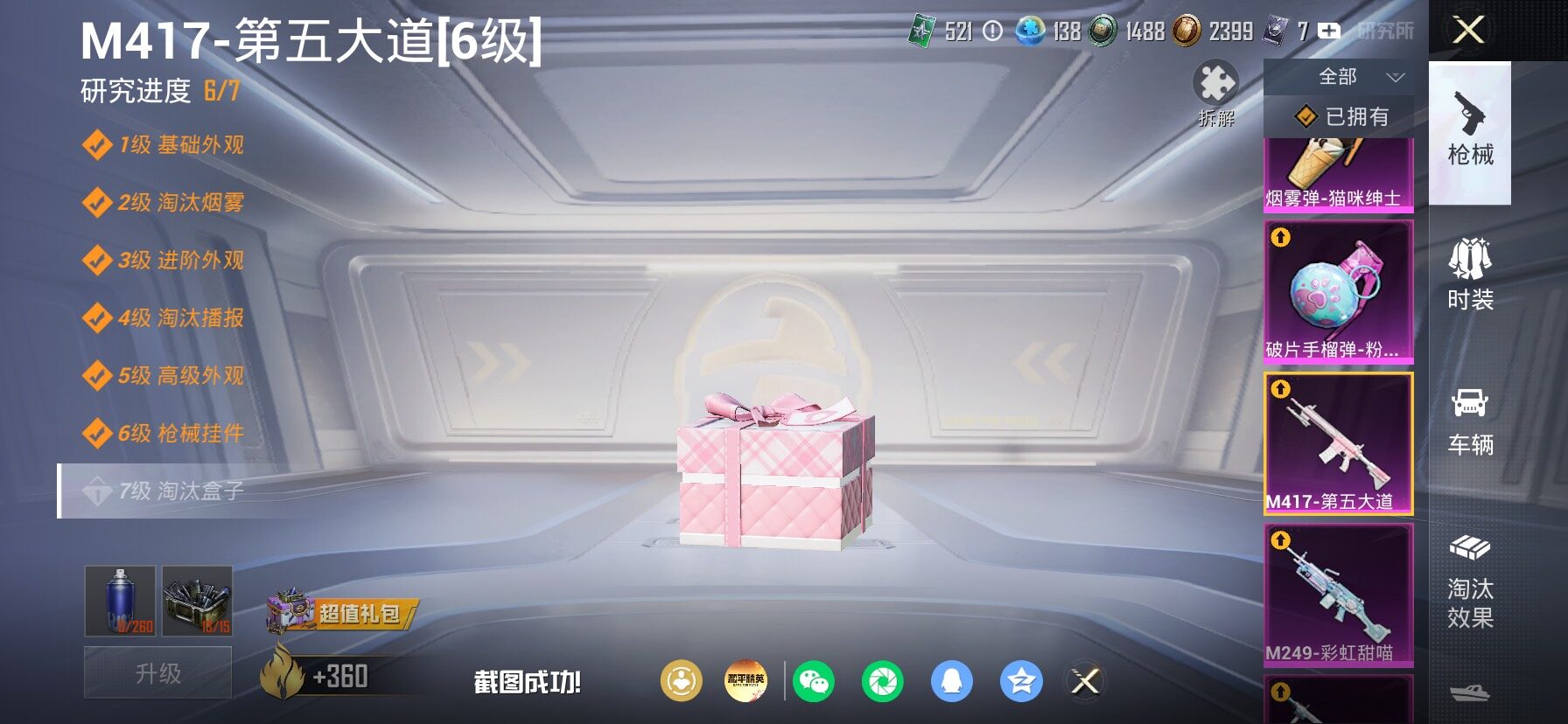 【27特效枪】,AKM-暮色玫影,(3级),M416-心之恋语,(7级),M416-灵猫魔法师,(3级),AKS-74U-森灵之息,(5级),UMP45-雪国精灵,(4级),Kar98K-巳巳如意,(5级),M762-甜蜜誓约,(7级),MG-36-沧焰双生,(5级),DP-28-豹影疾电,(5级),AUG-星梦,奇缘,(6级),蜜獾-荧海星豚,(3级),M338-回旋牧梦使,(6级),Mk14-樱桃泡泡,(2级),SCAR-L-童趣迷兔,(7级),M417-第五大道,(6级),AKM-梦之光华,(6级),野牛-绯月迷踪,(4级),M249-绝对恒星,(1级),MG3-洛神天依,(4级),M249-彩虹甜喵,(5级),信号枪-金乌曜日,(3级),Mk14-福马献瑞,(5级),AA12-G-萌骑幻想,(1级),燃烧瓶-天降桃花,(4级),破片手榴弹-粉粉猫爪,(7级),烟雾弹-猫咪绅士,(5级),碎片手榴弹-美味星星糖(2级)