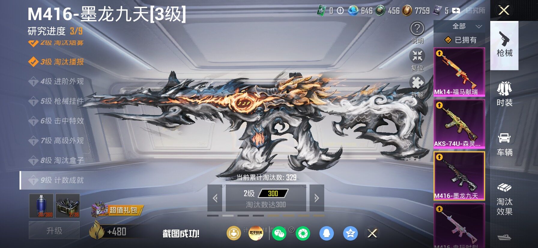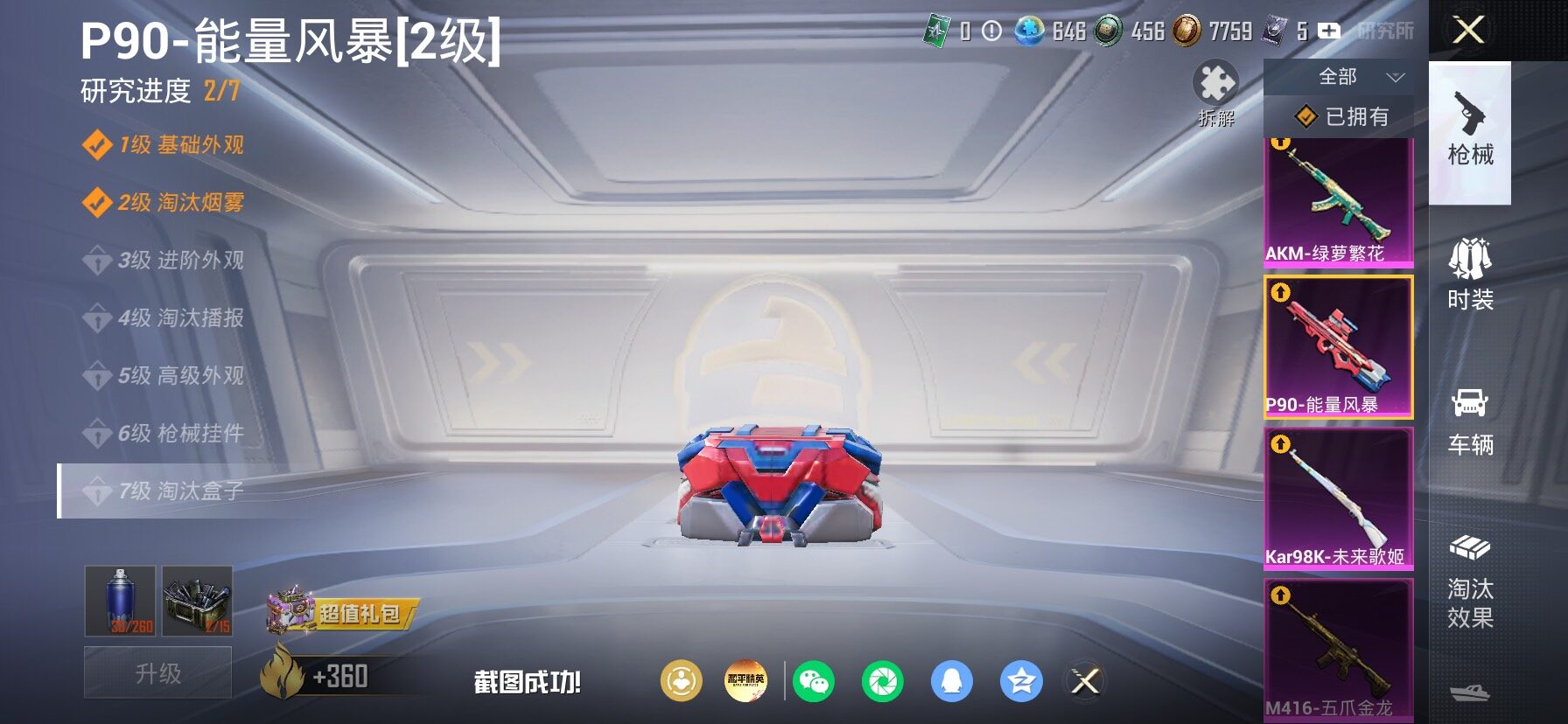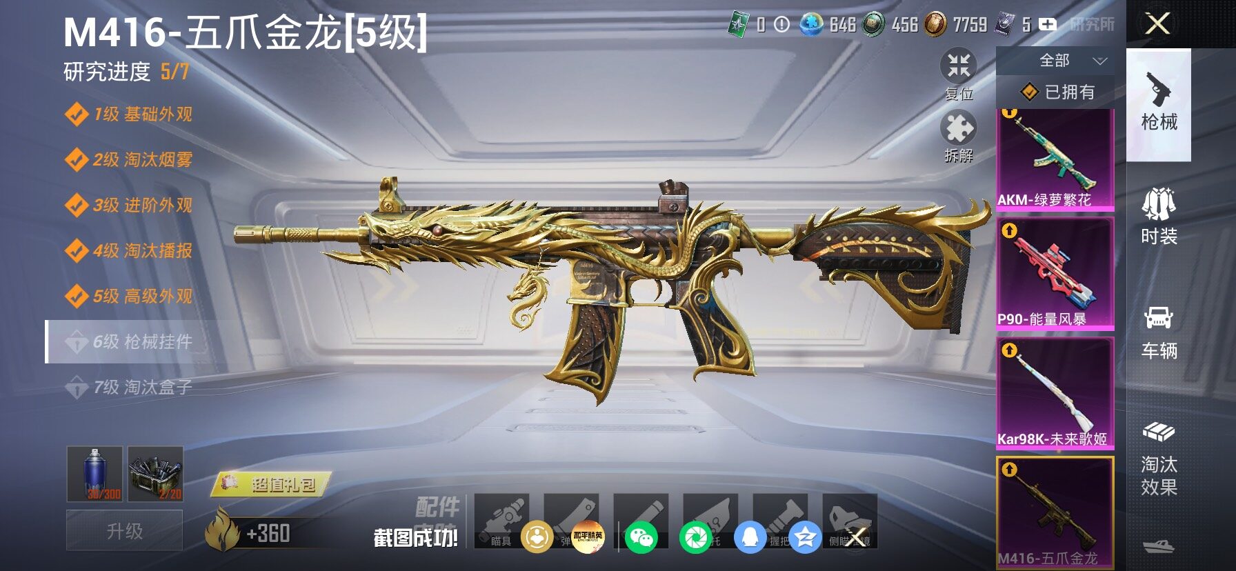 【10特效枪】,M416-五爪金龙,(5级),SCAR-L-锦绣绵绵,(5级),M416-墨龙九天,(3级),M416-电玩时刻,(5级),P90-沙丘之主,(3级),AKS-74U-森灵之息,(5级),AKM-绿萝繁花,(5级),P90-能量风暴,(2级),Kar98K-未来歌姬,(2级),Mk14-福马献瑞,(5级),
