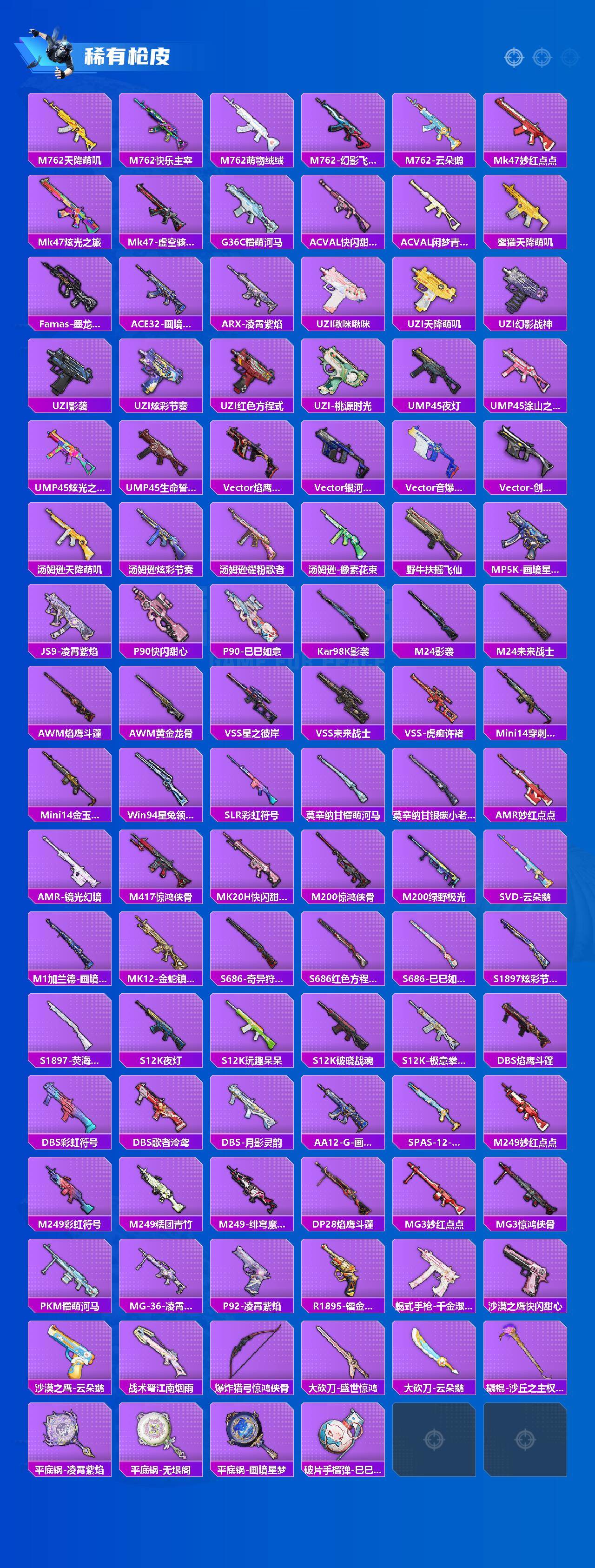 【粉色枪皮等级】:SCAR-L-锦绣绵绵(五级),M416-电玩时刻(五级),AUG-暖羊咩咩(五级),蜜獾-异瞳寒姬(