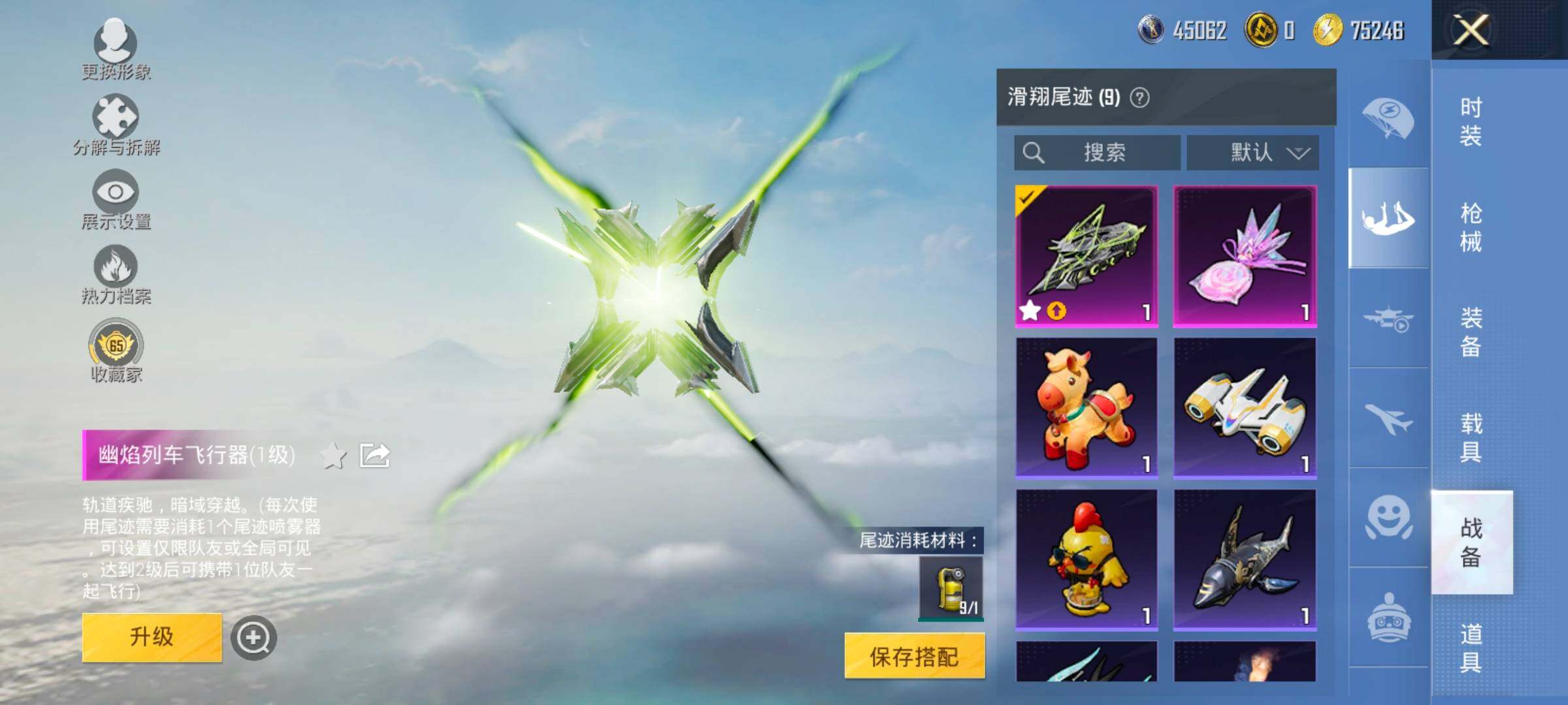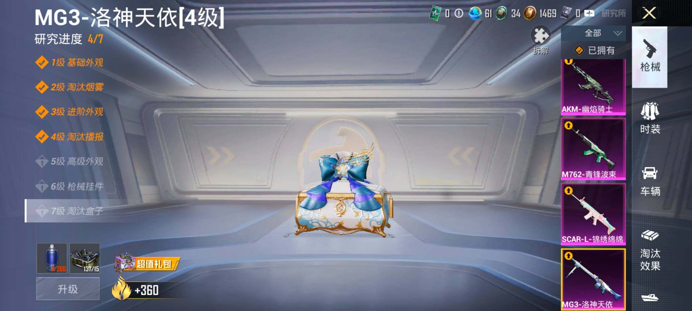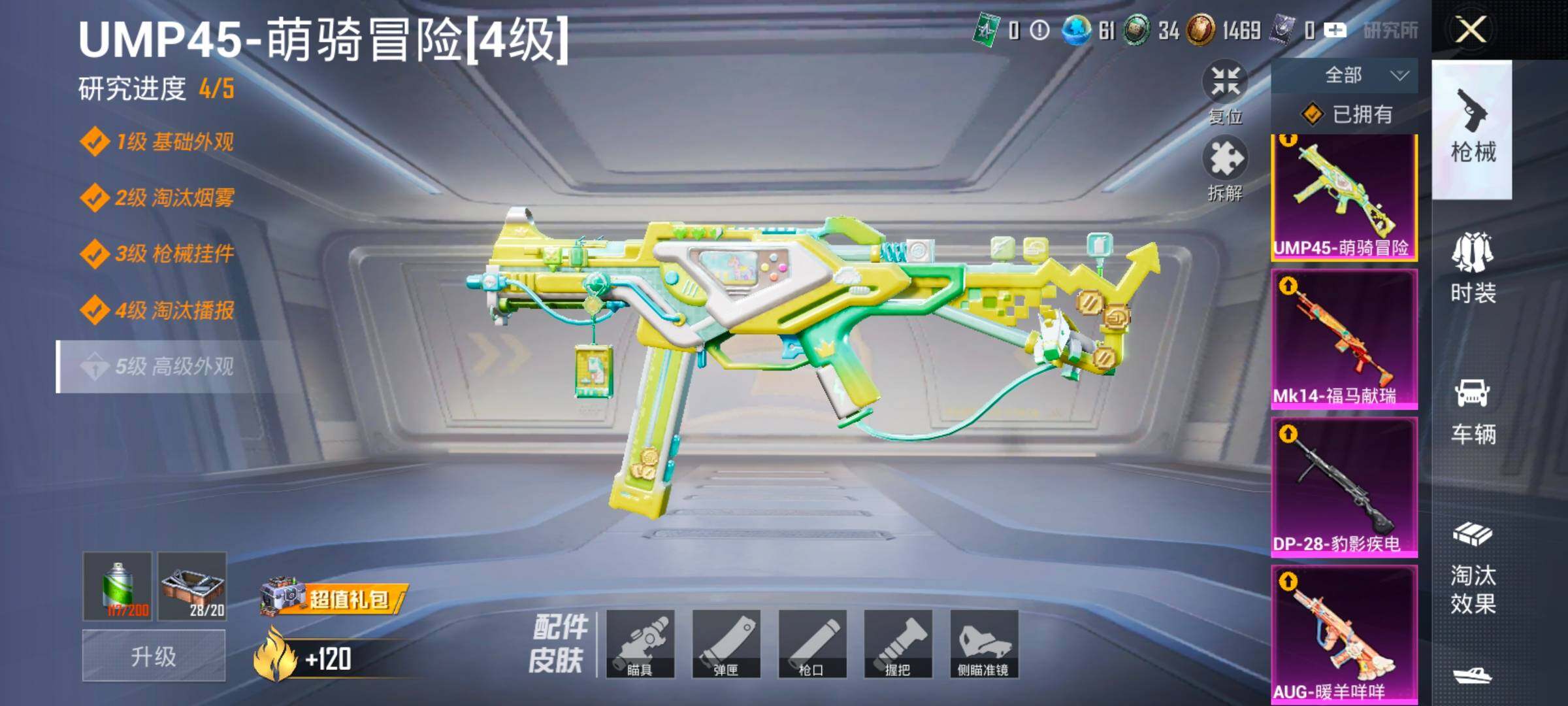 【10特效枪】,SCAR-L-锦绣绵绵,(5级),AKM-幽焰骑士,(3级),Kar98K-巳巳如意,(5级),M762-青锋波束,(5级),DP-28-豹影疾电,(5级),AUG-暖羊咩咩,(5级),GROZA-镜光银凌,(5级),MG3-洛神天依,(4级),Mk14-福马献瑞,(5级),UMP45-萌骑冒险,(4级),
