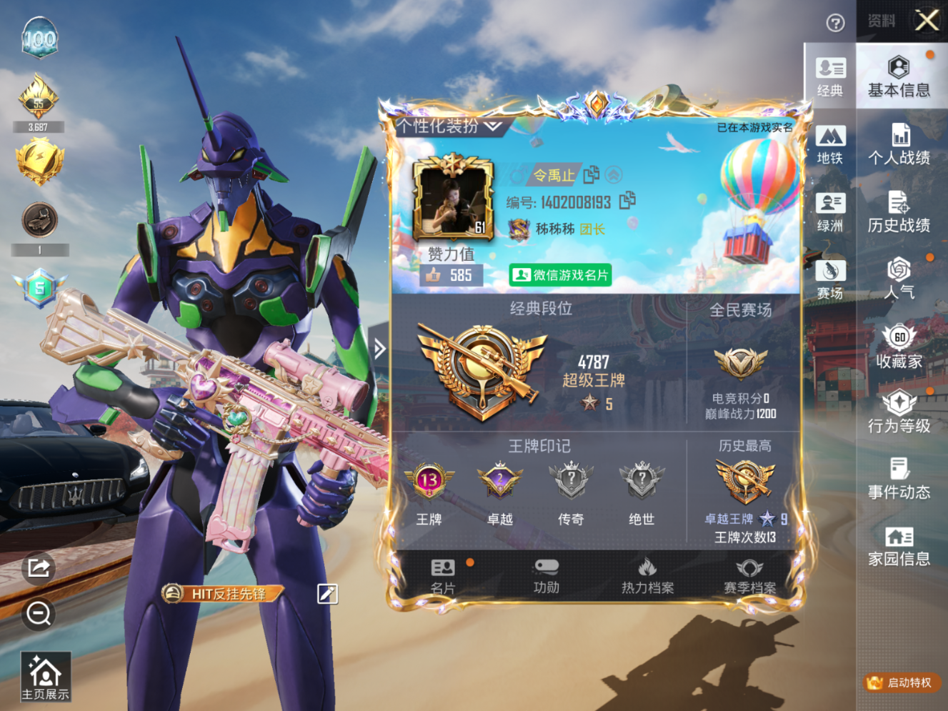 PX_2562736-1载具-99套装-169枪皮-社交限制,1载具6粉装9特效枪6热门99套装169枪皮,52763热力值,13印记,历史卓越王牌9星,【1载具】,玛莎拉蒂Q蓝色,【6粉装】,紫螳螂,凤凰座一辉,千金淑猫,千面幻镜,星之彼岸,复仇流浪者,【9特效枪】,M416-心之恋语,(7级),M416-墨龙九天,(3级),AKS-74U-森灵之息,(5级),Kar98K-巳巳如意,(5级),DP-28-千金淑猫,(7级),DP-28-豹影疾电,(1级),Mk14-福马献瑞,(4级),AA12-G-萌骑幻想,(2级),ACE32-萌骑漫游,(3级),【6热门】,Mark.06,小丑鱼,龟仙人,粉红小猪,海洋之心,破蛋小黄鸡,【2飞行器】,龙翔九天飞行器,绝色倾城飞行器,营地ID: