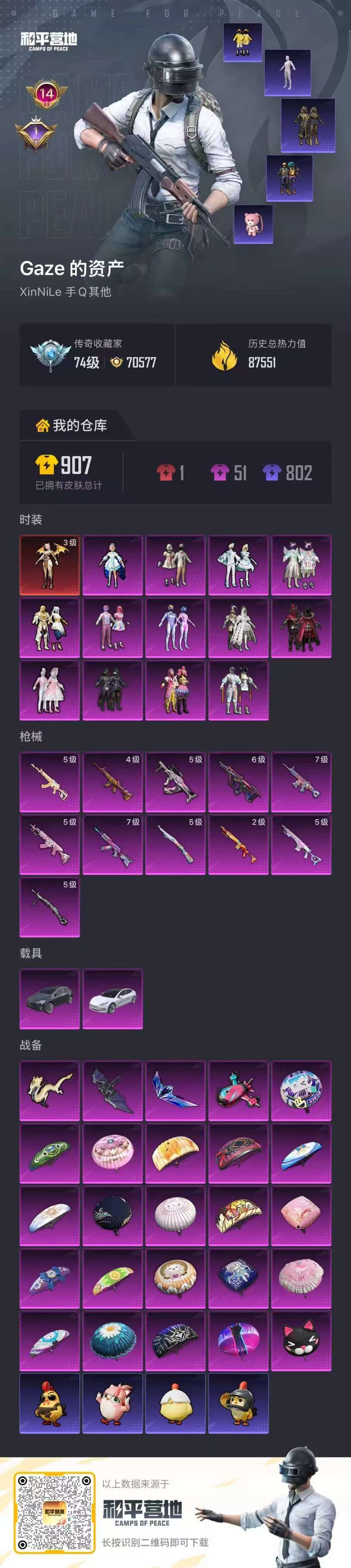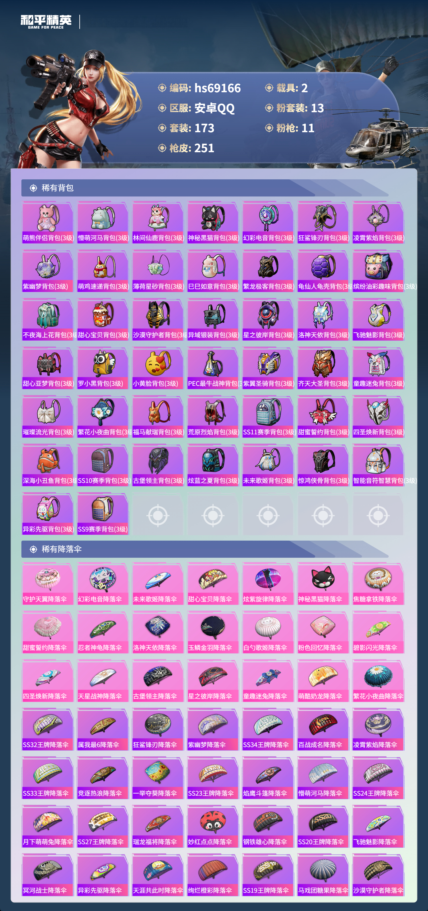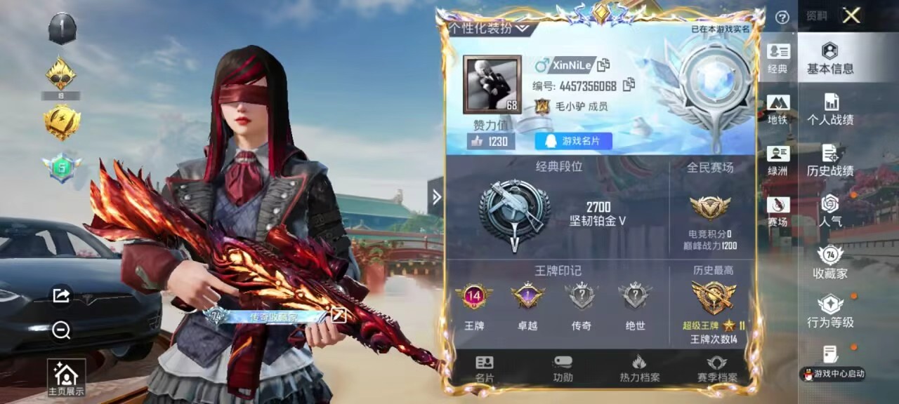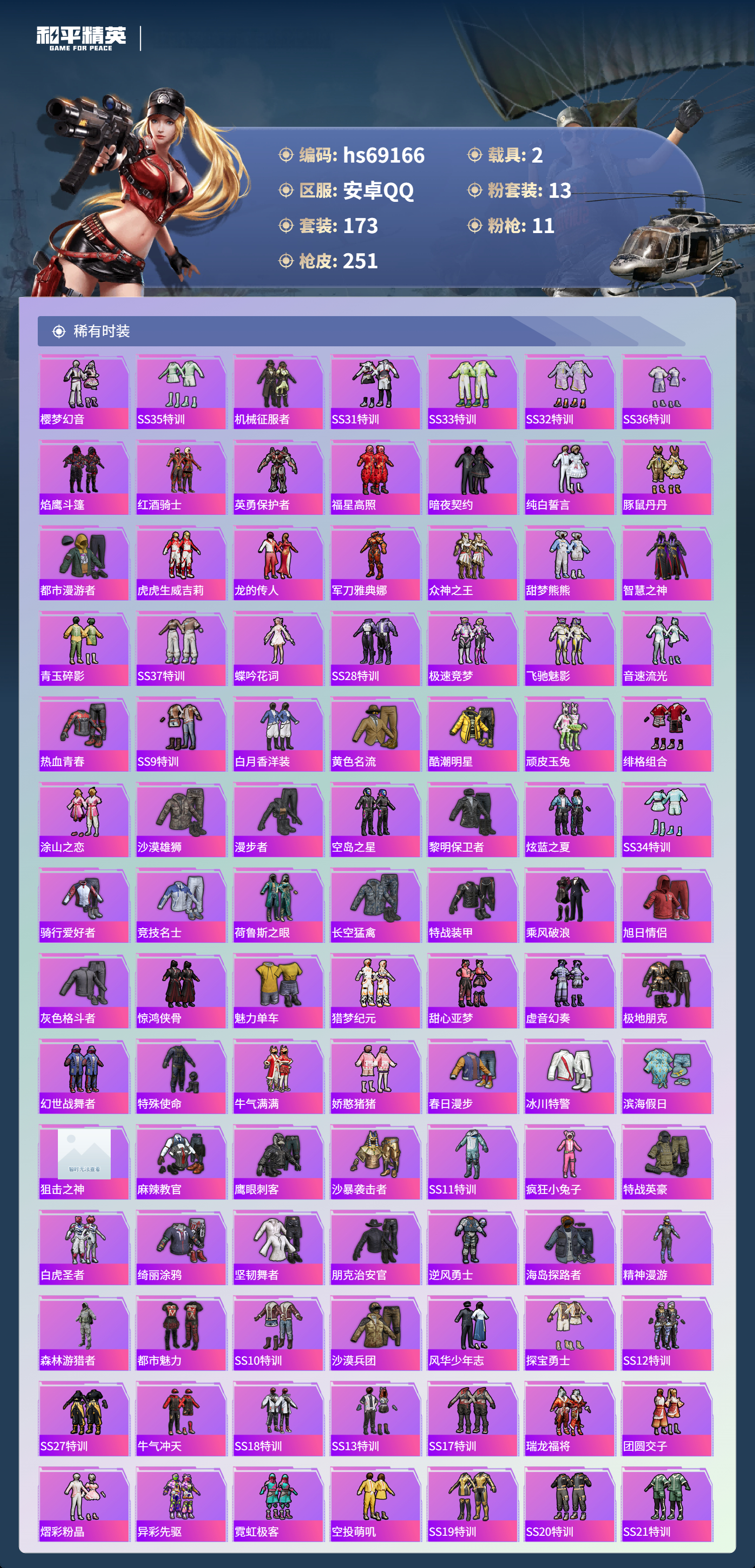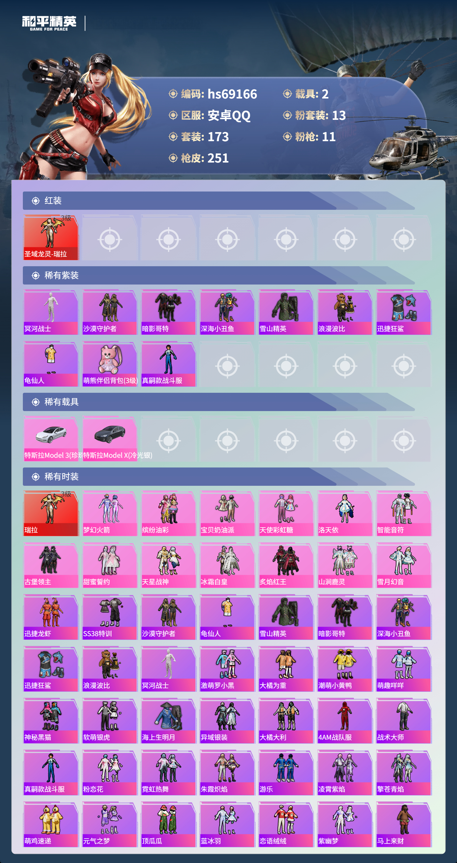 PX_2562979-,安卓手Q-14王牌印记-1红装-13粉装-11特效枪-2载具-87551热力值-173套装-251枪皮-1卓越印记