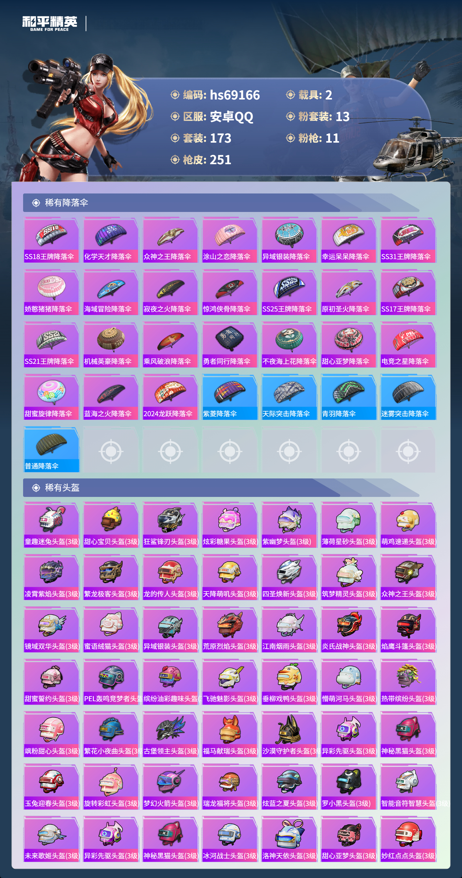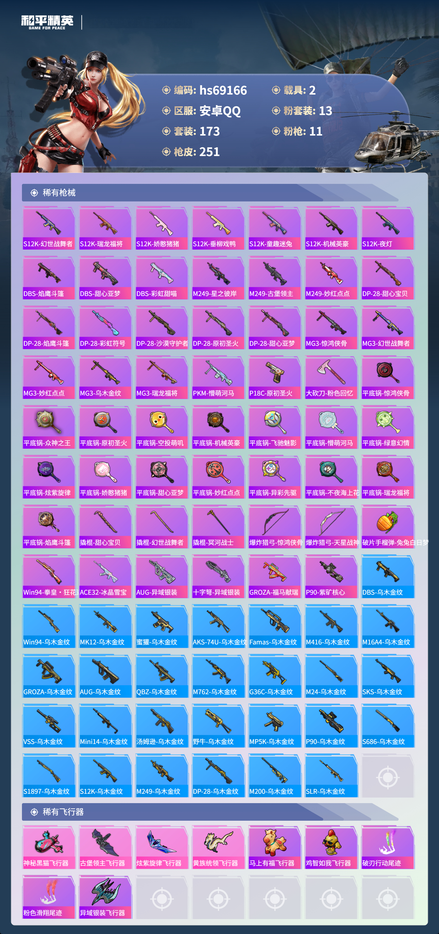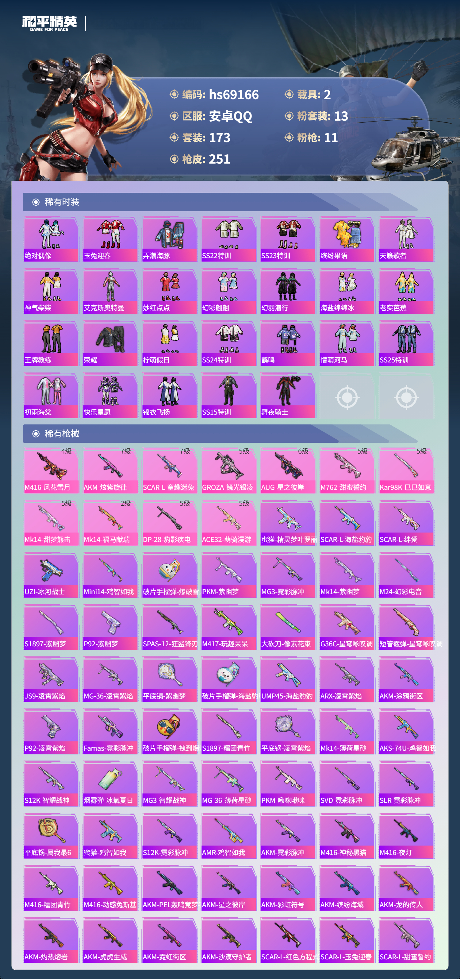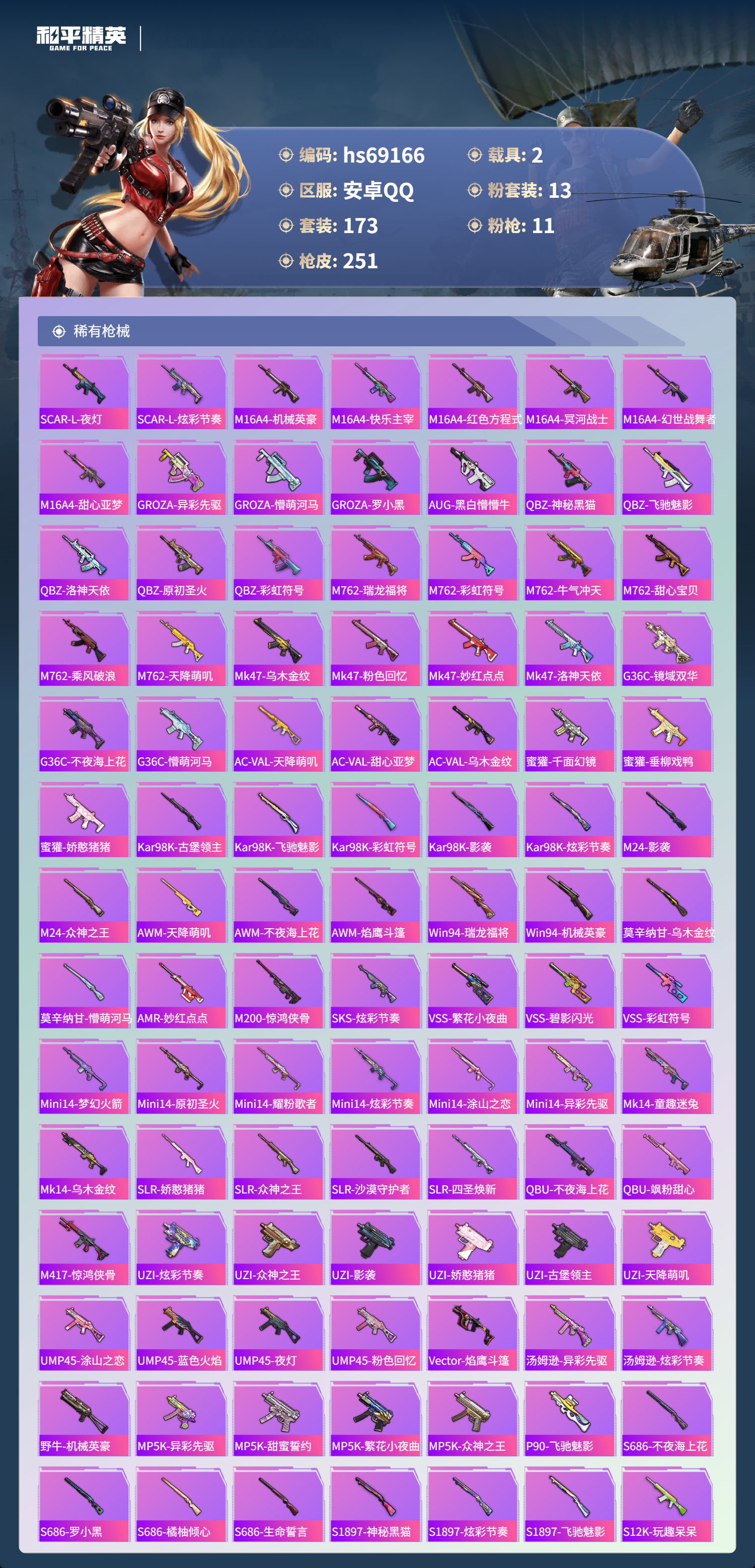 【251稀有枪械】M416-风花雪月/4级,AKM-炫紫旋律/7级,SCAR-L-童趣迷兔/7级,GROZA-镜光银凌/5级,AUG-星之彼岸/6级,M762-甜蜜誓约/5级,Kar98K-巳巳如意/5级,Mk14-甜梦熊击/5级,Mk14-福马献瑞/2级,DP-28-豹影疾电/5级,ACE32-萌骑漫游/5级,DBS-乌木金纹,蜜獾-精灵梦叶罗丽,SCAR-L-海盐豹豹,SCAR-L-绊爱,UZI-冰河战士,Mini14-鸡智如我,Win94-乌木金纹,MK12-乌木金纹,破片手榴弹-爆破雪人,PKM-紫幽梦,MG3-霓彩脉冲,Mk14-紫幽梦,M24-幻彩电音,蜜獾-乌木金纹,S1897-紫幽梦,P92-紫幽梦,SPAS-12-狂鲨锋刃,M417-玩趣呆呆,大砍刀-像素花束,G36C-星穹咏叹调,短管霰弹-星穹咏叹调,JS9-凌霄紫焰,MG-36-凌霄紫焰,平底锅-紫幽梦,破片手榴弹-海盐豹豹,UMP45-海盐豹豹,ARX-凌霄紫焰,AKS-74U-乌木金纹,AKM-涂鸦街区,P92-凌霄紫焰,Famas-乌木金纹,Famas-霓彩脉冲,破片手榴弹-拽到爆炸,S1897-糯团青竹,平底锅-凌霄紫焰,Mk14-薄荷星砂,AKS-74U-鸡智如我,S12K-智耀战神,烟雾弹-冰氧夏日,MG3-智耀战神,MG-36-薄荷星砂,PKM-啾咪啾咪,SVD-霓彩脉冲,SLR-霓彩脉冲,平底锅-属我最6,蜜獾-鸡智如我,S12K-霓彩脉冲,AMR-鸡智如我,AKM-霓彩脉冲,M416-神秘黑猫,M416-乌木金纹,M416-夜灯,M416-糯团青竹,M416-动感兔斯基,AKM-PEL轰鸣竞梦者,AKM-星之彼岸,AKM-彩虹符号,AKM-缤纷海域,AKM-龙的传人,AKM-灼热熔岩,AKM-虎虎生威,AKM-霓虹街区,AKM-沙漠守护者,SCAR-L-红色方程式,SCAR-L-玉兔迎春,SCAR-L-甜蜜誓约,SCAR-L-夜灯,SCAR-L-炫彩节奏,M16A4-机械英豪,M16A4-快乐主宰,M16A4-红色方程式,M16A4-冥河战士,M16A4-幻世战舞者,M16A4-甜心亚梦,M16A4-乌木金纹,GROZA-乌木金纹,GROZA-异彩先驱,GROZA-懵萌河马,GROZA-罗小黑,AUG-黑白懵懵牛,AUG-乌木金纹,QBZ-神秘黑猫,QBZ-飞驰魅影,QBZ-洛神天依,QBZ-原初圣火,QBZ-乌木金纹,QBZ-彩虹符号,M762-瑞龙福将,M762-乌木金纹,M762-彩虹符号,M762-牛气冲天,M762-甜心宝贝,M762-乘风破浪,M762-天降萌叽,Mk47-乌木金纹,Mk47-粉色回忆,Mk47-妙红点点,Mk47-洛神天依,G36C-镜域双华,G36C-不夜海上花,G36C-乌木金纹,G36C-懵萌河马,AC-VAL-天降萌叽,AC-VAL-甜心亚梦,AC-VAL-乌木金纹,蜜獾-千面幻镜,蜜獾-垂柳戏鸭,蜜獾-娇憨猪猪,Kar98K-古堡领主,Kar98K-飞驰魅影,Kar98K-彩虹符号,Kar98K-影袭,Kar98K-炫彩节奏,M24-乌木金纹,M24-影袭,M24-众神之王,AWM-天降萌叽,AWM-不夜海上花,AWM-焰鹰斗篷,Win94-瑞龙福将,Win94-机械英豪,莫辛纳甘-乌木金纹,莫辛纳甘-懵萌河马,AMR-妙红点点,M200-惊鸿侠骨,SKS-乌木金纹,SKS-炫彩节奏,VSS-乌木金纹,VSS-繁花小夜曲,VSS-碧影闪光,VSS-彩虹符号,Mini14-梦幻火箭,Mini14-原初圣火,Mini14-耀粉歌者,Mini14-乌木金纹,Mini14-炫彩节奏,Mini14-涂山之恋,Mini14-异彩先驱,Mk14-童趣迷兔,Mk14-乌木金纹,SLR-娇憨猪猪,SLR-众神之王,SLR-沙漠守护者,SLR-四圣焕新,QBU-不夜海上花,QBU-飒粉甜心,M417-惊鸿侠骨,UZI-炫彩节奏,UZI-众神之王,UZI-影袭,UZI-娇憨猪猪,UZI-古堡领主,UZI-天降萌叽,UMP45-涂山之恋,UMP45-蓝色火焰,UMP45-夜灯,UMP45-粉色回忆,Vector-焰鹰斗篷,汤姆逊-乌木金纹,汤姆逊-异彩先驱,汤姆逊-炫彩节奏,野牛-乌木金纹,野牛-机械英豪,MP5K-异彩先驱,MP5K-甜蜜誓约,MP5K-繁花小夜曲,MP5K-众神之王,MP5K-乌木金纹,P90-乌木金纹,P90-飞驰魅影,S686-不夜海上花,S686-乌木金纹,S686-罗小黑,S686-橘柚倾心,S686-生命誓言,S1897-神秘黑猫,S1897-乌木金纹,S1897-炫彩节奏,S1897-飞驰魅影,S12K-玩趣呆呆,S12K-幻世战舞者,S12K-乌木金纹,S12K-瑞龙福将,S12K-娇憨猪猪,S12K-垂柳戏鸭,S12K-童趣迷兔,S12K-机械英豪,S12K-夜灯,DBS-焰鹰斗篷,DBS-甜心亚梦,DBS-彩虹甜喵,M249-乌木金纹,M249-星之彼岸,M249-古堡领主,M249-妙红点点,DP-28-甜心宝贝,DP-28-焰鹰斗篷,DP-28-彩虹符号,DP-28-乌木金纹,DP-28-沙漠守护者,DP-28-原初圣火,DP-28-甜心亚梦,MG3-惊鸿侠骨,MG3-幻世战舞者,MG3-妙红点点,MG3-乌木金纹,MG3-瑞龙福将,PKM-懵萌河马,P18C-原初圣火,大砍刀-粉色回忆,平底锅-惊鸿侠骨,平底锅-众神之王,平底锅-原初圣火,平底锅-空投萌叽,平底锅-机械英豪,平底锅-飞驰魅影,平底锅-懵萌河马,平底锅-绿意幻情,平底锅-炫紫旋律,平底锅-娇憨猪猪,平底锅-甜心亚梦,平底锅-妙红点点,平底锅-异彩先驱,平底锅-不夜海上花,平底锅-瑞龙福将,平底锅-焰鹰斗篷,撬棍-甜心宝贝,撬棍-幻世战舞者,撬棍-冥河战士,爆炸猎弓-惊鸿侠骨,爆炸猎弓-天星战神,破片手榴弹-兔兔白日梦,Win94-拳皇·狂花道,ACE32-冰晶雪宝,AUG-异域银装,M200-乌木金纹,十字弩-异域银装,GROZA-福马献瑞,SLR-乌木金纹,P90-紫矿核心