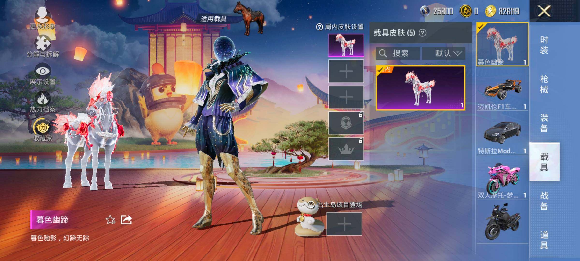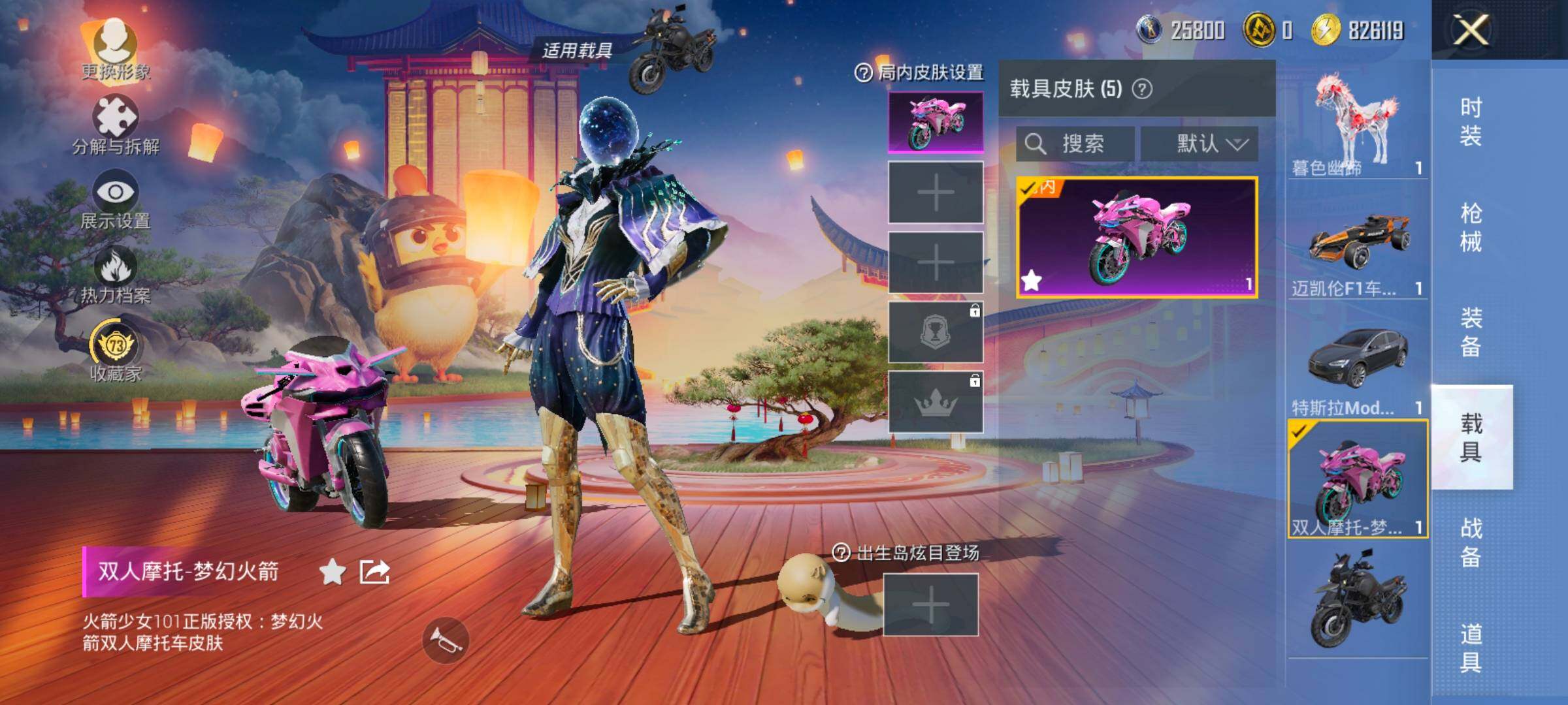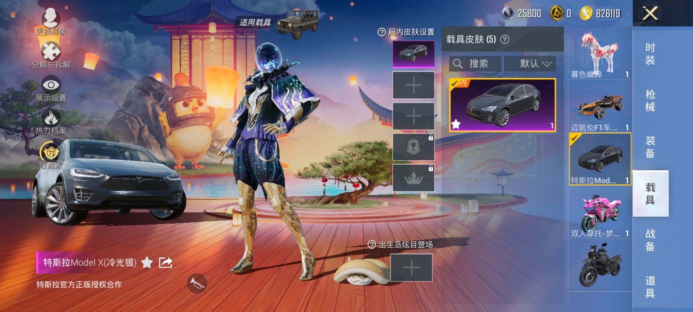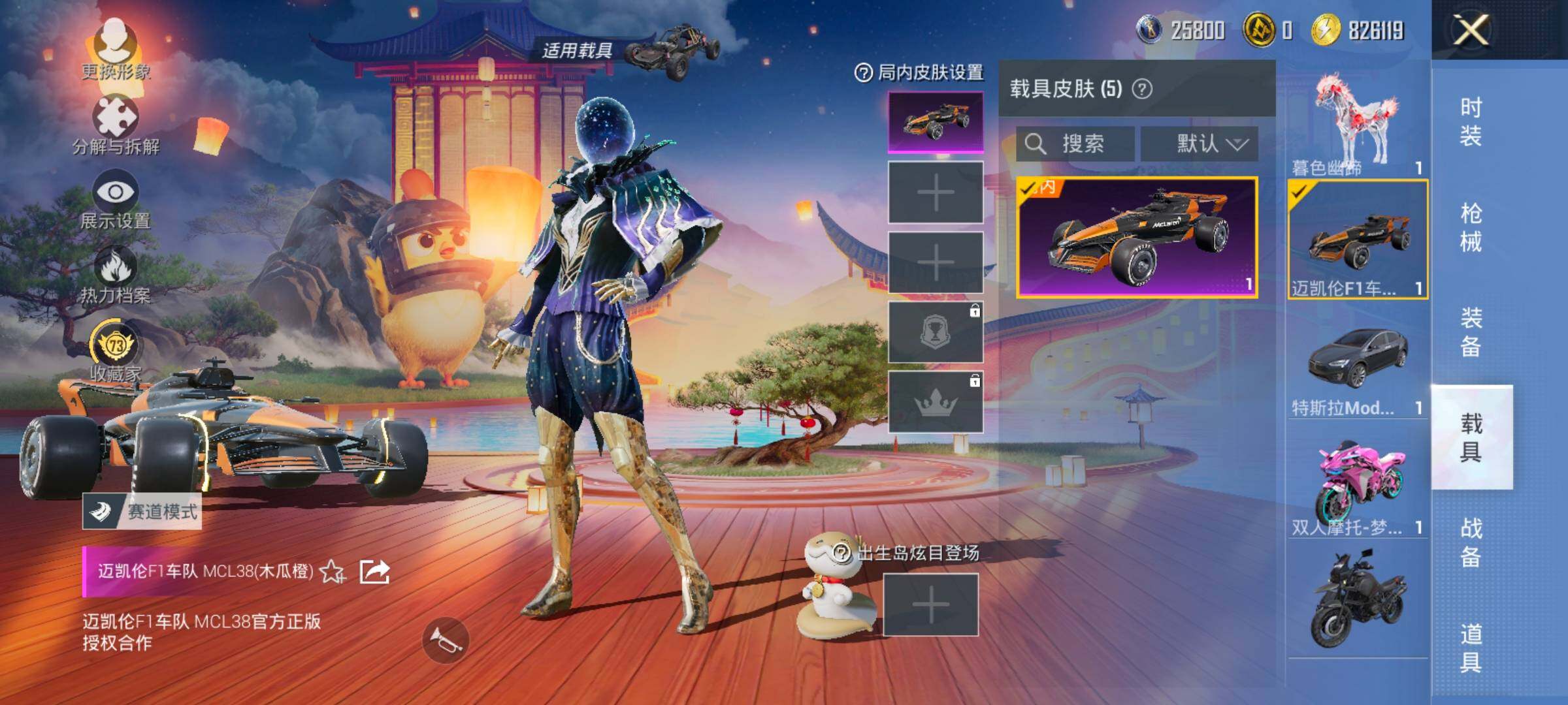【5载具】,暮色幽蹄,迈凯伦F1车队MCL38(木瓜橙),玛莎拉蒂金色,特斯拉X银色,双人摩托梦幻火箭,