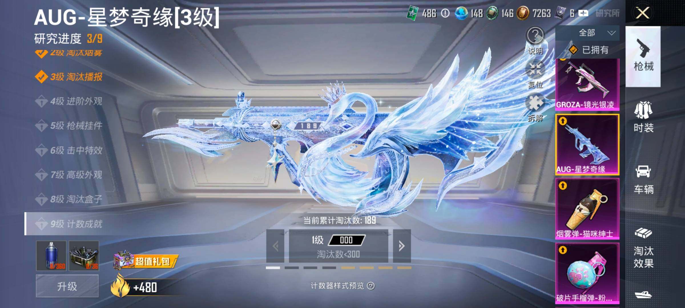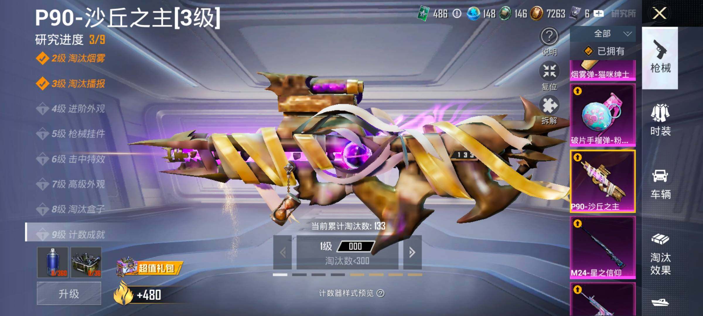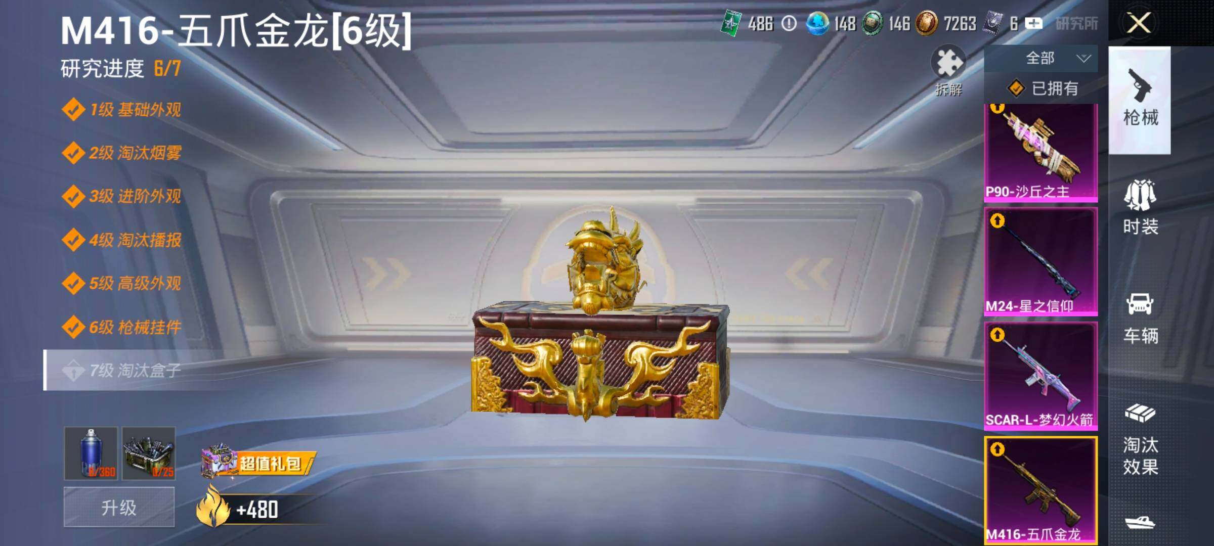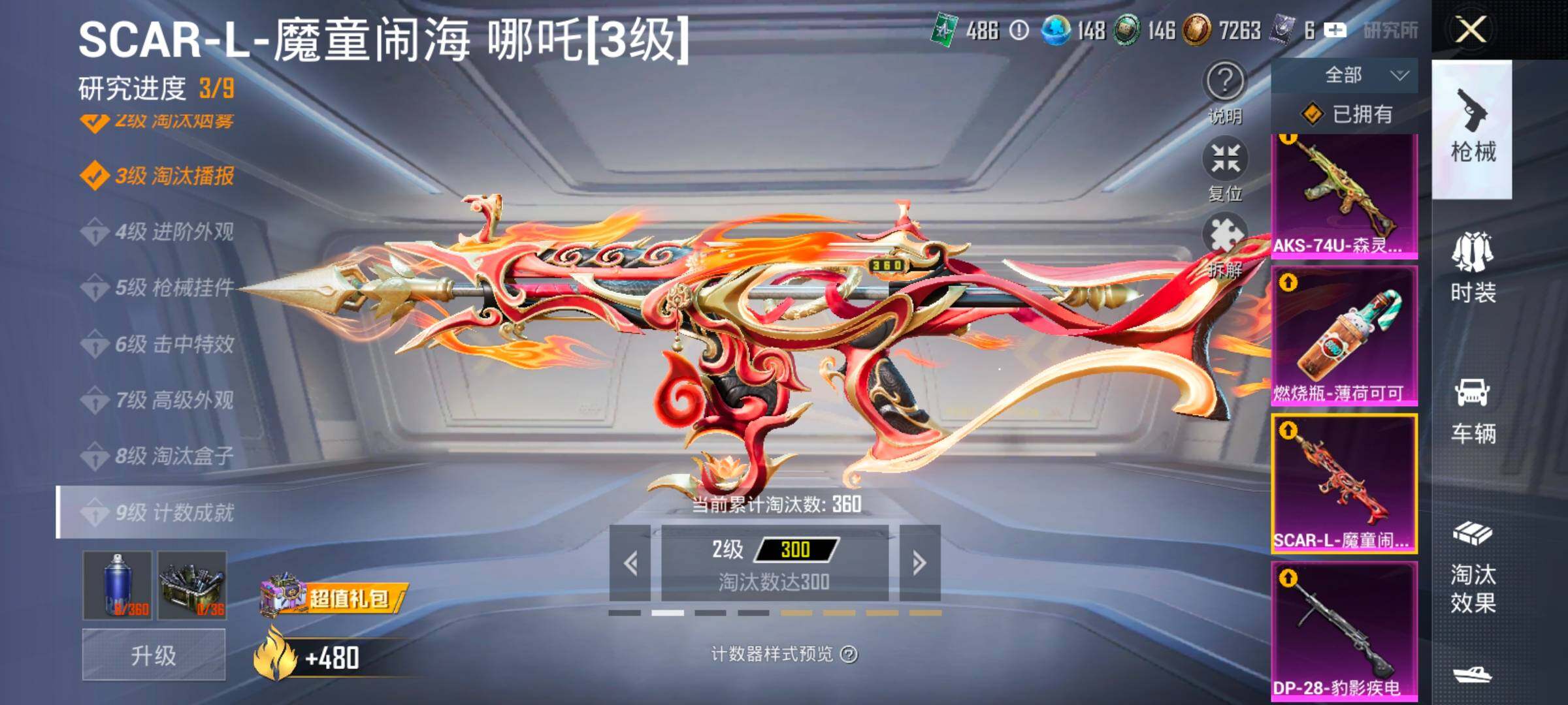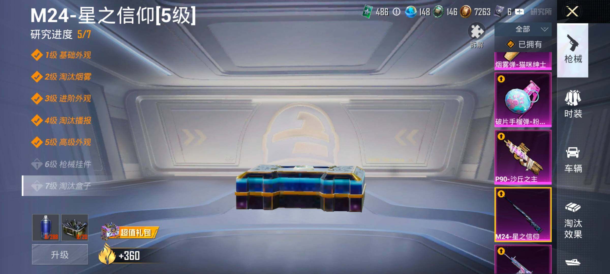 【16特效枪】,SCAR-L-梦幻火箭,(6级),M416-五爪金龙,(6级),SCAR-L-魔童闹海哪吒,(3级),P90-沙丘之主,(3级),M24-星之信仰,(5级),AKS-74U-森灵之息,(4级),Kar98K-巳巳如意,(5级),MG-36-沧焰双生,(5级),DP-28-豹影疾电,(5级),AUG-暖羊咩咩,(5级),AUG-星梦奇缘,(3级),GROZA-镜光银凌,(5级),汤姆逊-热量炸弹,(5级),燃烧瓶-薄荷可可,(6级),破片手榴弹-粉粉猫爪,(6级),烟雾弹-猫咪绅士,(5级),