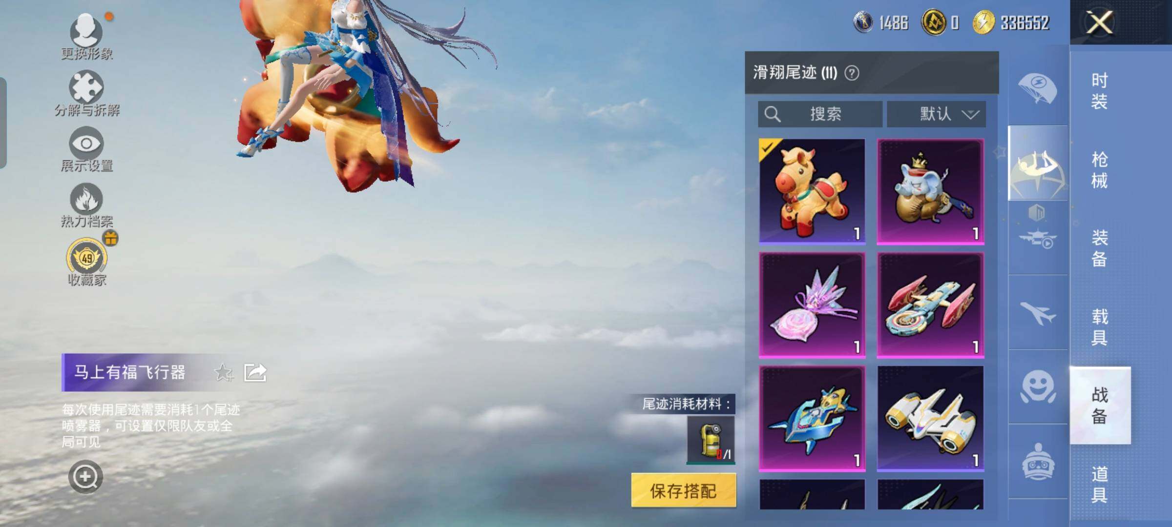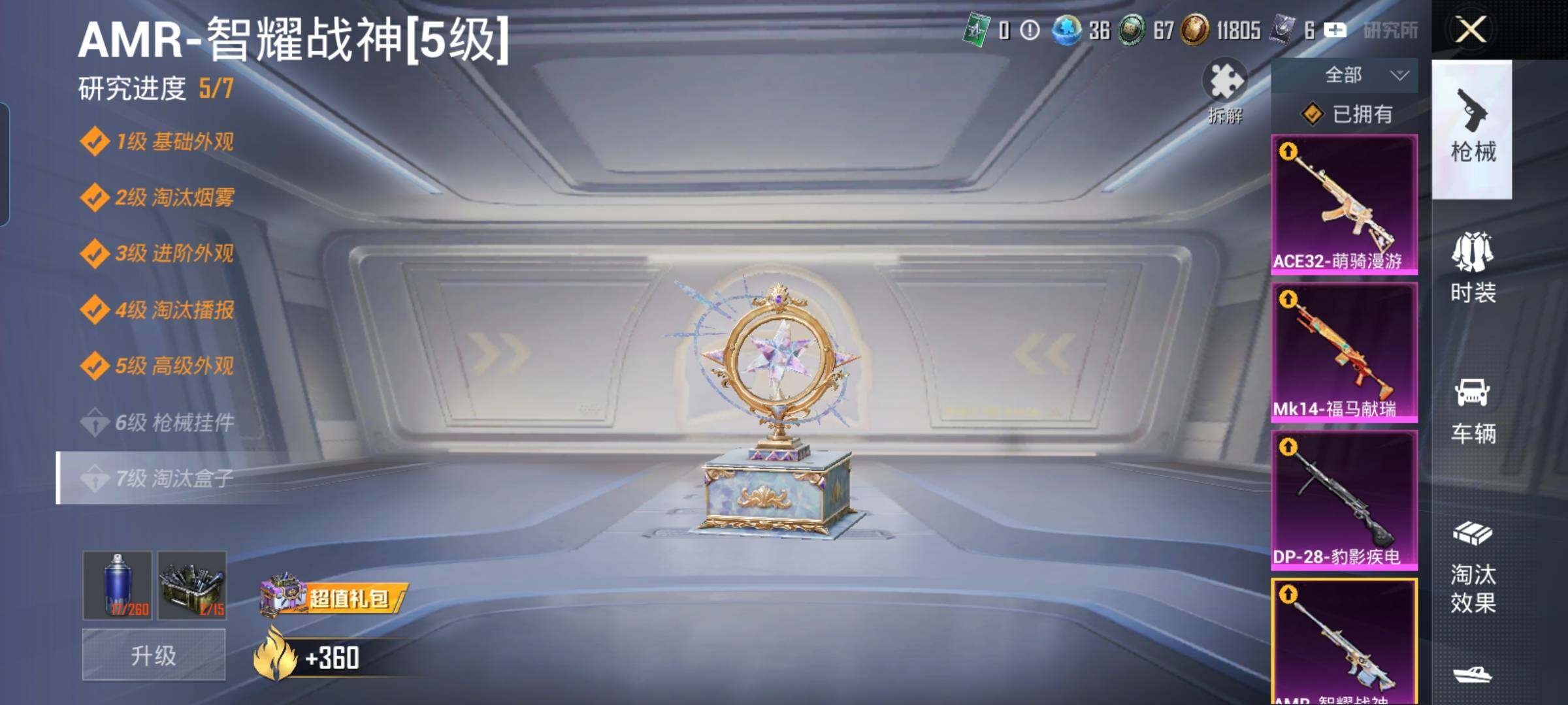 【7特效枪】,M416-电玩时刻,(5级),Kar98K-巳巳如意,(5级),DP-28-豹影疾电,(5级),AMR-智耀战神,(5级),GROZA-镜光银凌,(5级),Mk14-福马献瑞,(5级),ACE32-萌骑漫游,(4级),