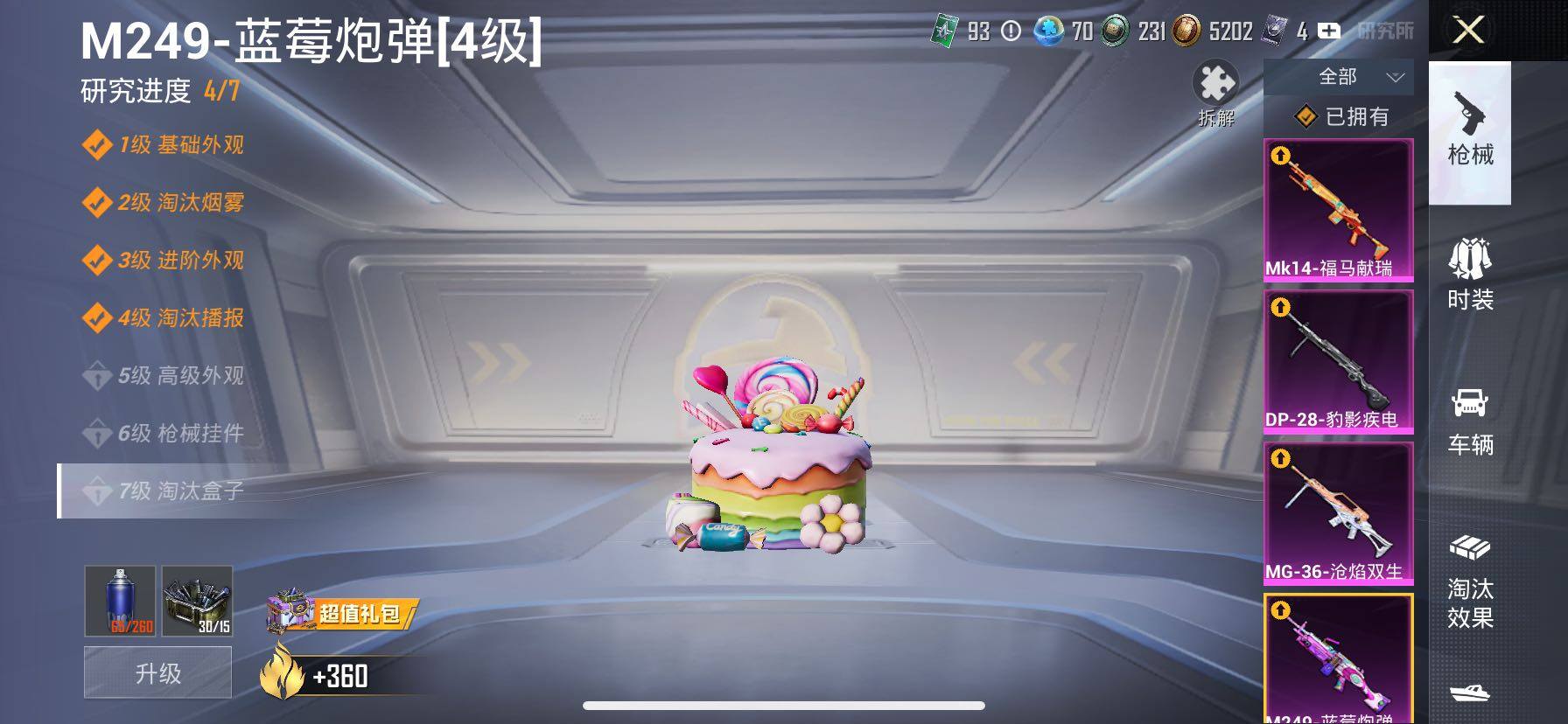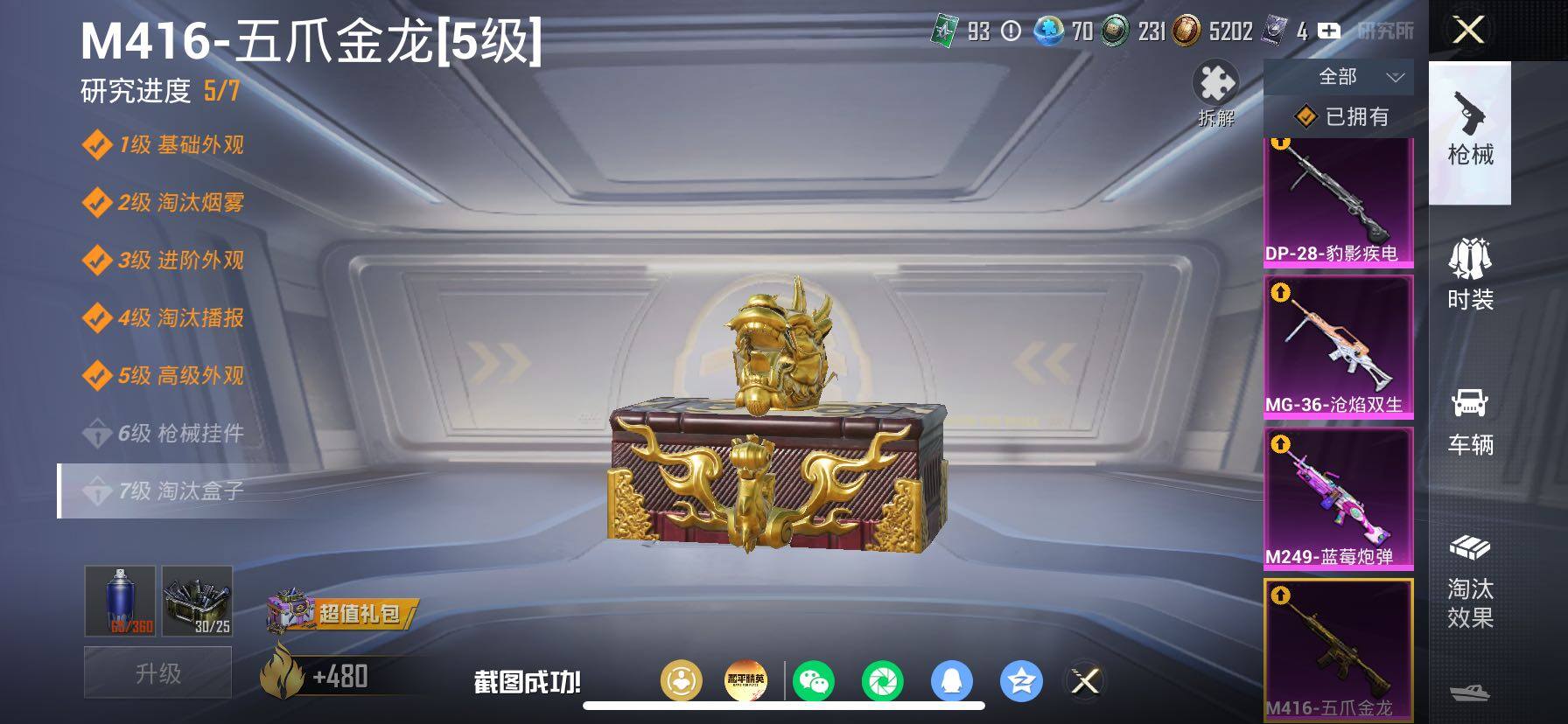 【5特效枪】,M416-五爪金龙,(5级),MG-36-沧焰双生,(5级),DP-28-豹影疾电,(5级),M249-蓝莓炮弹,(4级),Mk14-福马献瑞,(4级),
