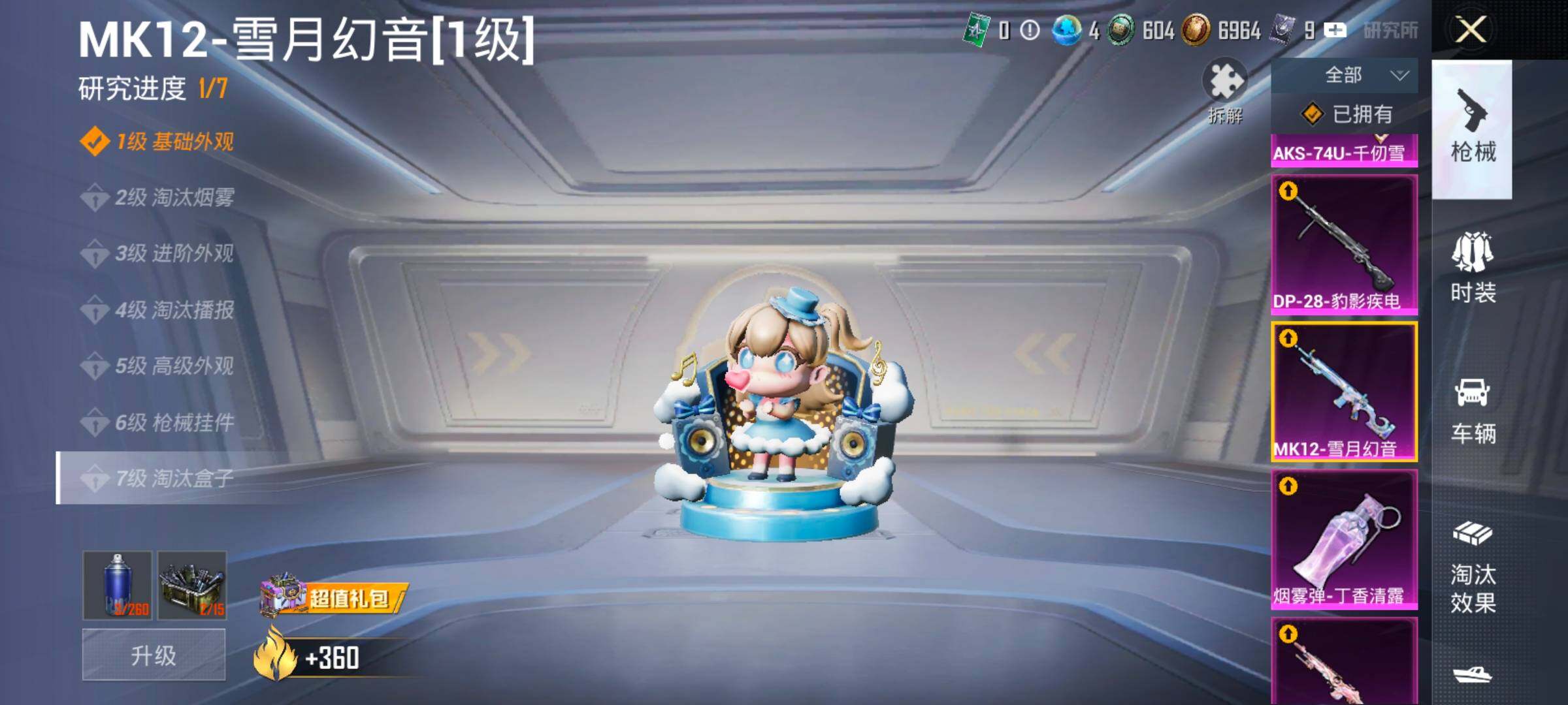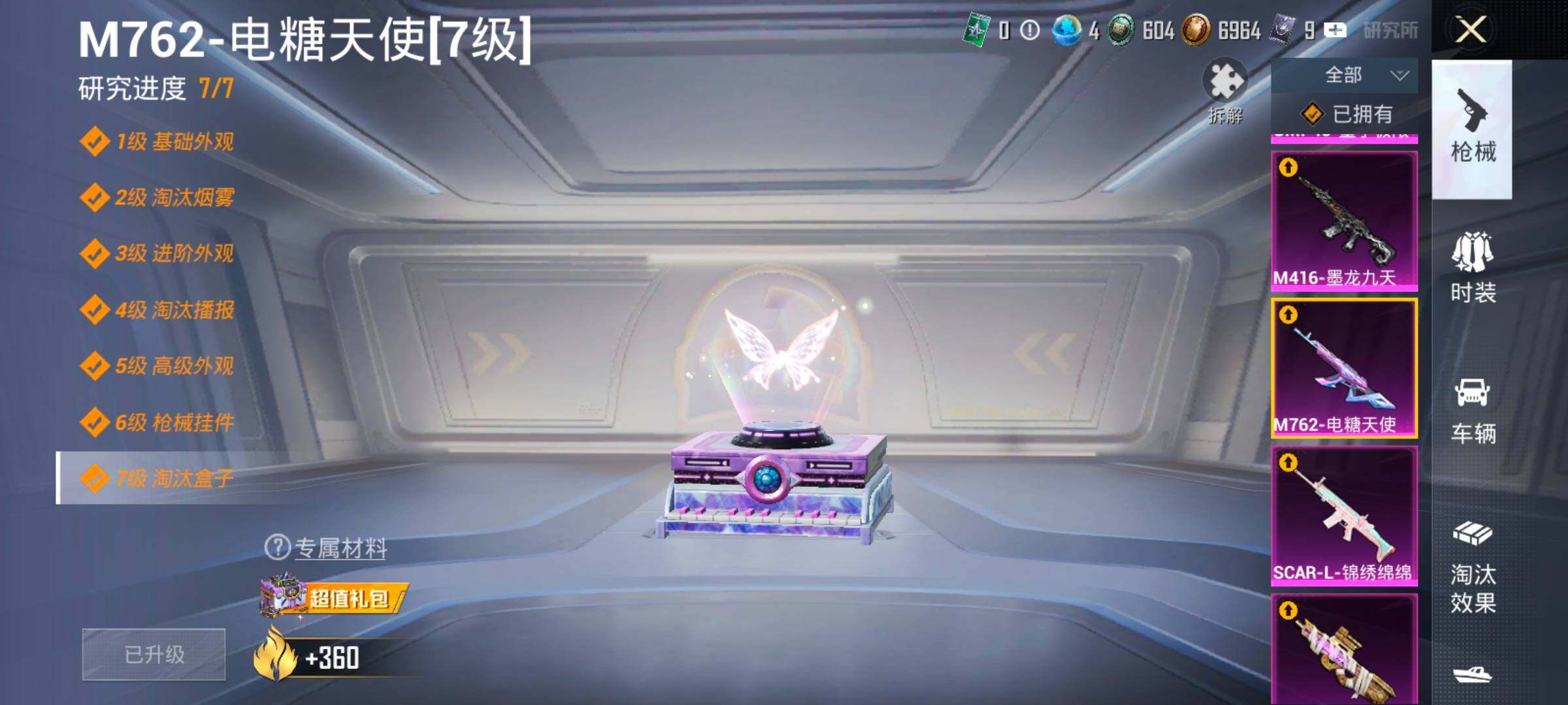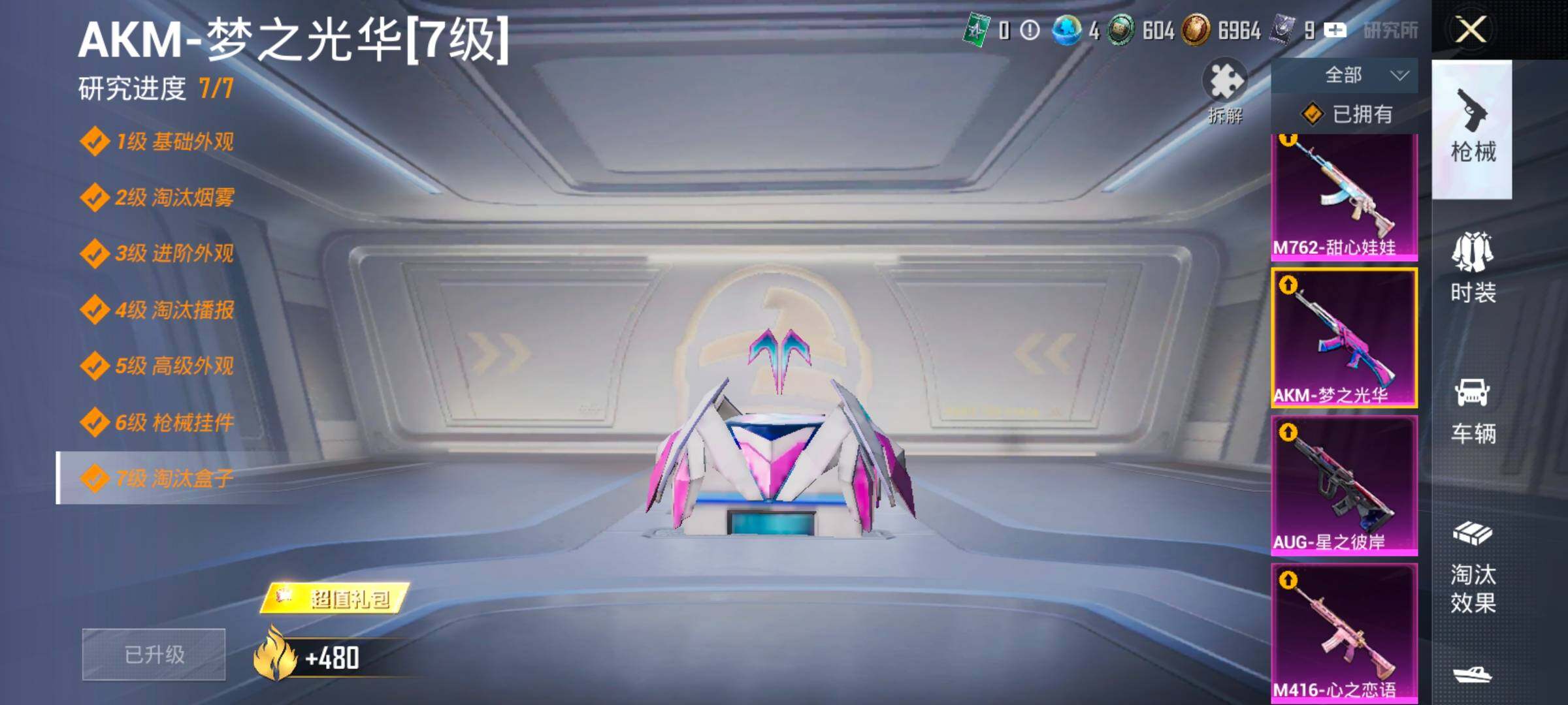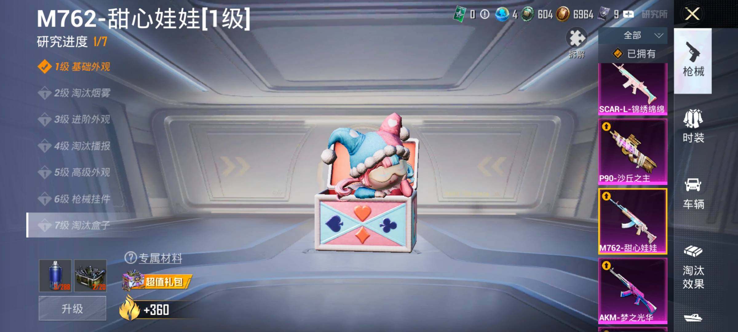 【17特效枪】,SCAR-L-锦绣绵绵,(5级),M416-心之恋语,(5级),M416-墨龙九天,(1级),M416-女娲灵识,(6级),P90-沙丘之主,(3级),Kar98K-巳巳如意,(5级),M762-电糖天使,(7级),DP-28-豹影疾电,(5级),AUG-许七安,(1级),M762-甜心娃娃,(1级),UMP45-量子极限,(5级),Mk14-盛世惊鸿,(3级),MK12-雪月幻音,(1级),AUG-星之彼岸,(7级),AKM-梦之光华,(7级),烟雾弹-丁香清露,(5级),AKS-74U-千仞雪(5级)