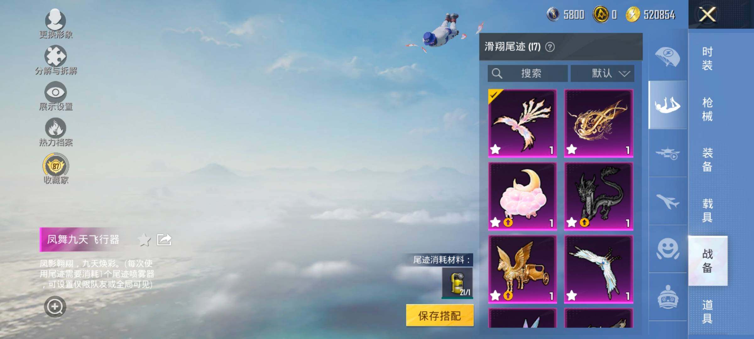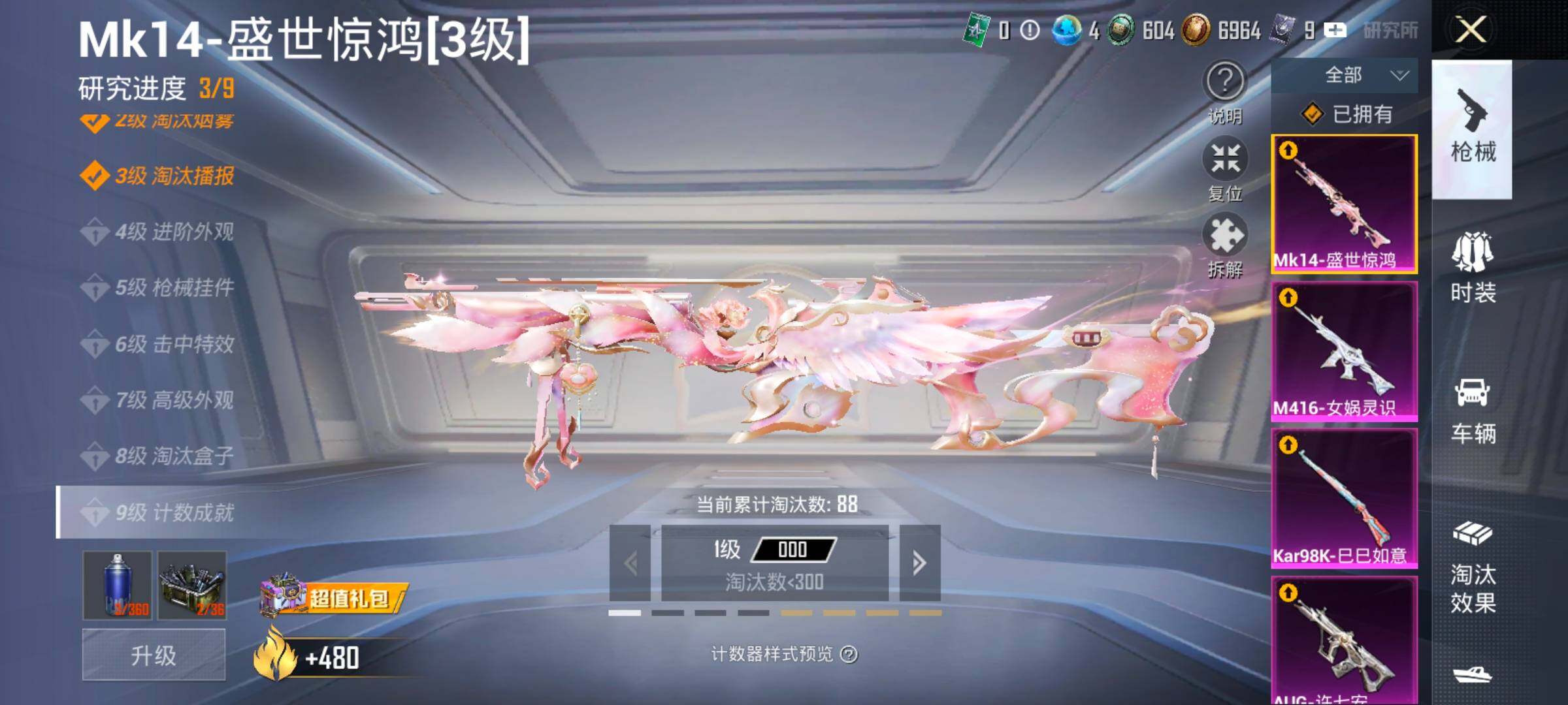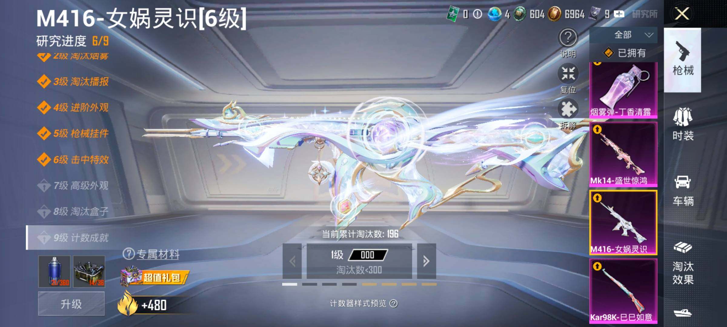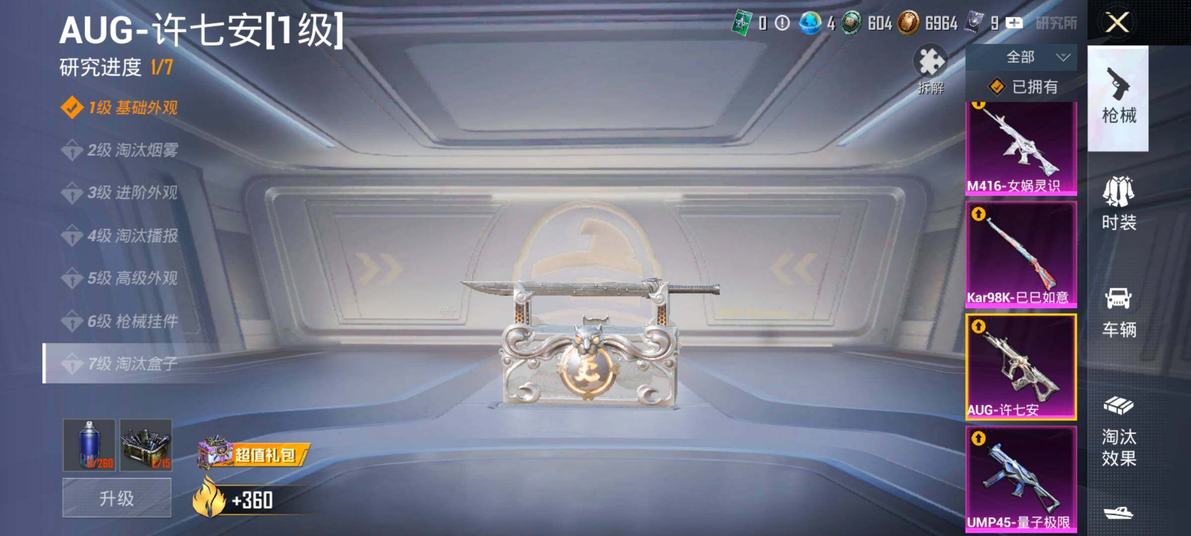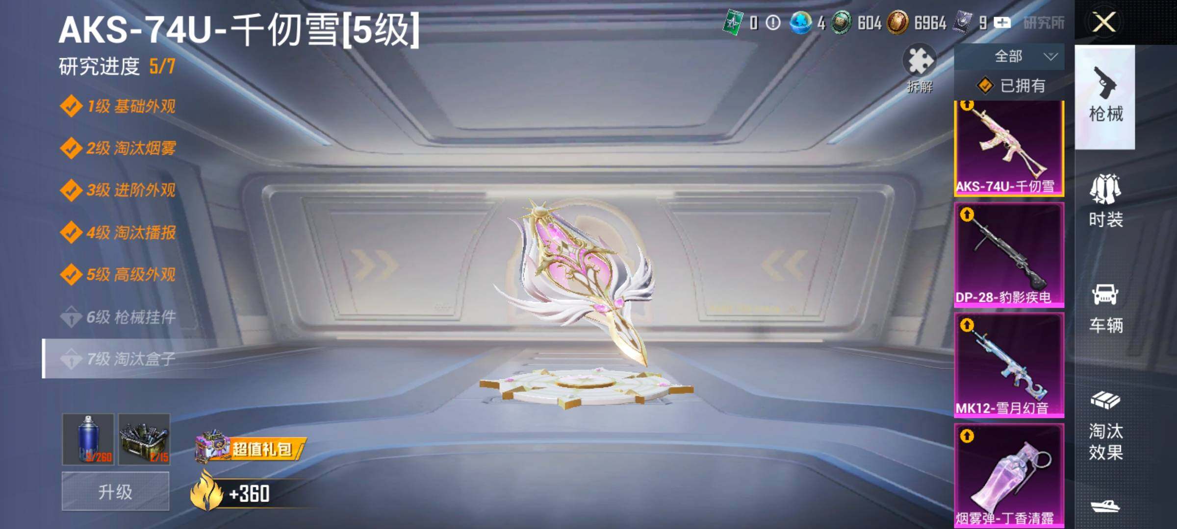 【17特效枪】,SCAR-L-锦绣绵绵,(5级),M416-心之恋语,(5级),M416-墨龙九天,(1级),M416-女娲灵识,(6级),P90-沙丘之主,(3级),Kar98K-巳巳如意,(5级),M762-电糖天使,(7级),DP-28-豹影疾电,(5级),AUG-许七安,(1级),M762-甜心娃娃,(1级),UMP45-量子极限,(5级),Mk14-盛世惊鸿,(3级),MK12-雪月幻音,(1级),AUG-星之彼岸,(7级),AKM-梦之光华,(7级),烟雾弹-丁香清露,(5级),AKS-74U-千仞雪(5级)