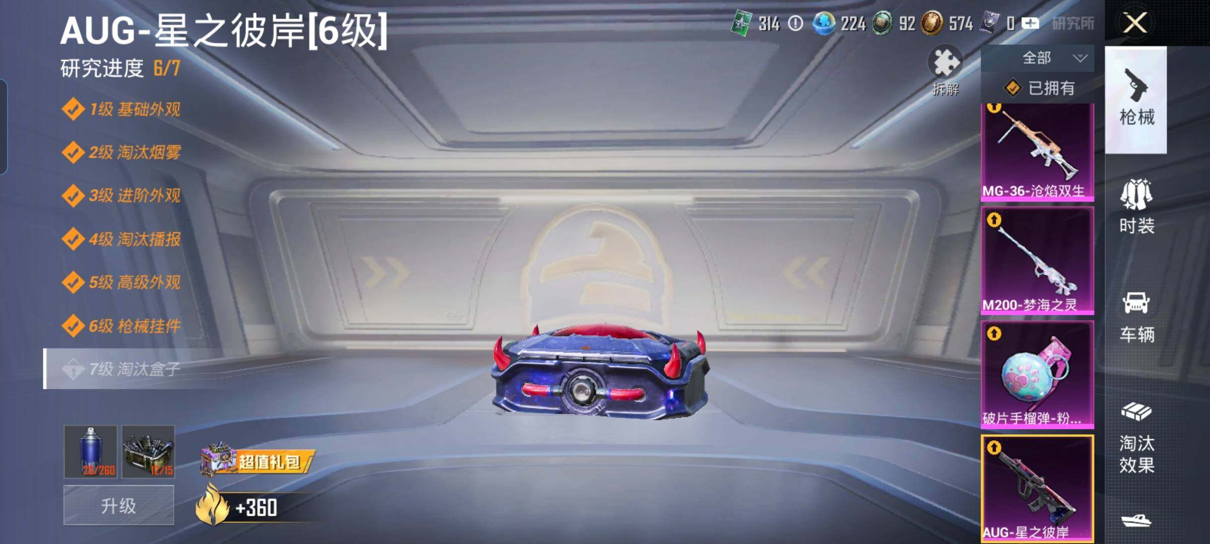 【9特效枪】,AKS-74U-森灵之息,(5级),MG-36-沧焰双生,(5级),DP-28-豹影疾电,(5级),M200-梦海之灵,(3级),AUG-星之彼岸,(6级),Mk14-福马献瑞,(5级),AA12-G-萌骑幻想,(3级),燃烧瓶-薄荷可可,(6级),破片手榴弹-粉粉猫爪,(7级),