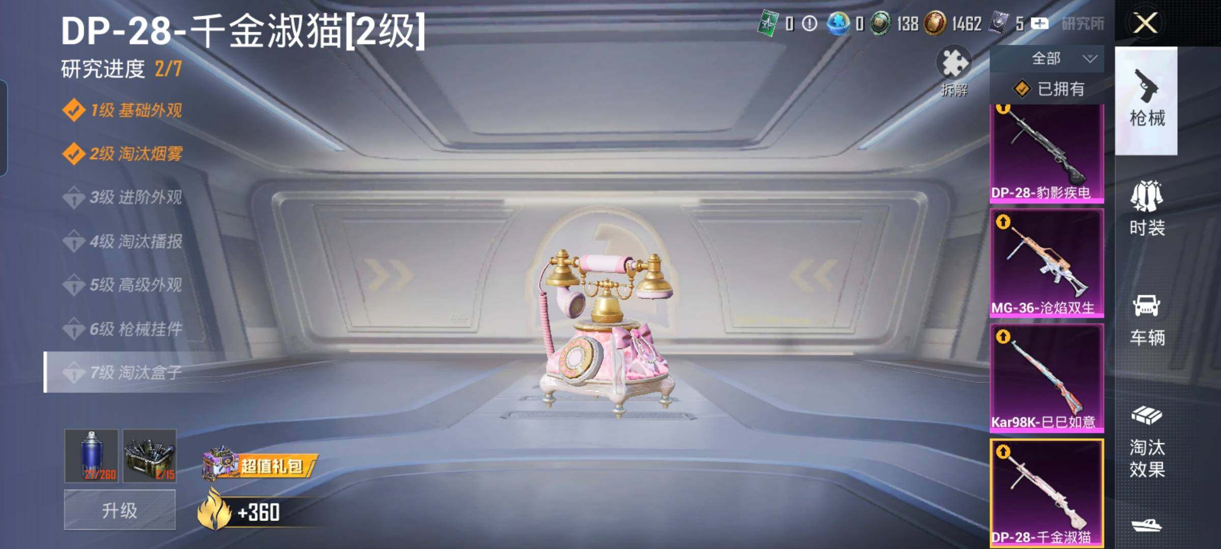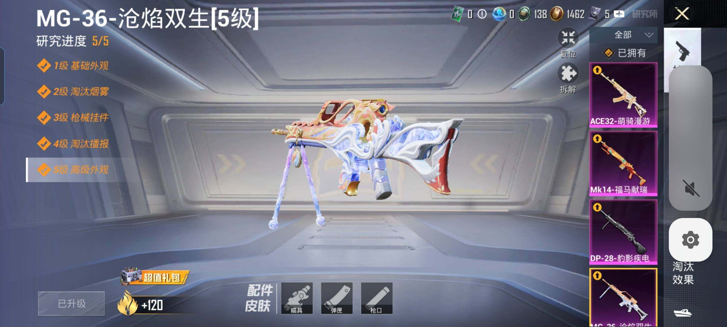 【6特效枪】,Kar98K-巳巳如意,(5级),MG-36-沧焰双生,(5级),DP-28-千金淑猫,(2级),DP-28-豹影疾电,(5级),Mk14-福马献瑞,(5级),ACE32-萌骑漫游,(3级),